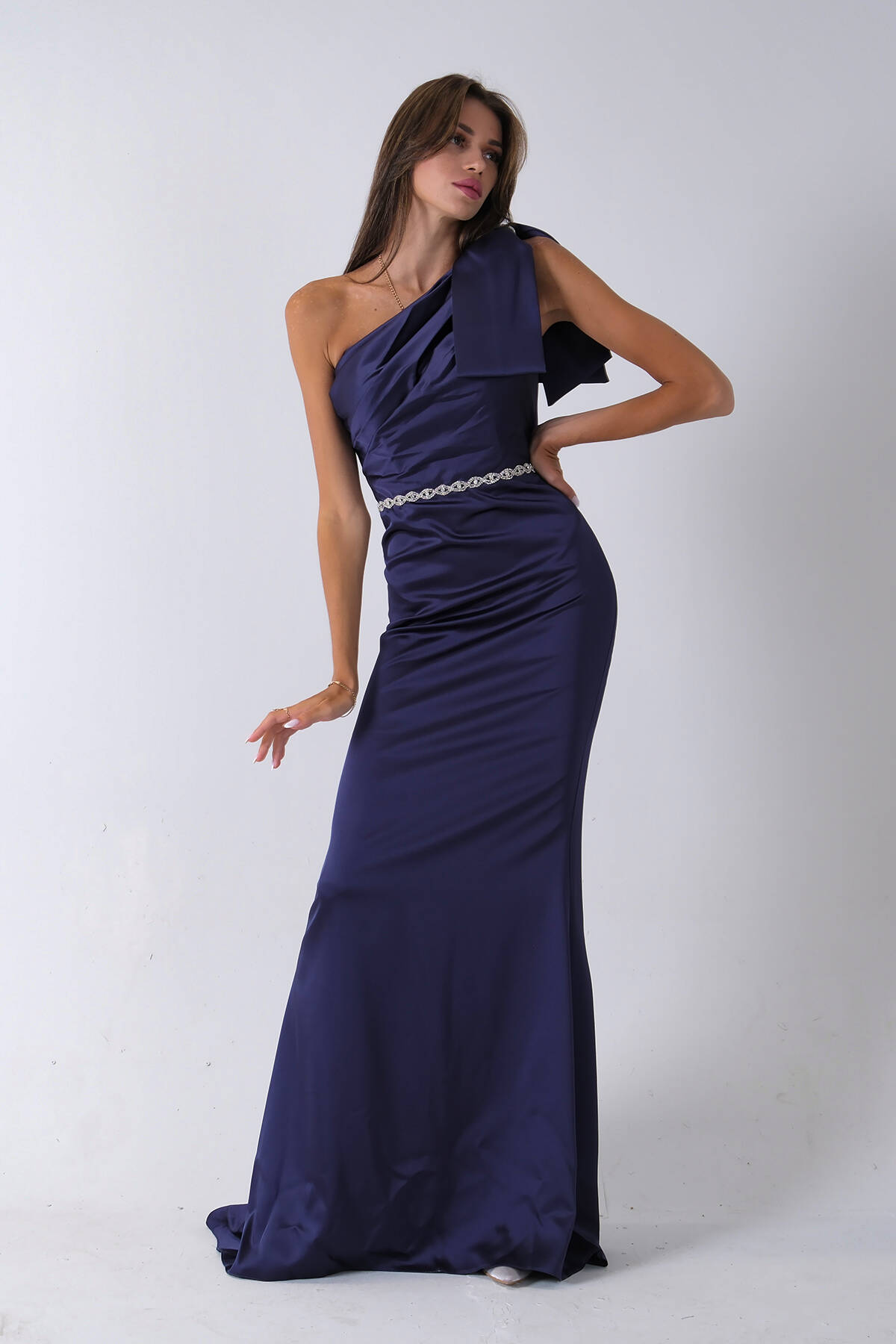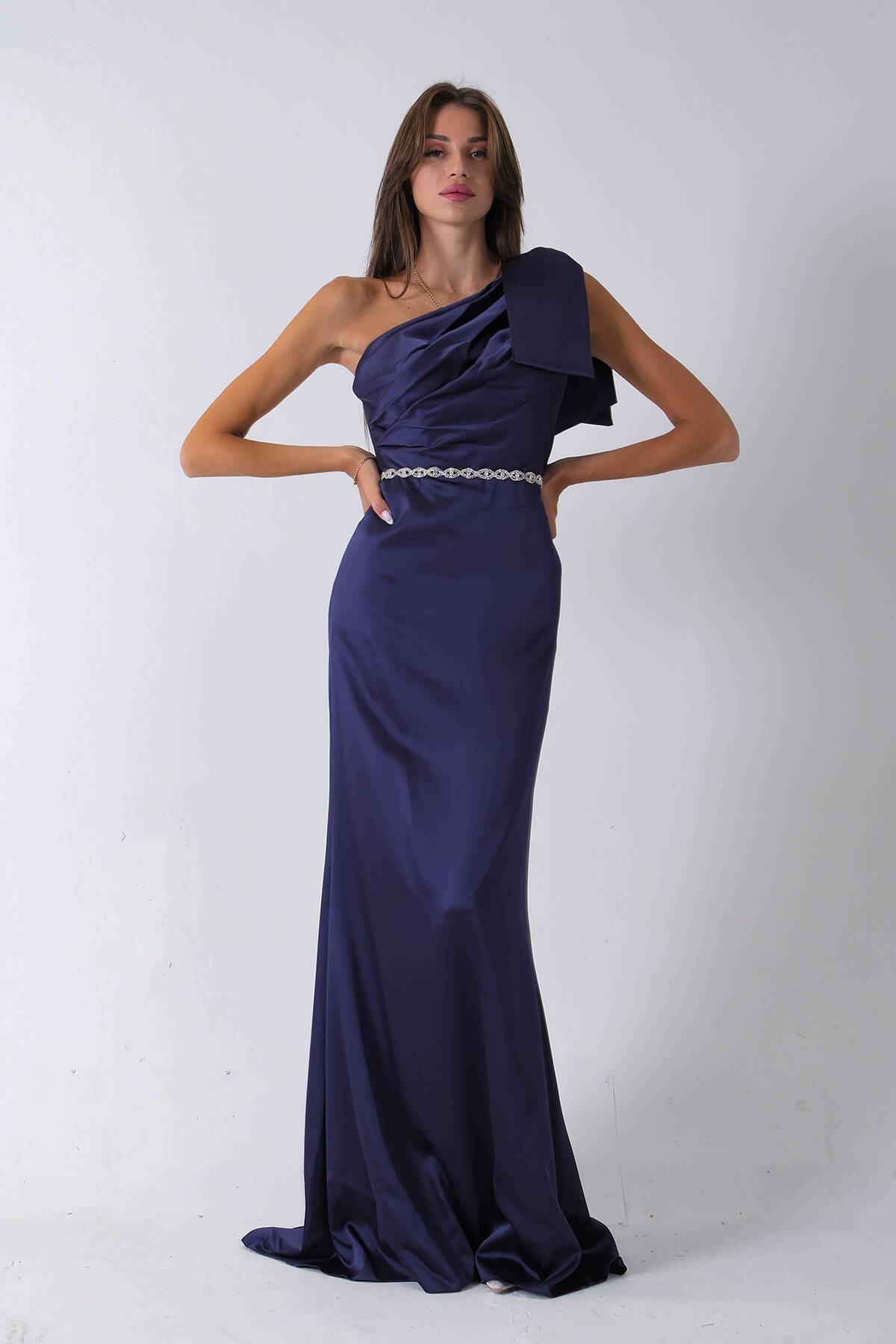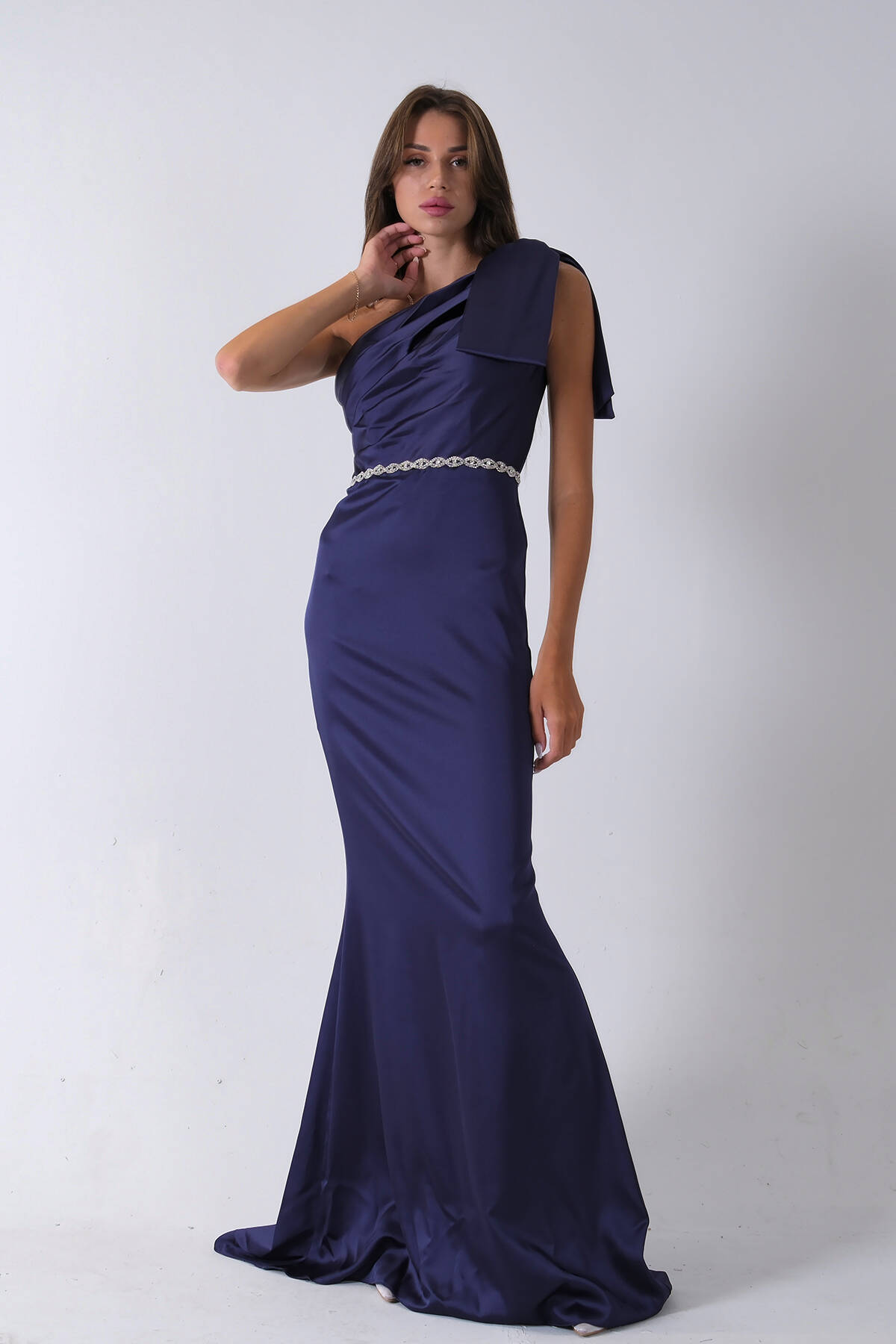 Lacivert Tek Omuz Drapeli Taş Detaylı Abiye 0801009.02