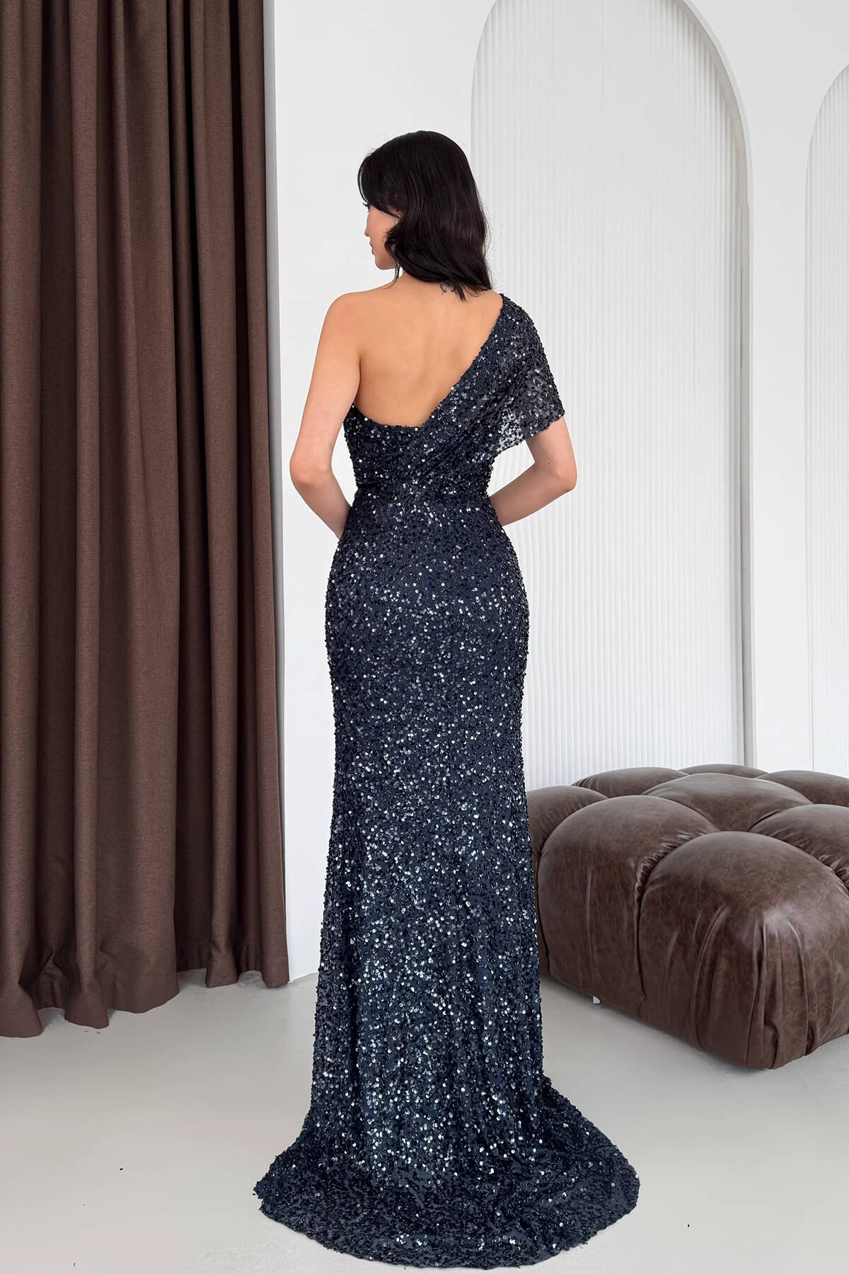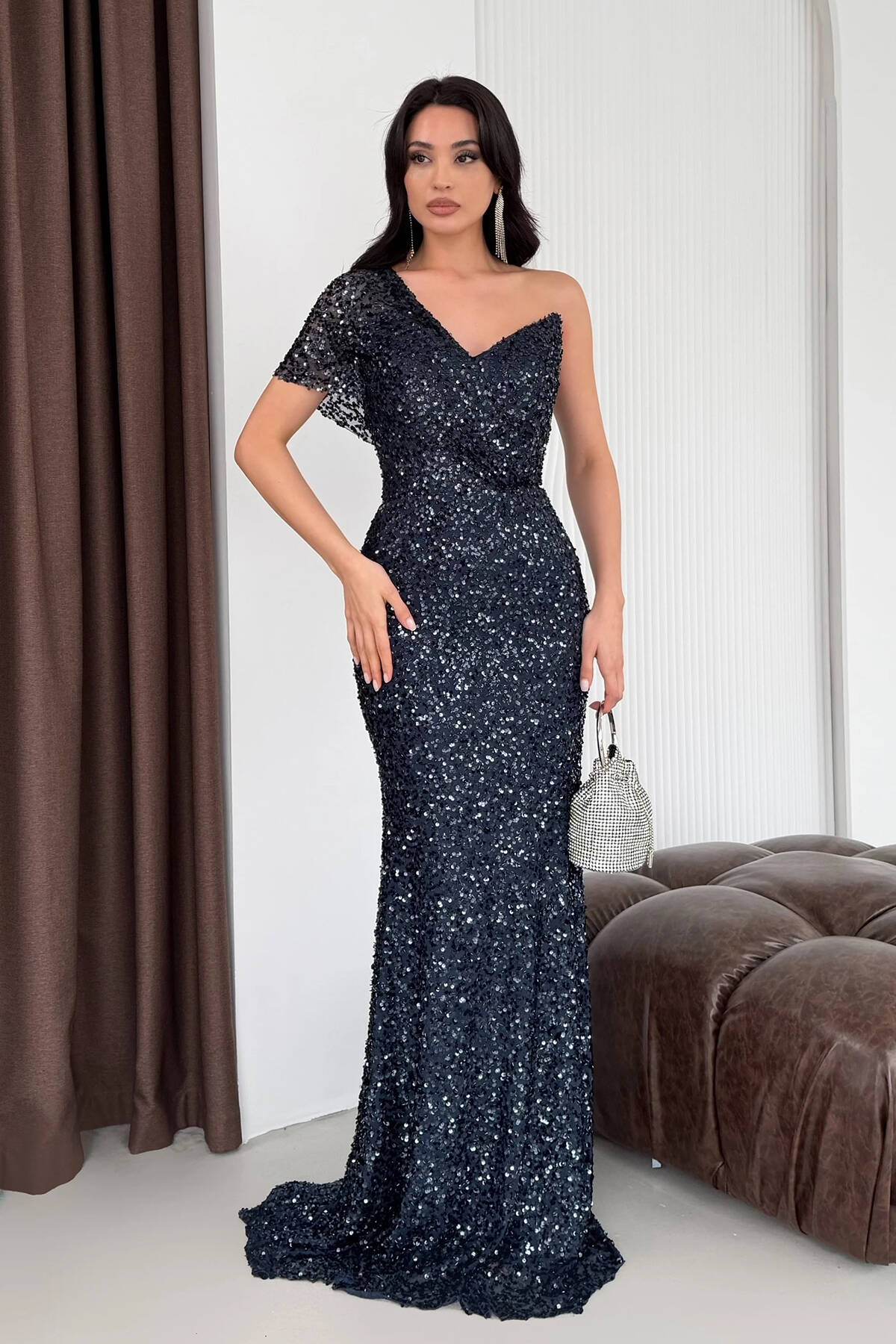 Lacivert Tek Omuz Pul Payetli Straplez Abiye 0801130.02