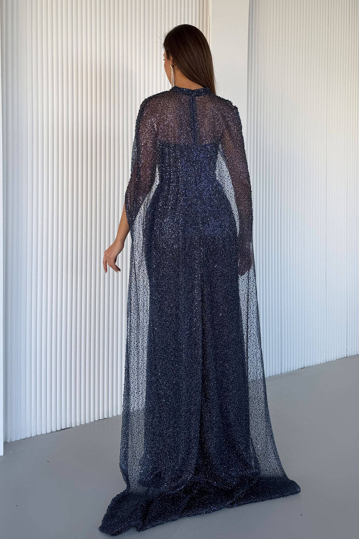 Lacivert V Yaka Payetli Işıltılı Uzun Abiye 9705495.02