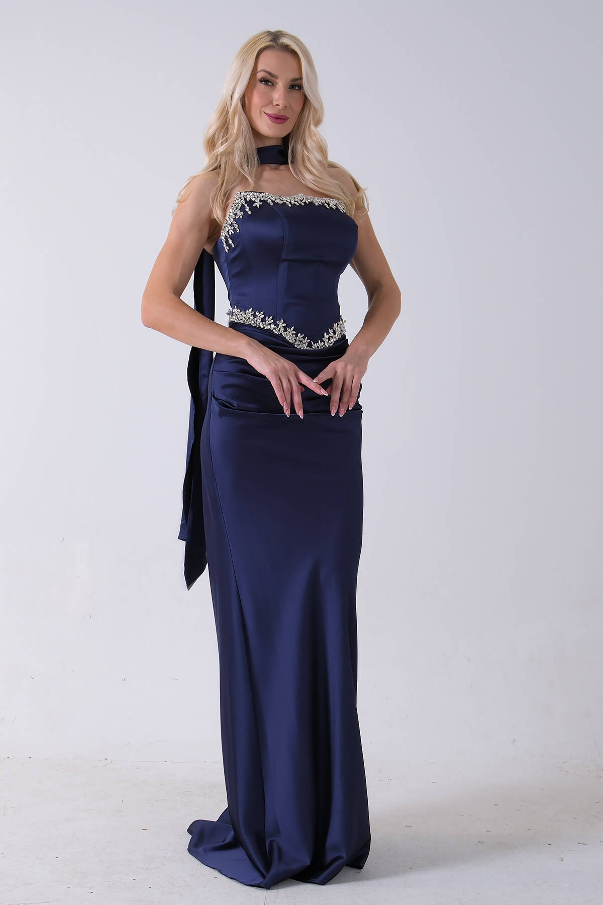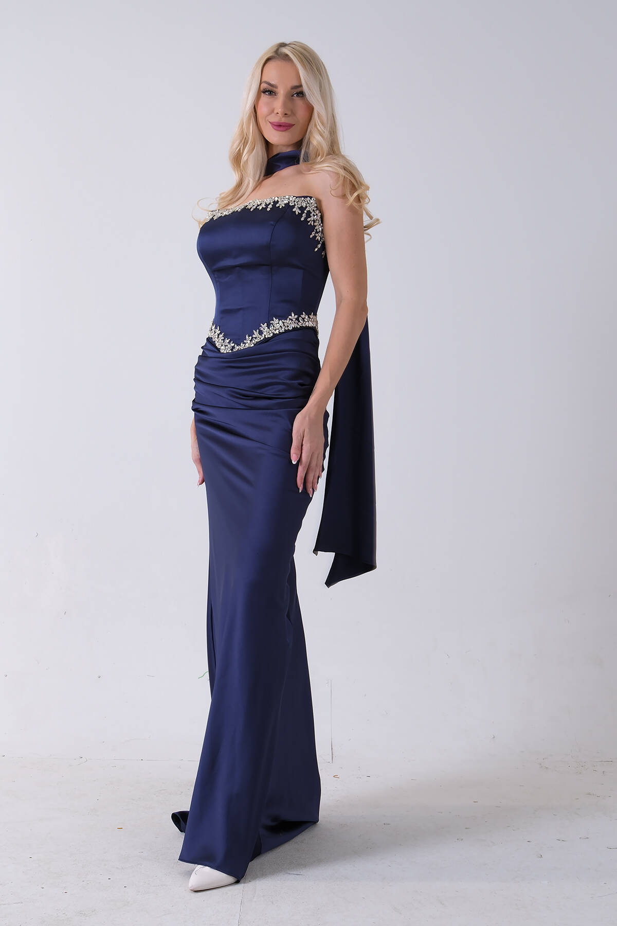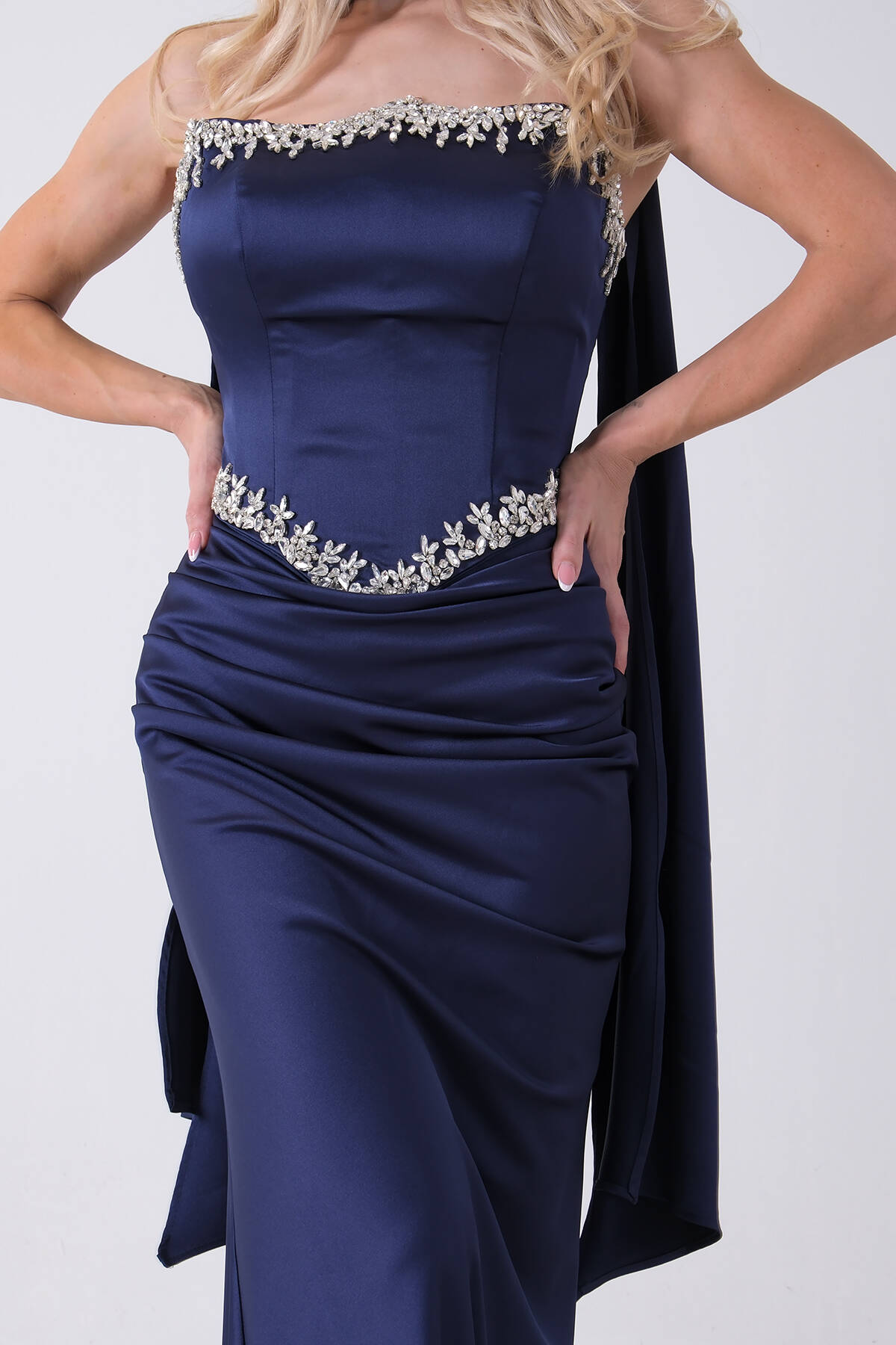 Lacivert Üzeri Taş İşleme Detaylı Kuşak Bağlama Detaylı Straplez Abiye 08011801.02