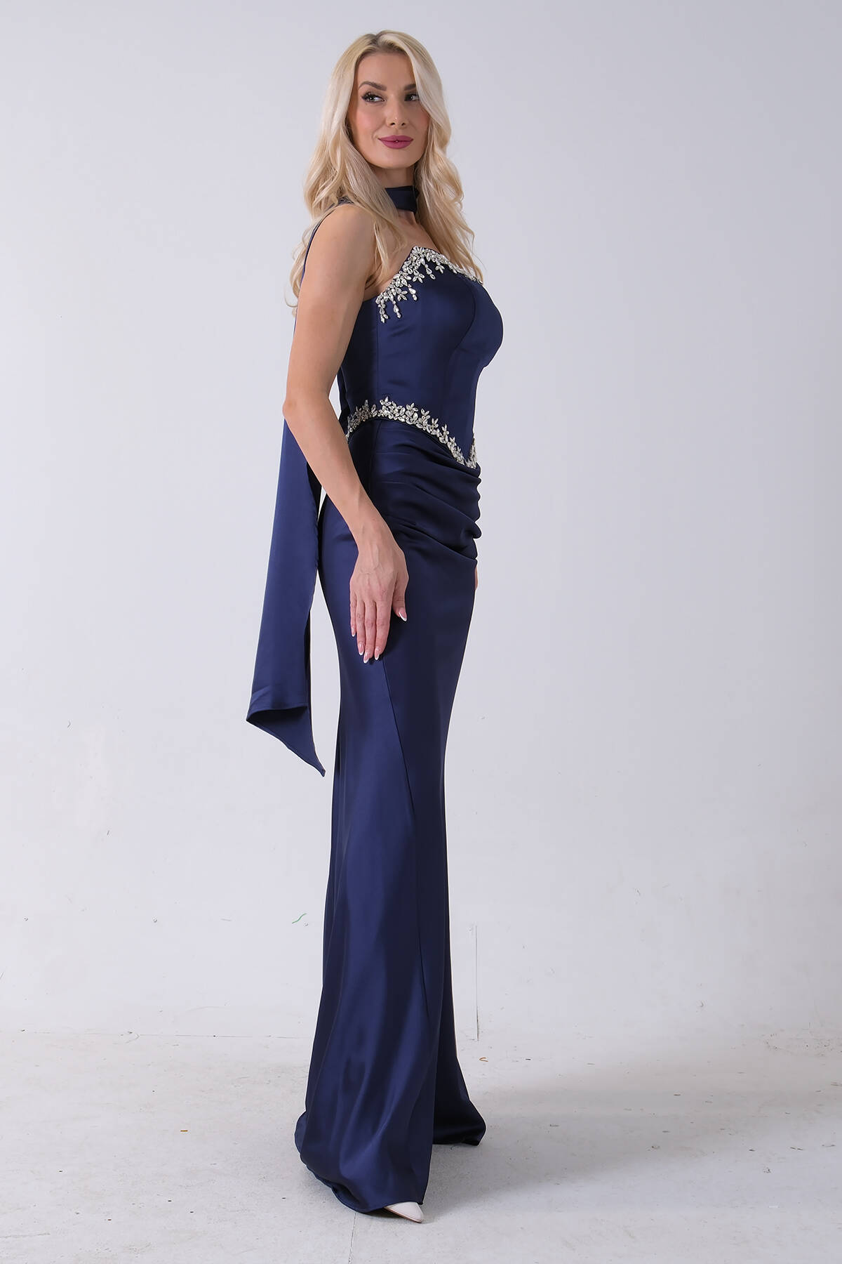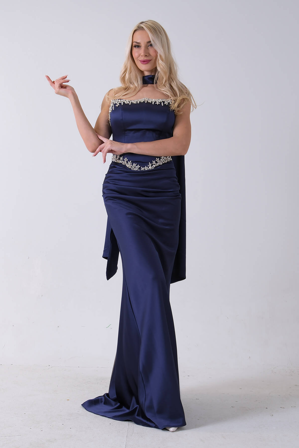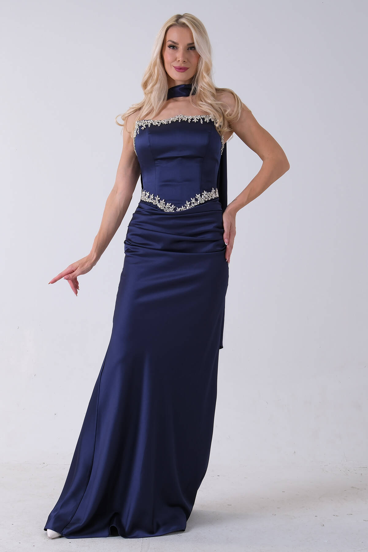 Lacivert Üzeri Taş İşleme Detaylı Kuşak Bağlama Detaylı Straplez Abiye 08011801.02