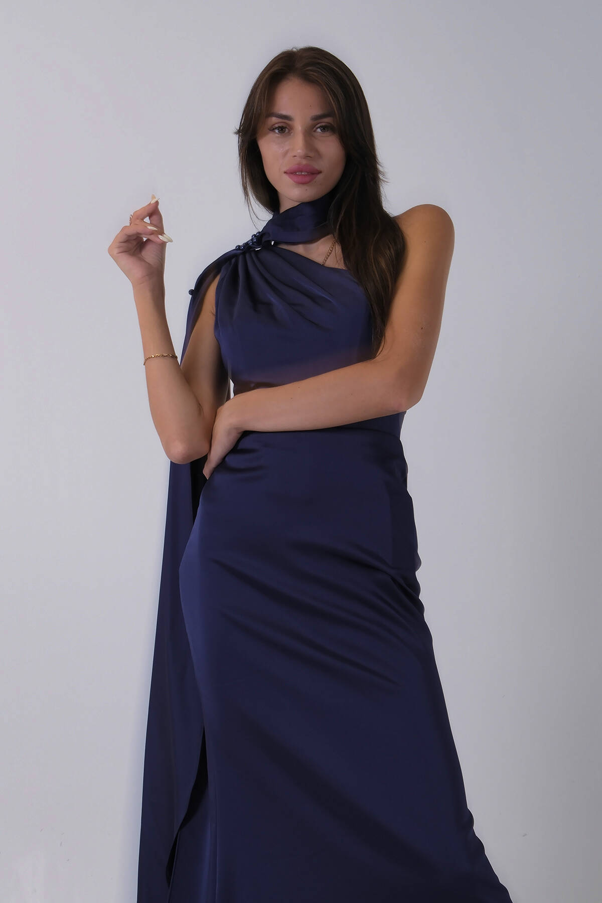 Lacivert Yaka Kuşak Detaylı Tek Omuz Abiye 0801099.02