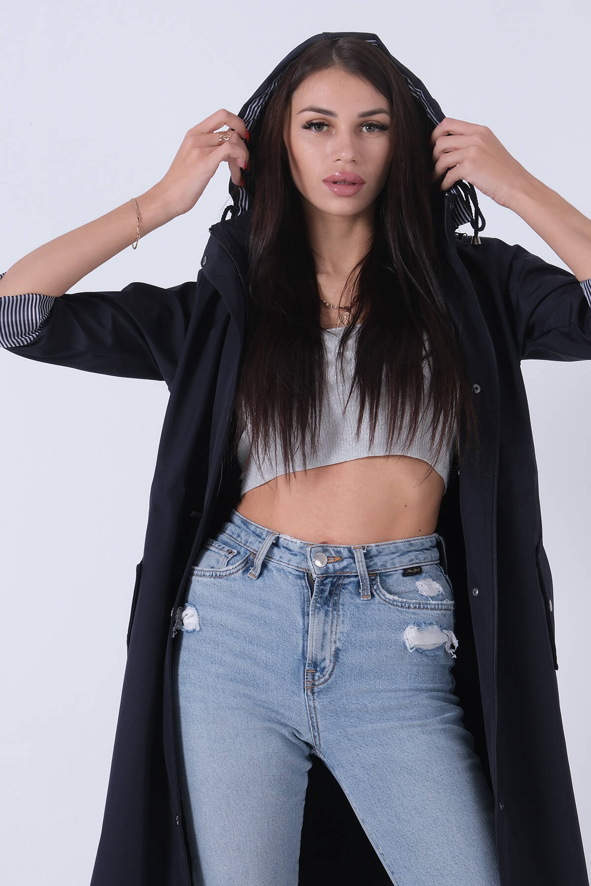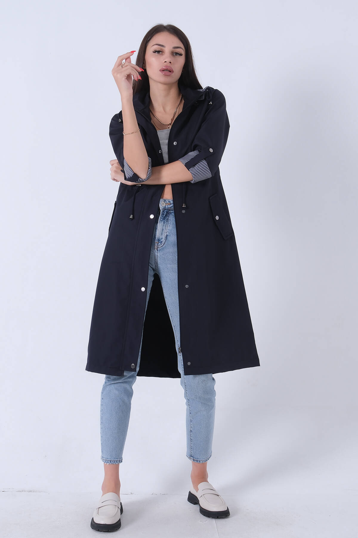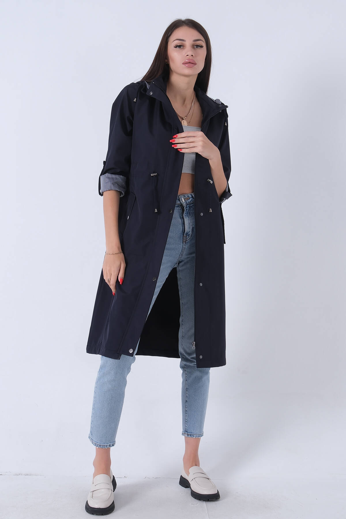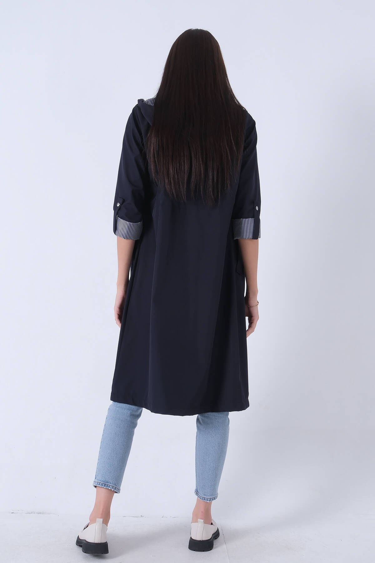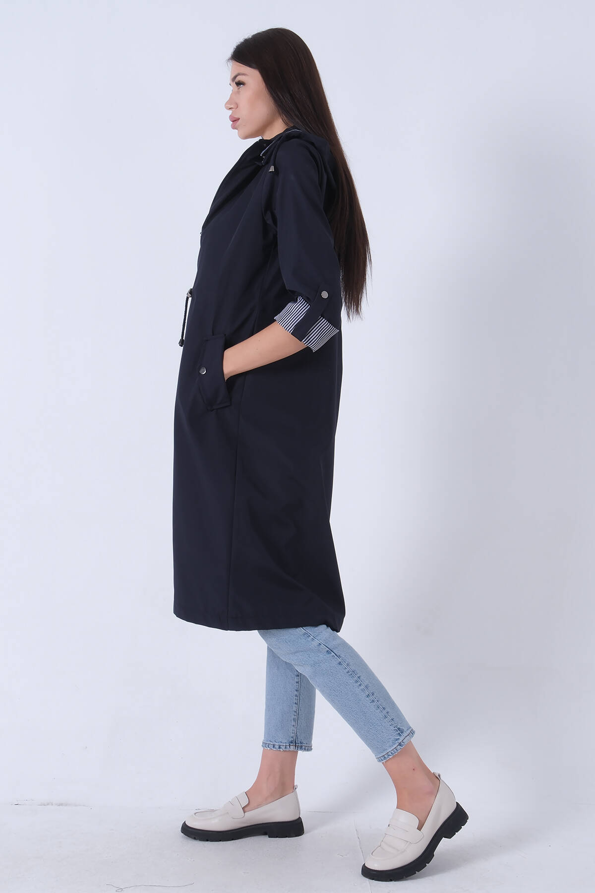 Lacivert Yandan Cepli Bel Bağlama Detaylı Kapüşonlu Trençkot 44510343.02