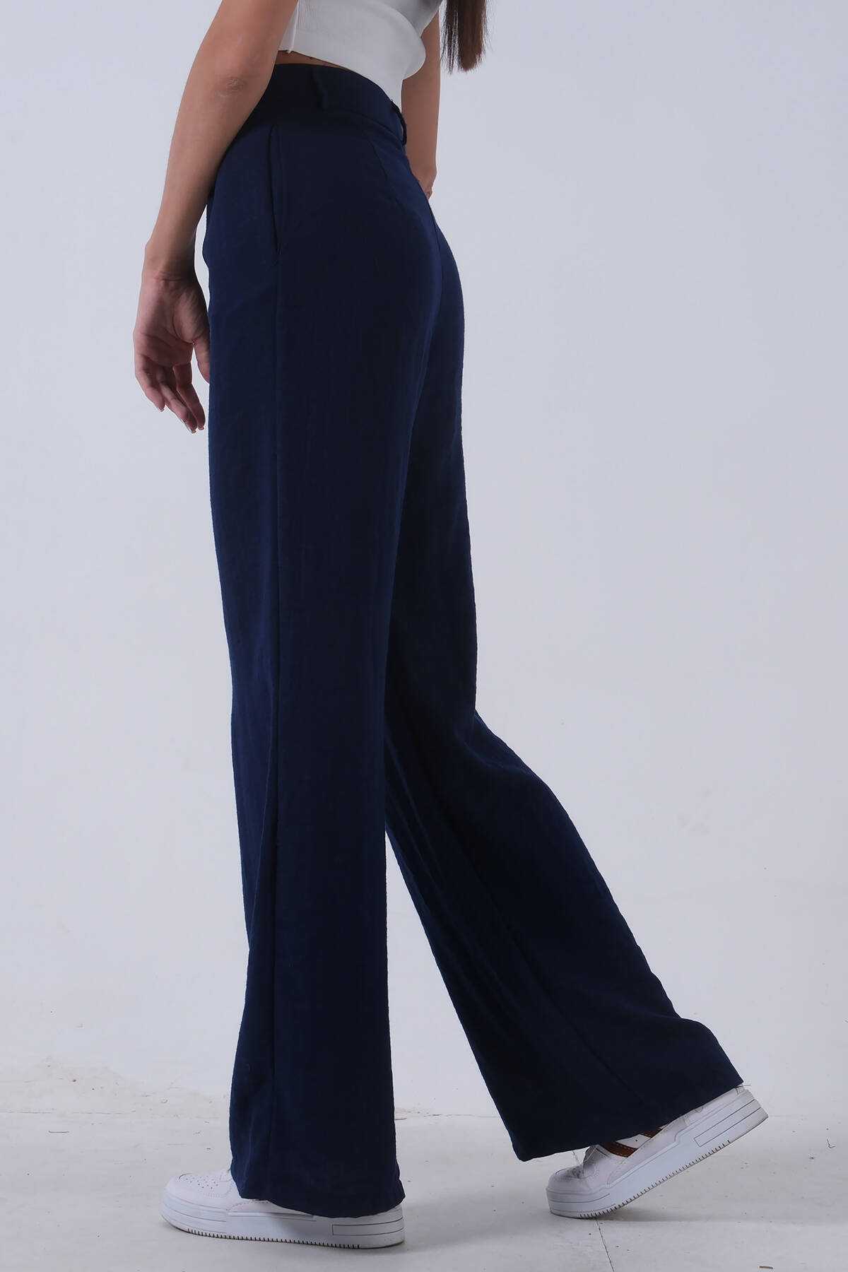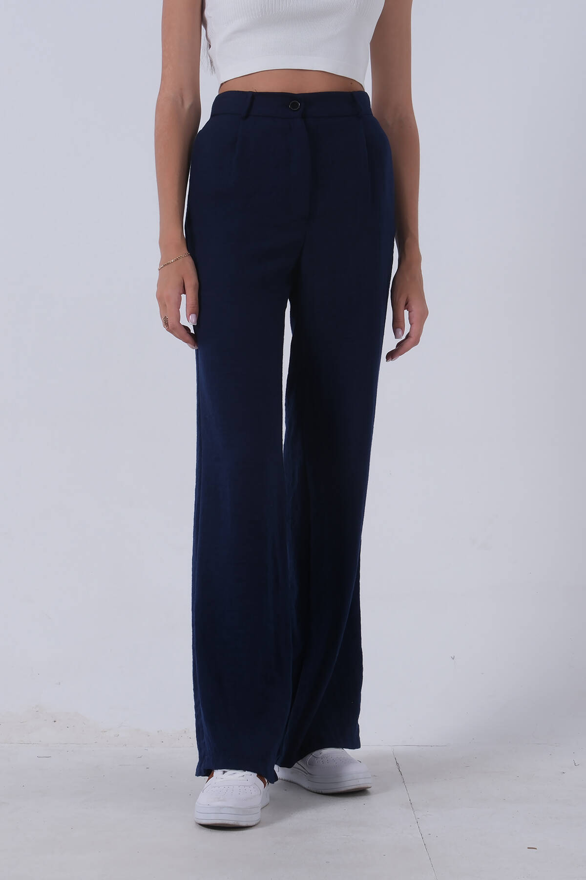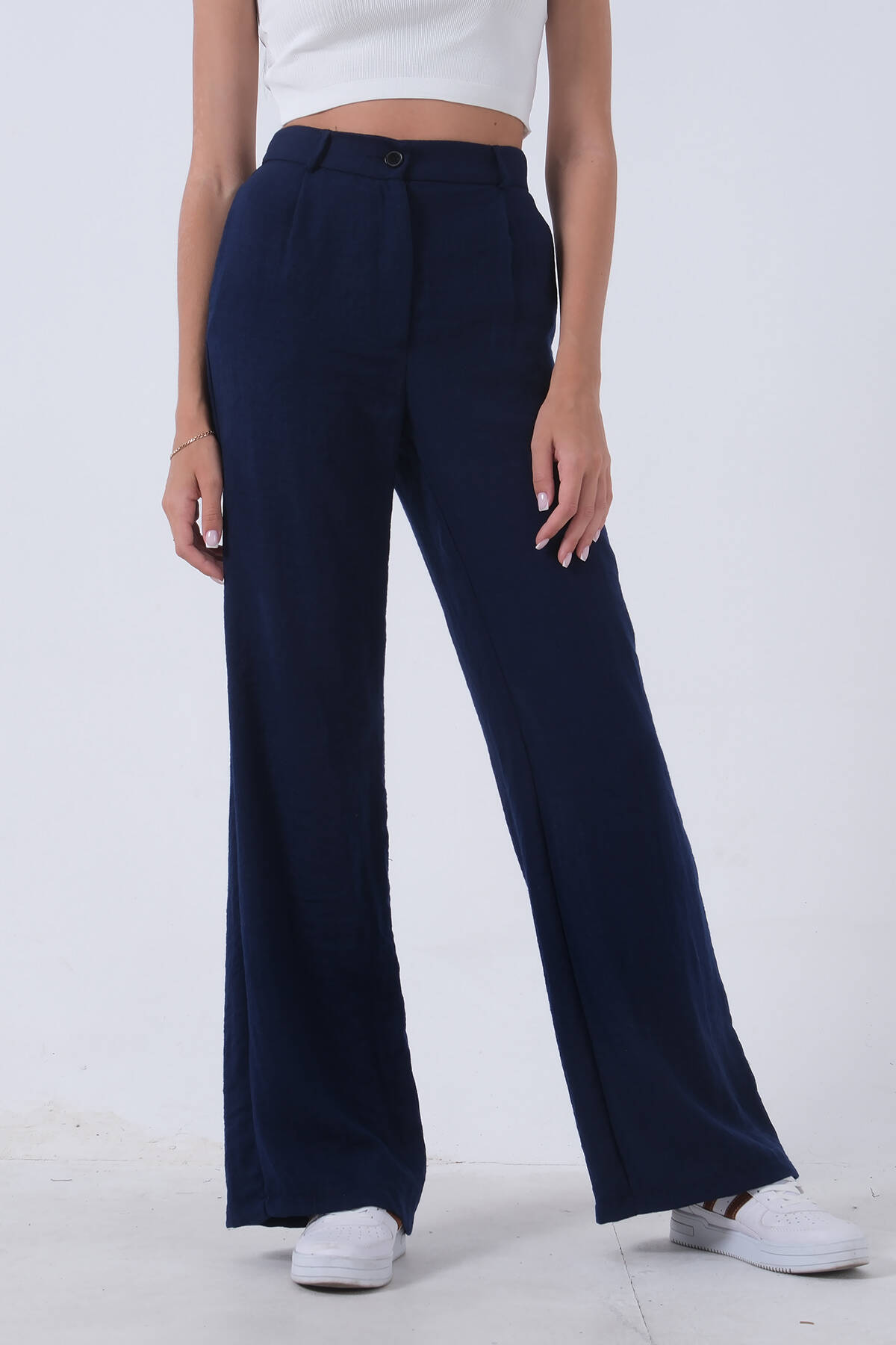Lacivert Yüksek Bel Bol Paça Keten Pantolon 01020661.02