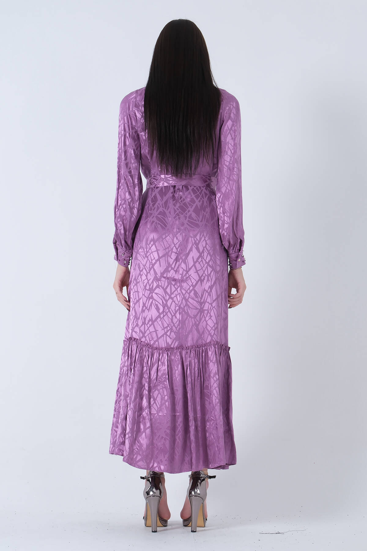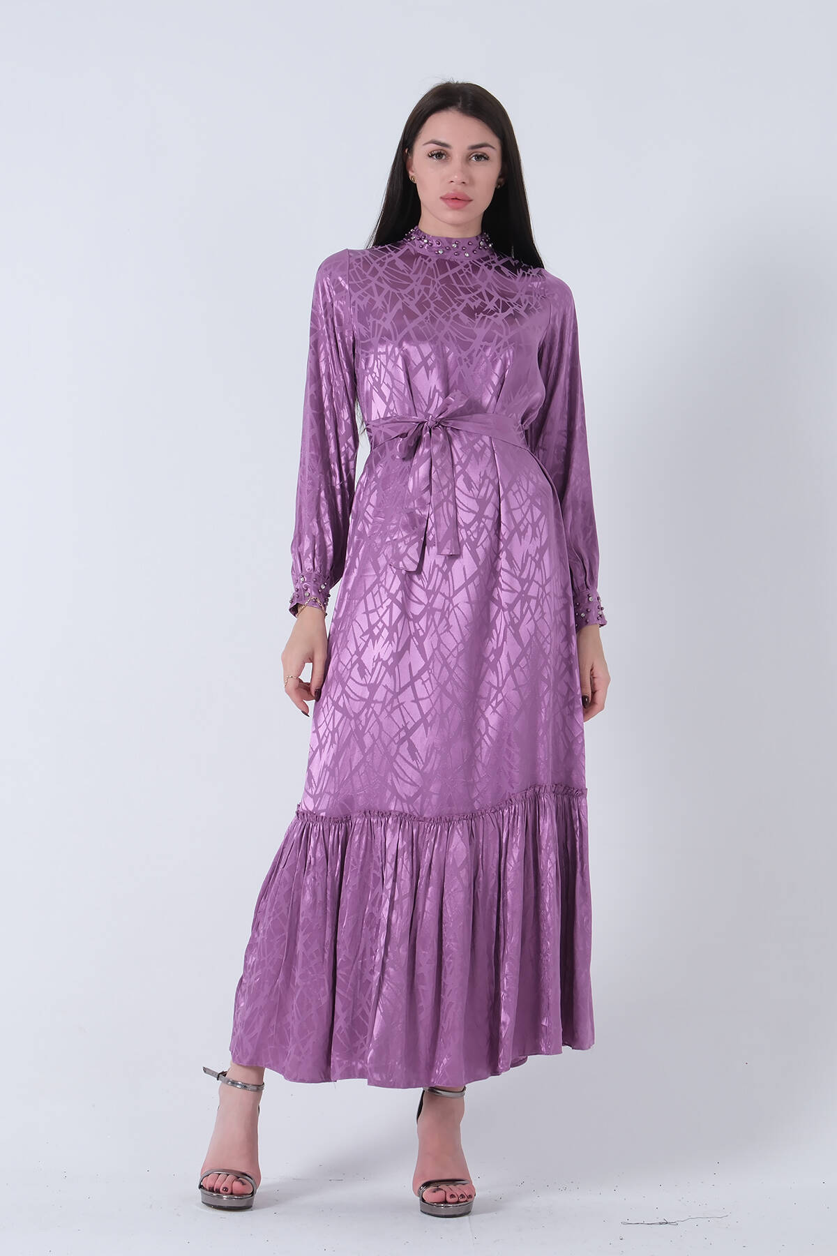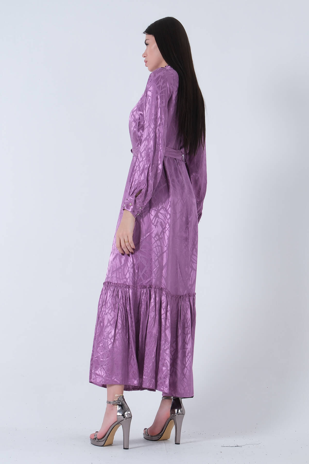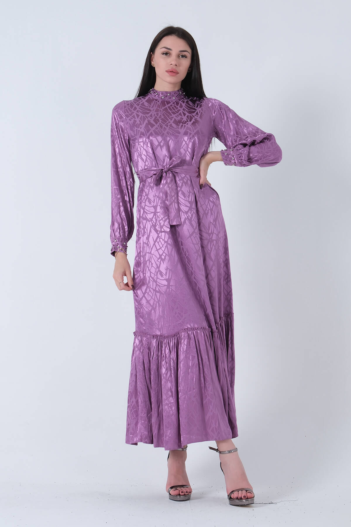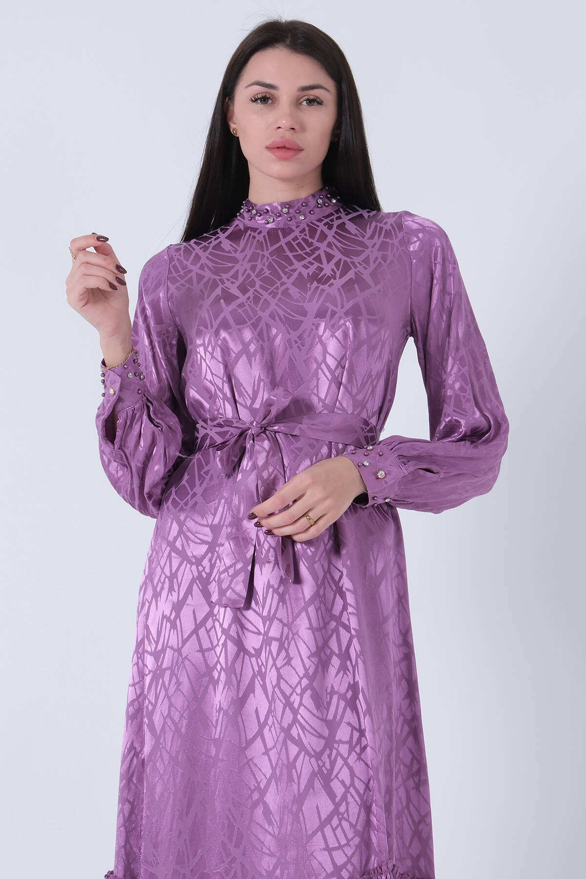 Lavanta Yakası ve Kolları Taşlı Kuşaklı Tesettür Elbise 4593281.333