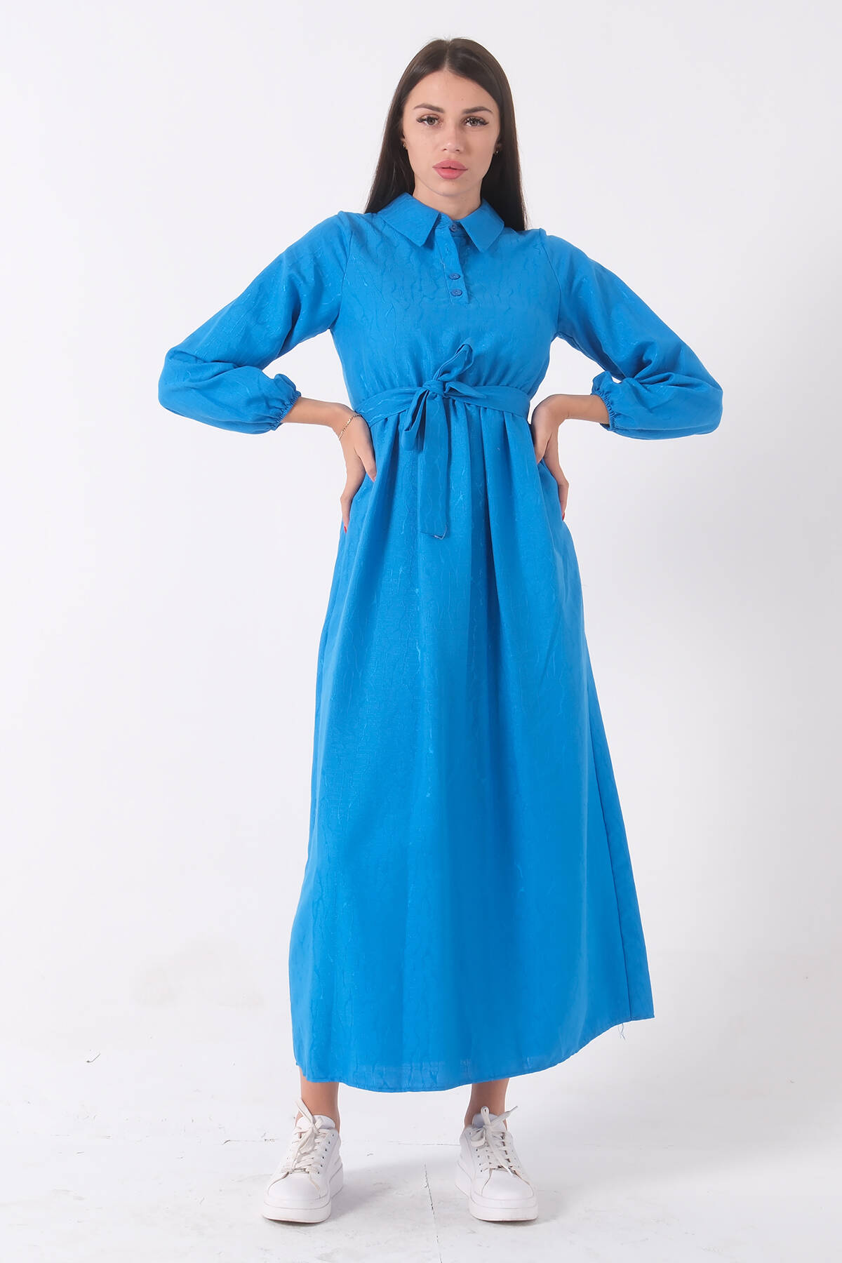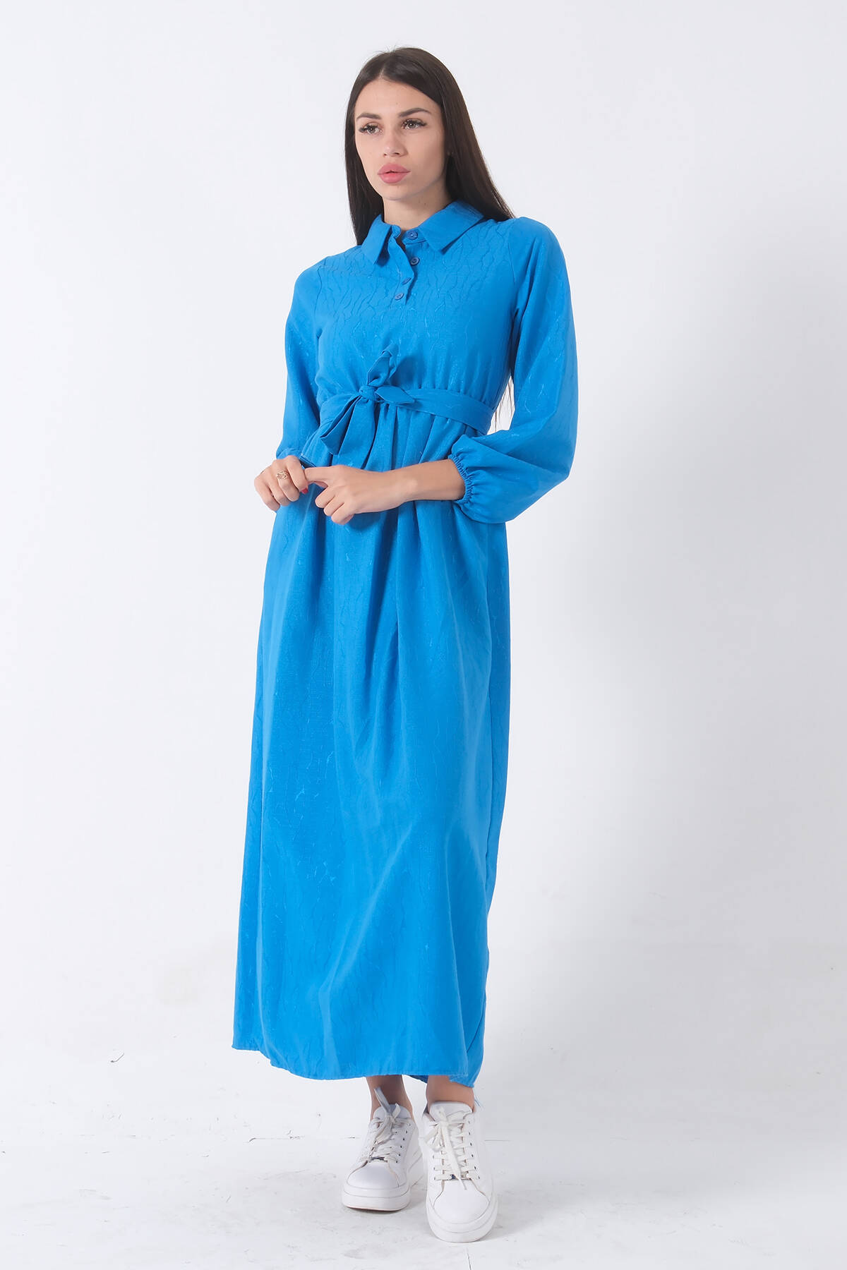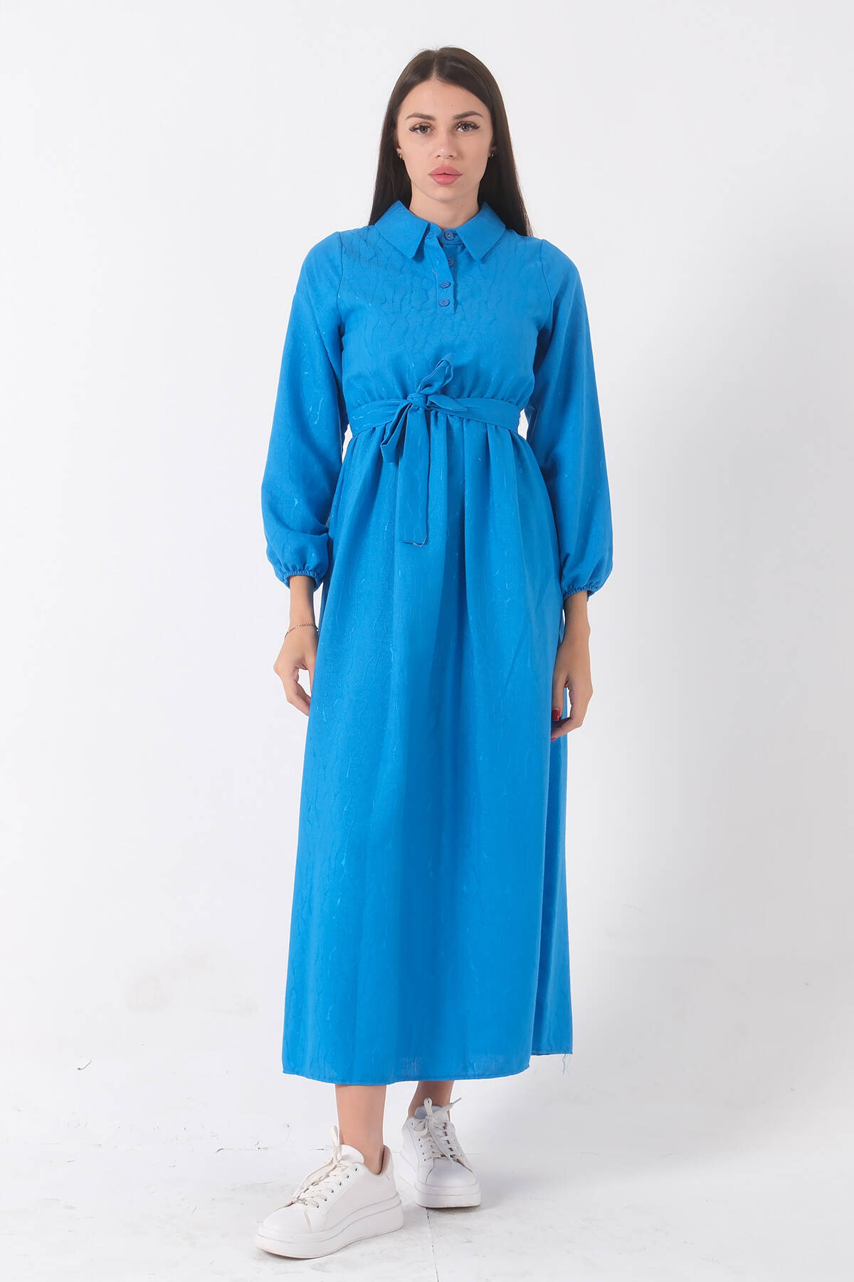 Mavi Beli Lastikli Gömlek Yaka Kuşaklı Tesettür Elbise 4593296.16