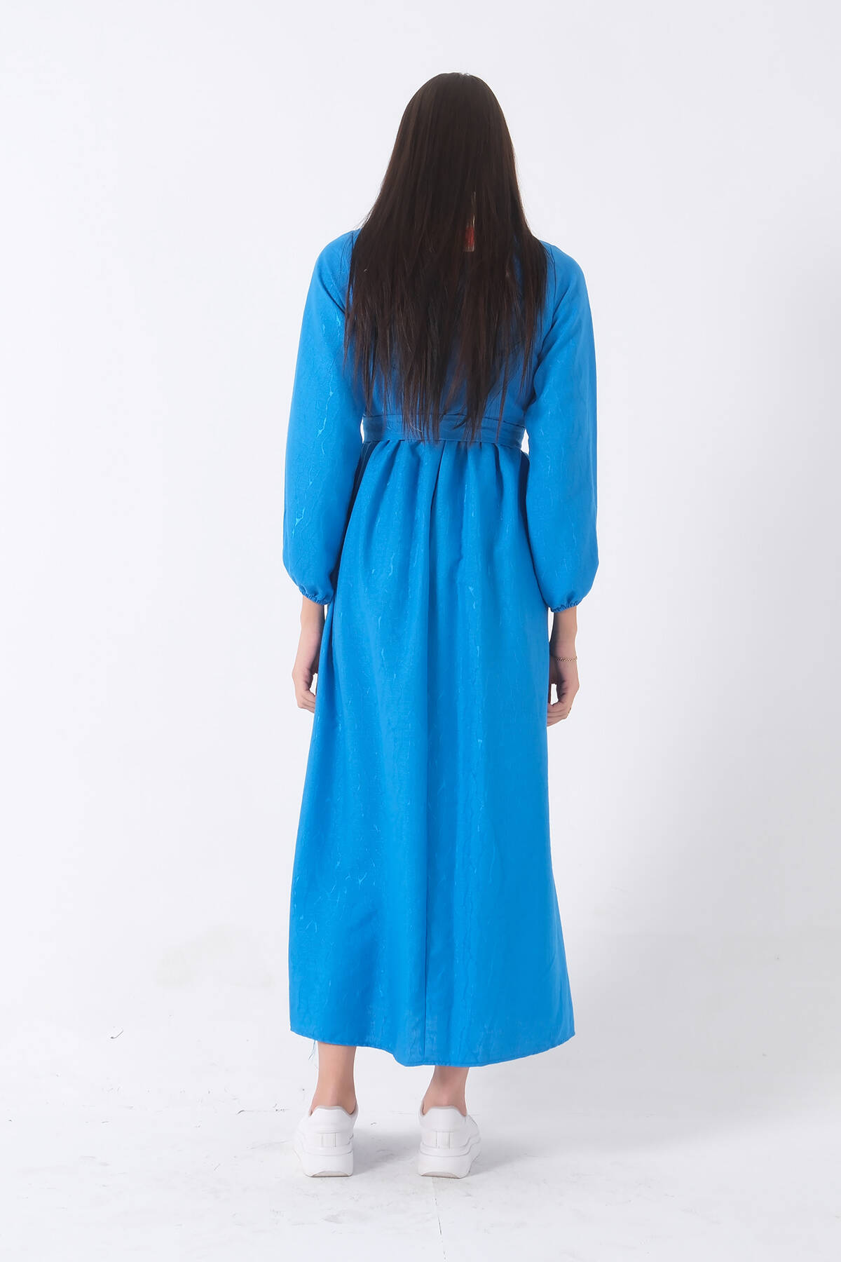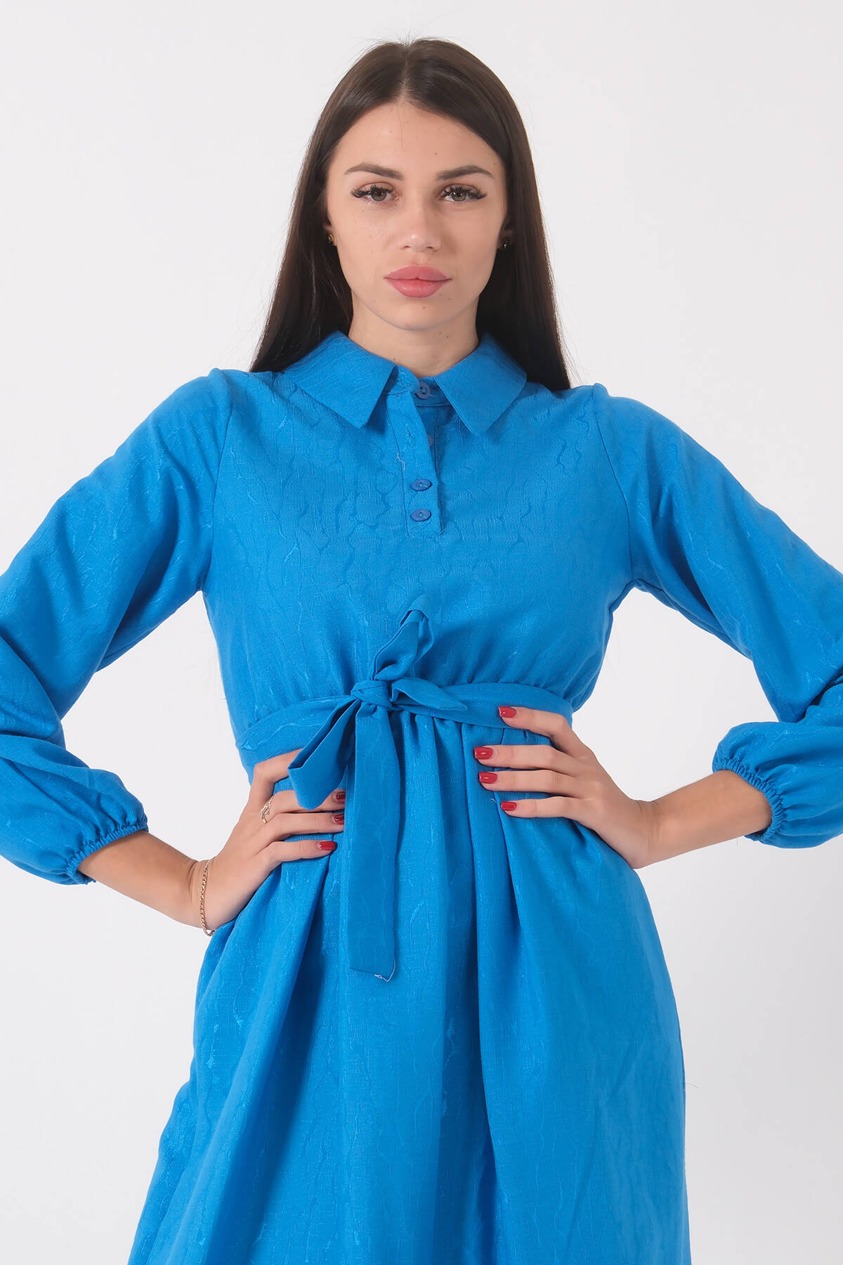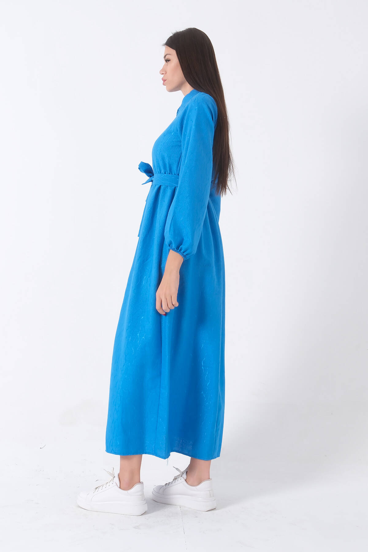 Mavi Beli Lastikli Gömlek Yaka Kuşaklı Tesettür Elbise 4593296.16