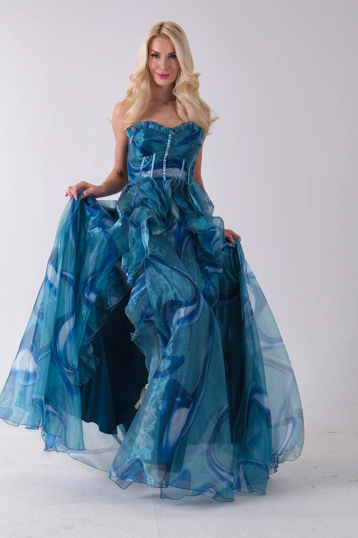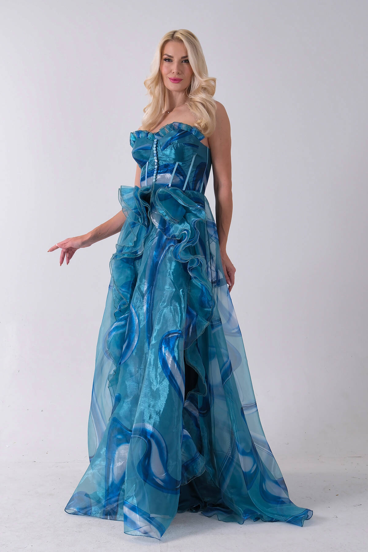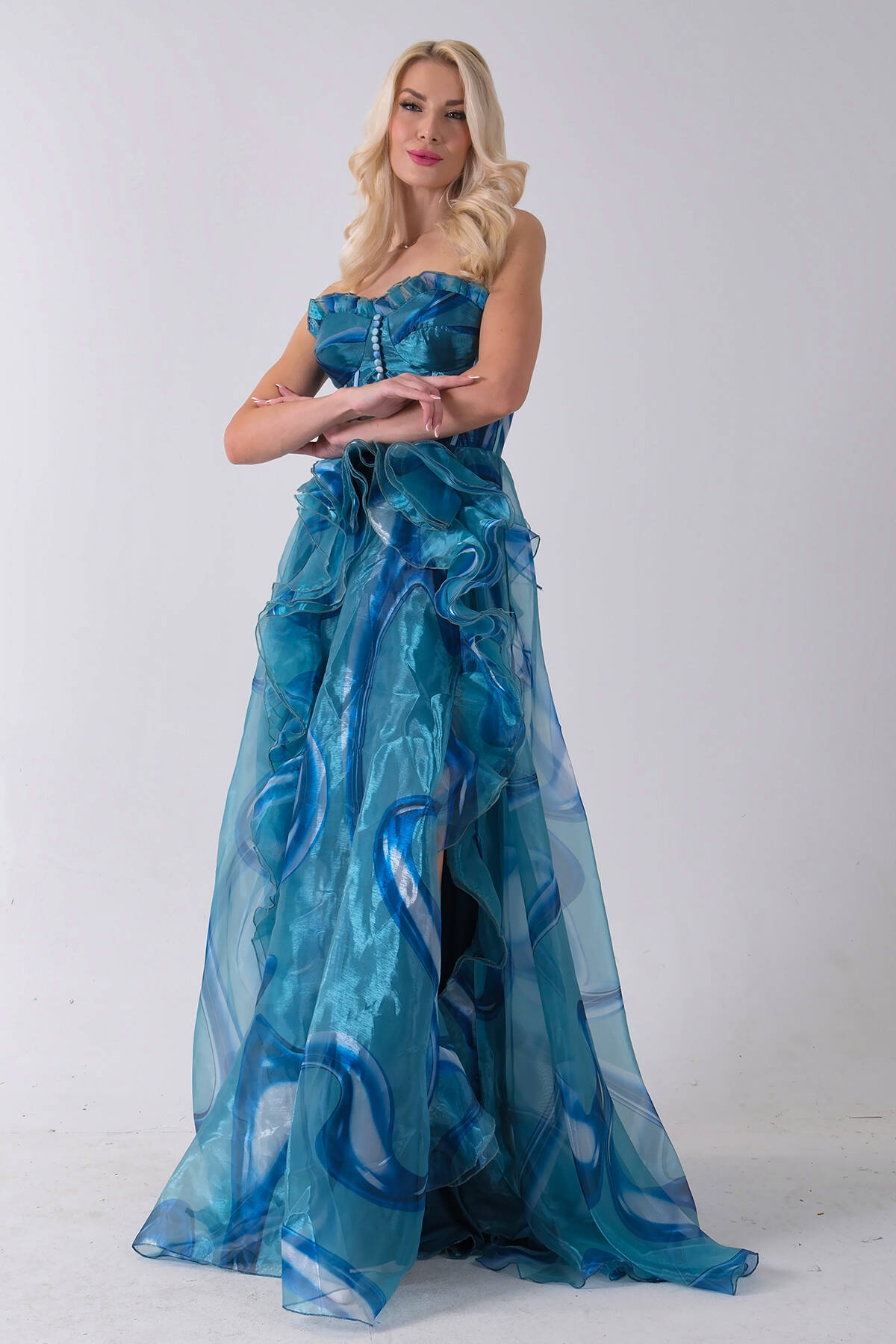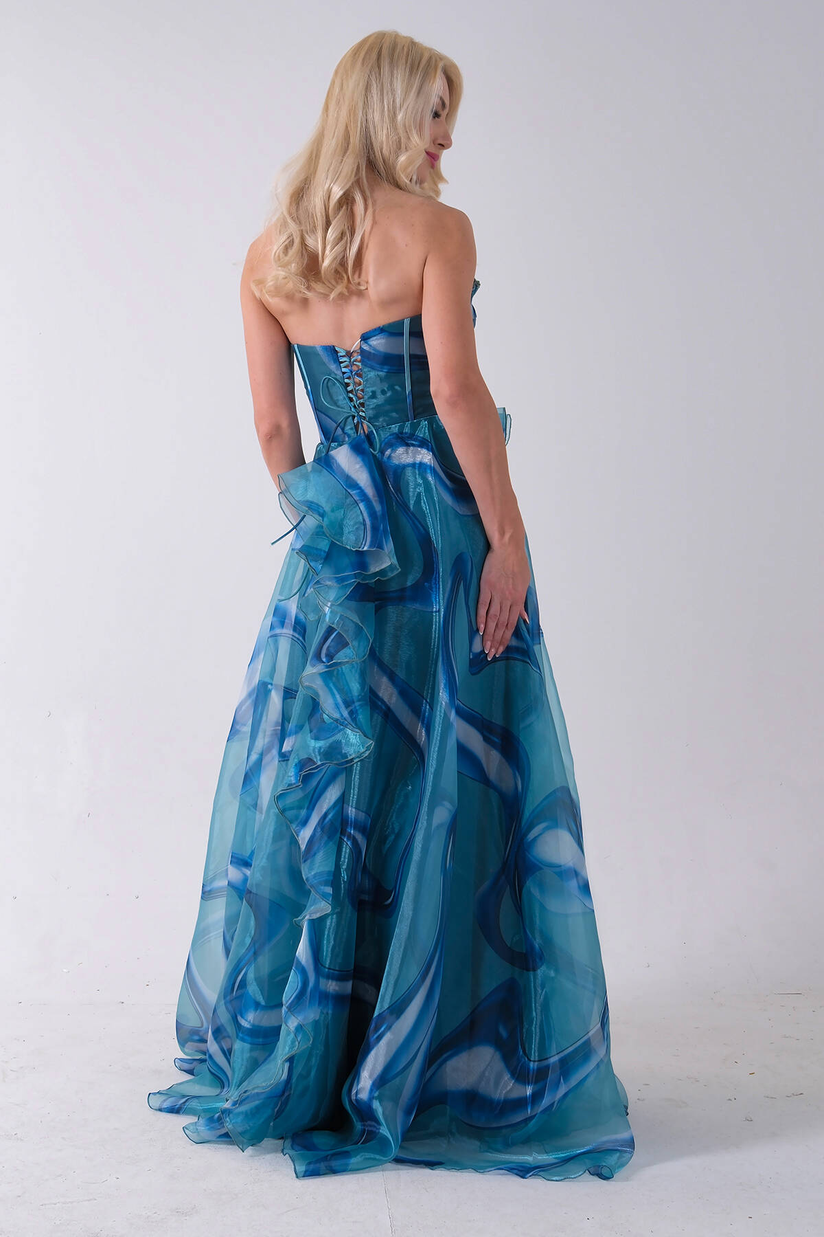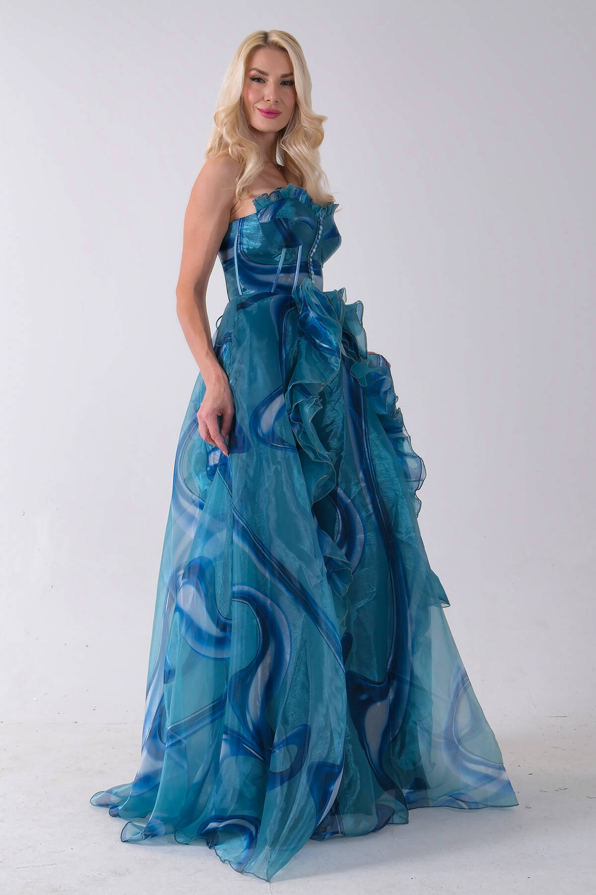 Mavi Straplez Yaka Önü Düğme Detaylı Desenli Fırfırlı Abiye 9705680.16