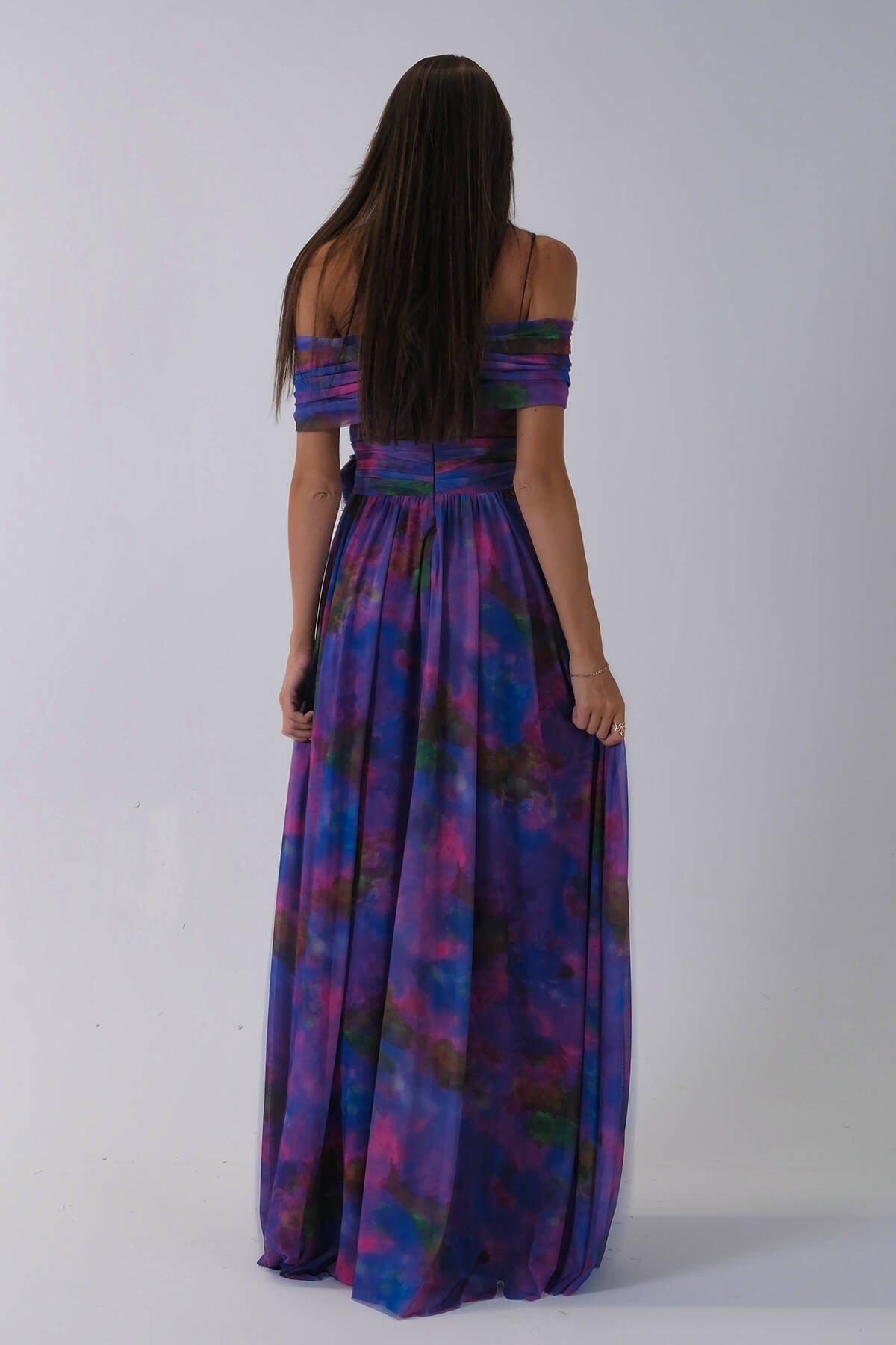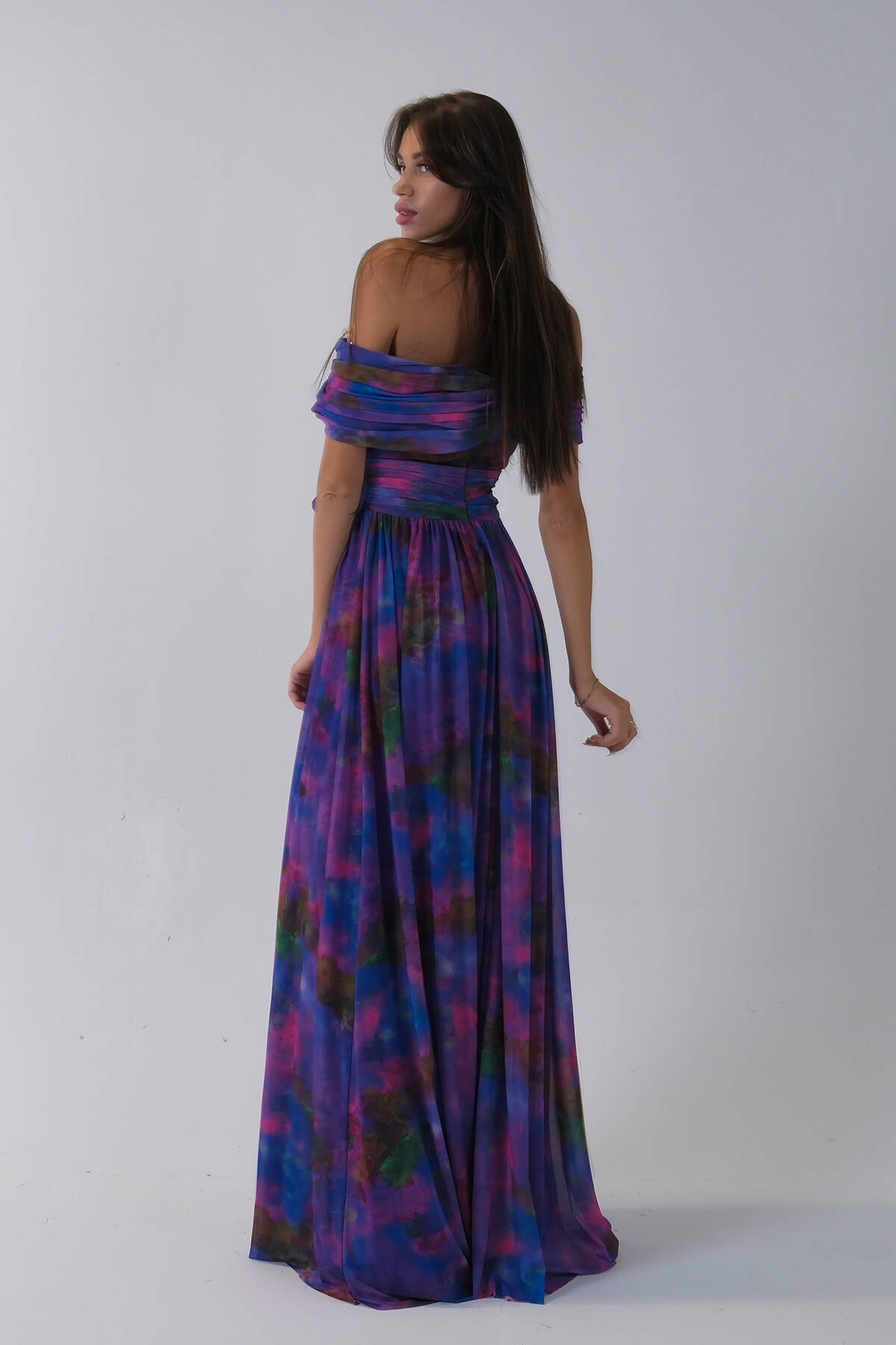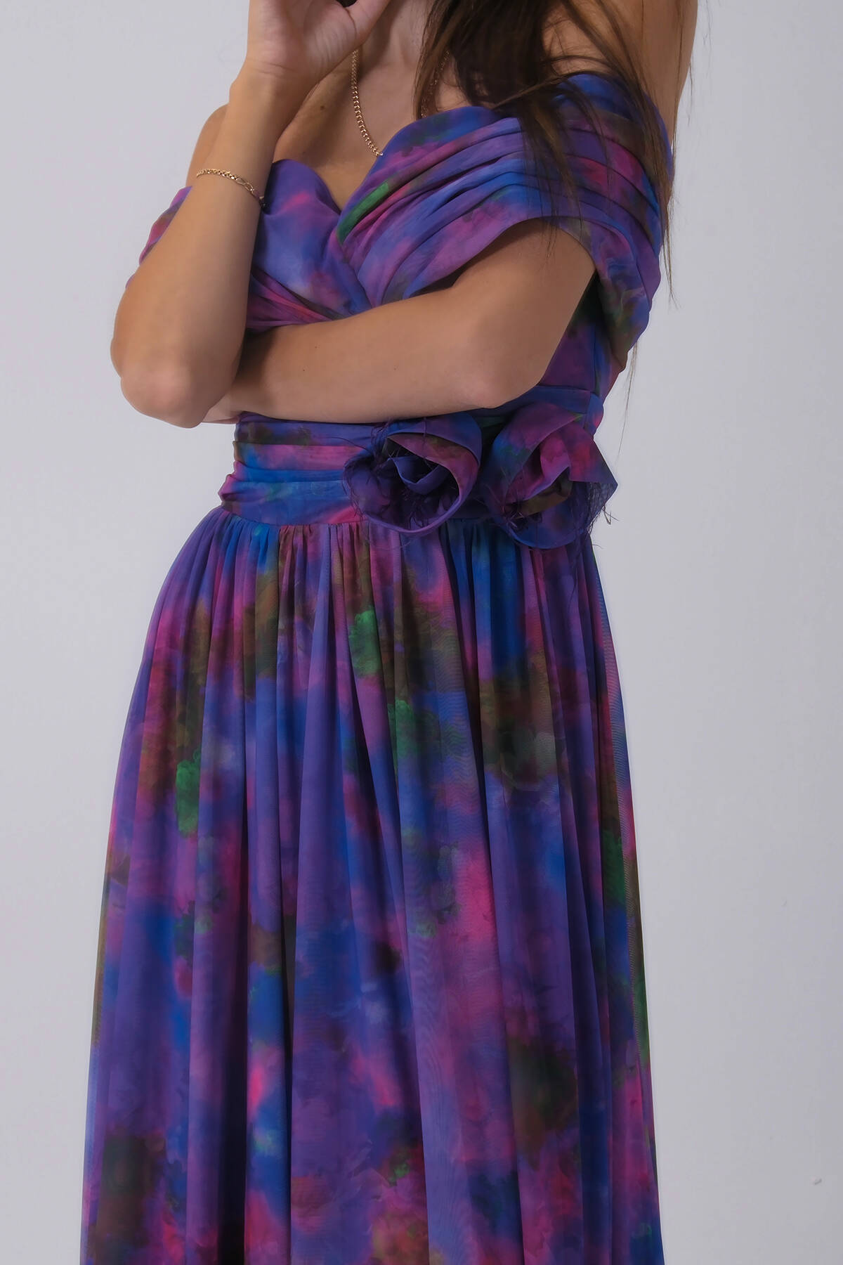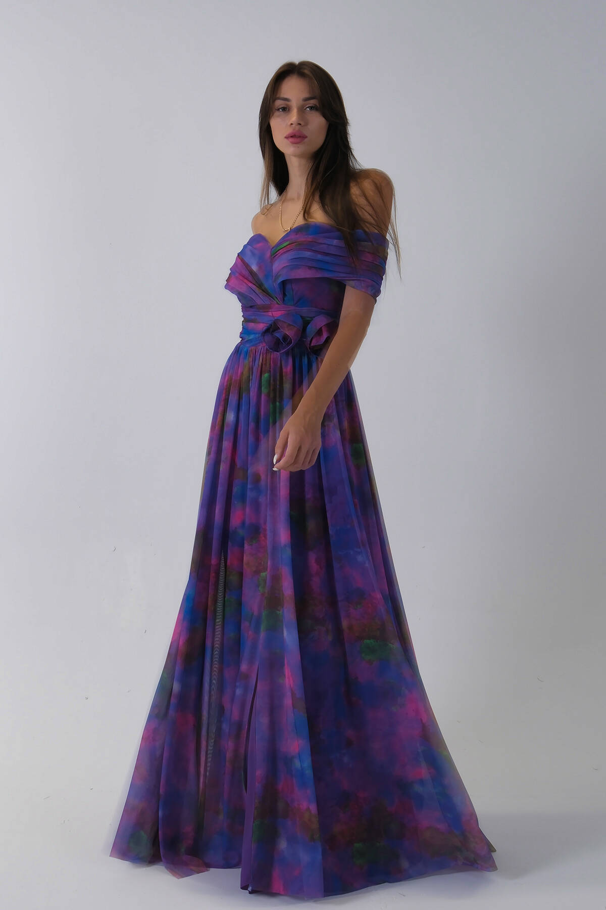 Mor Beli Çiçek Detaylı Desenli Şifon Abiye 0801102.03