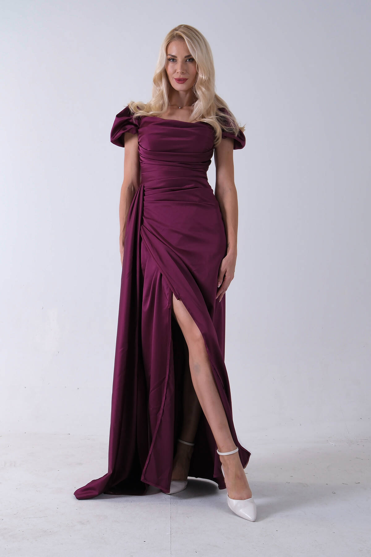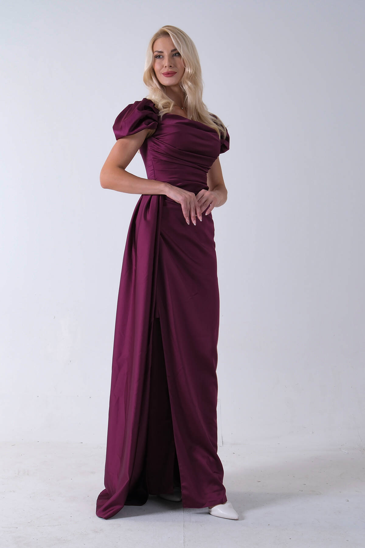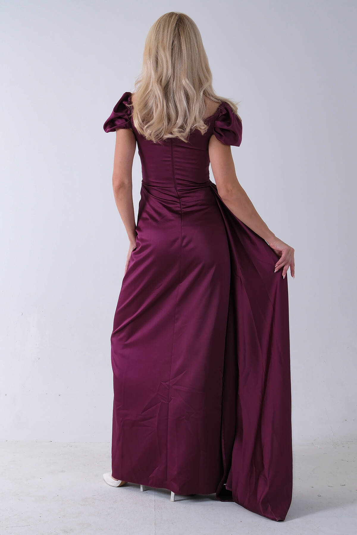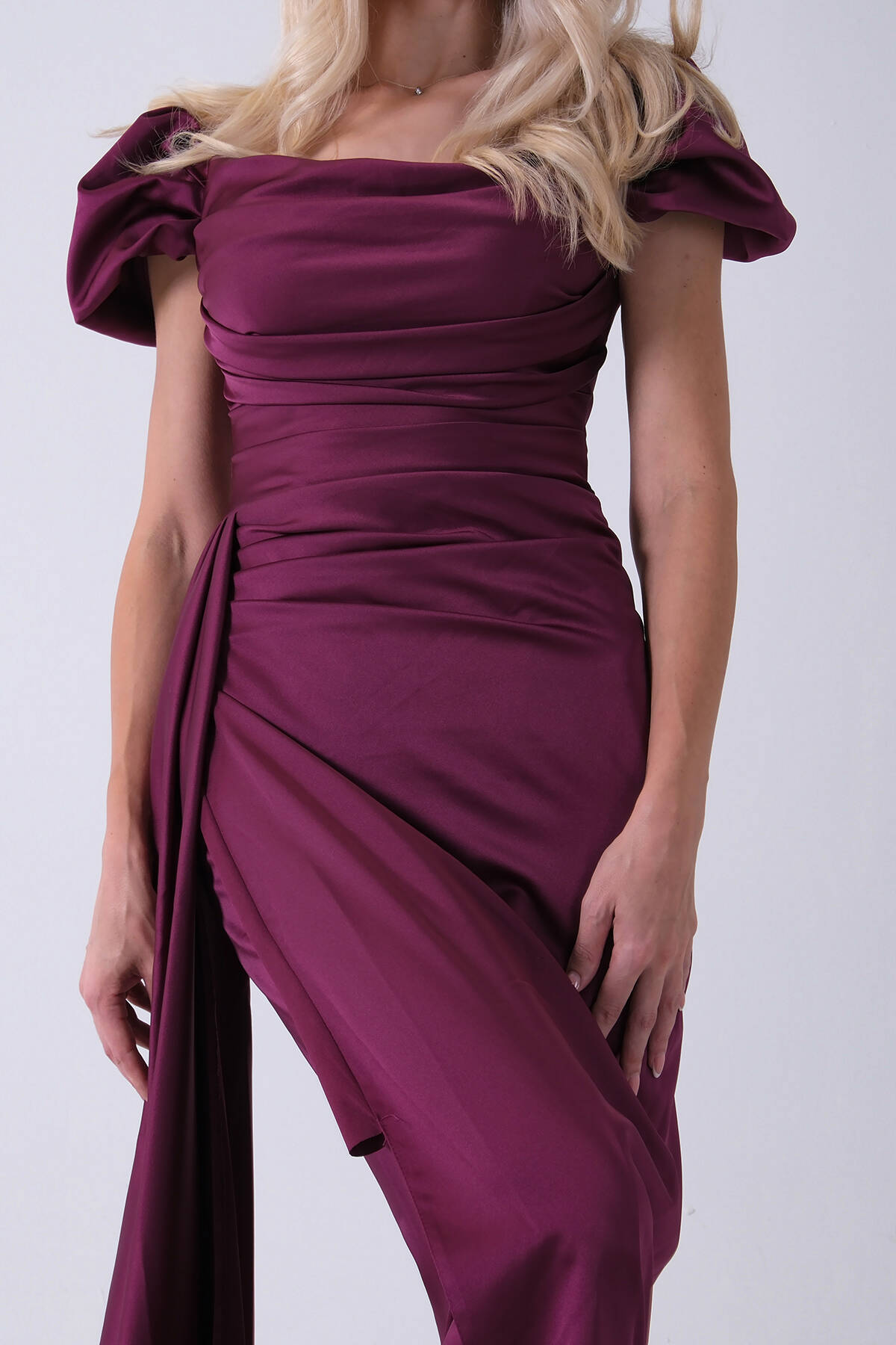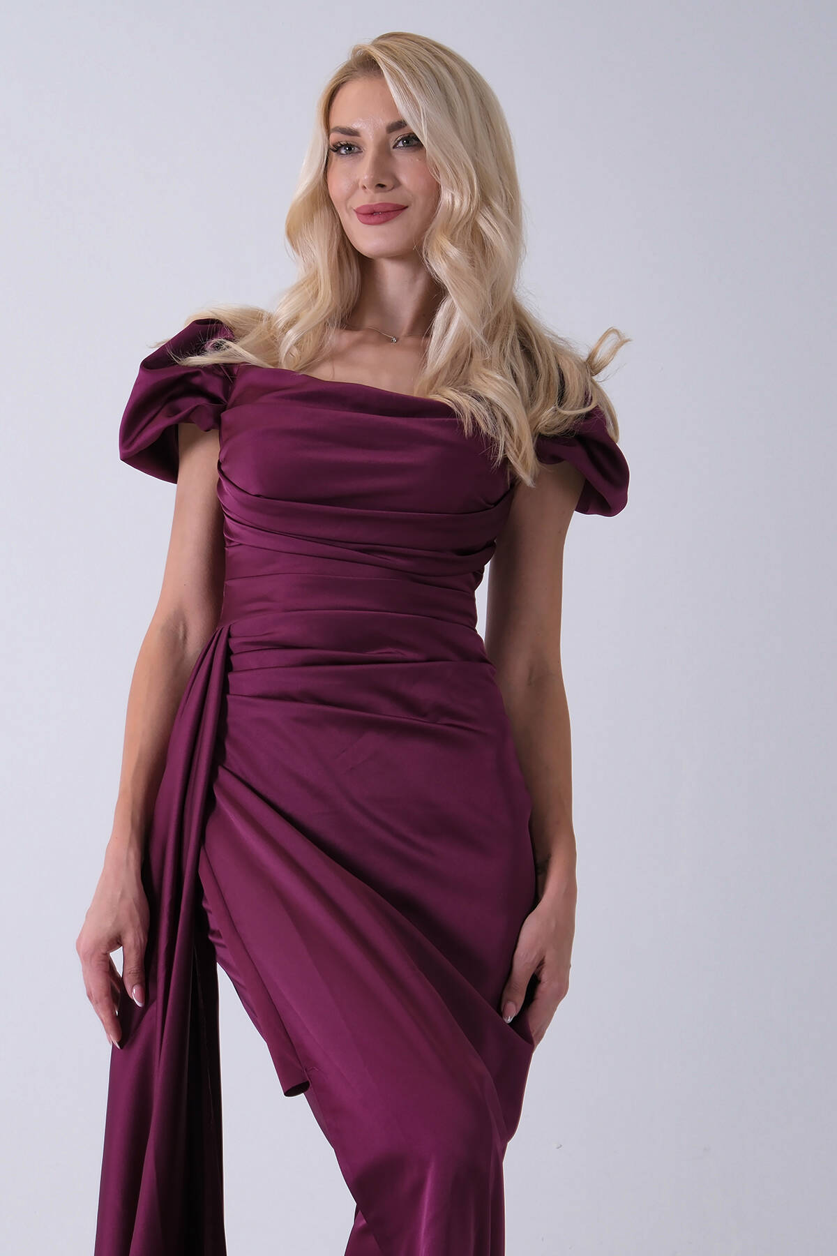 Mürdüm Drape Detaylı Saten Kumaş Abiye Elbise 9704858.21