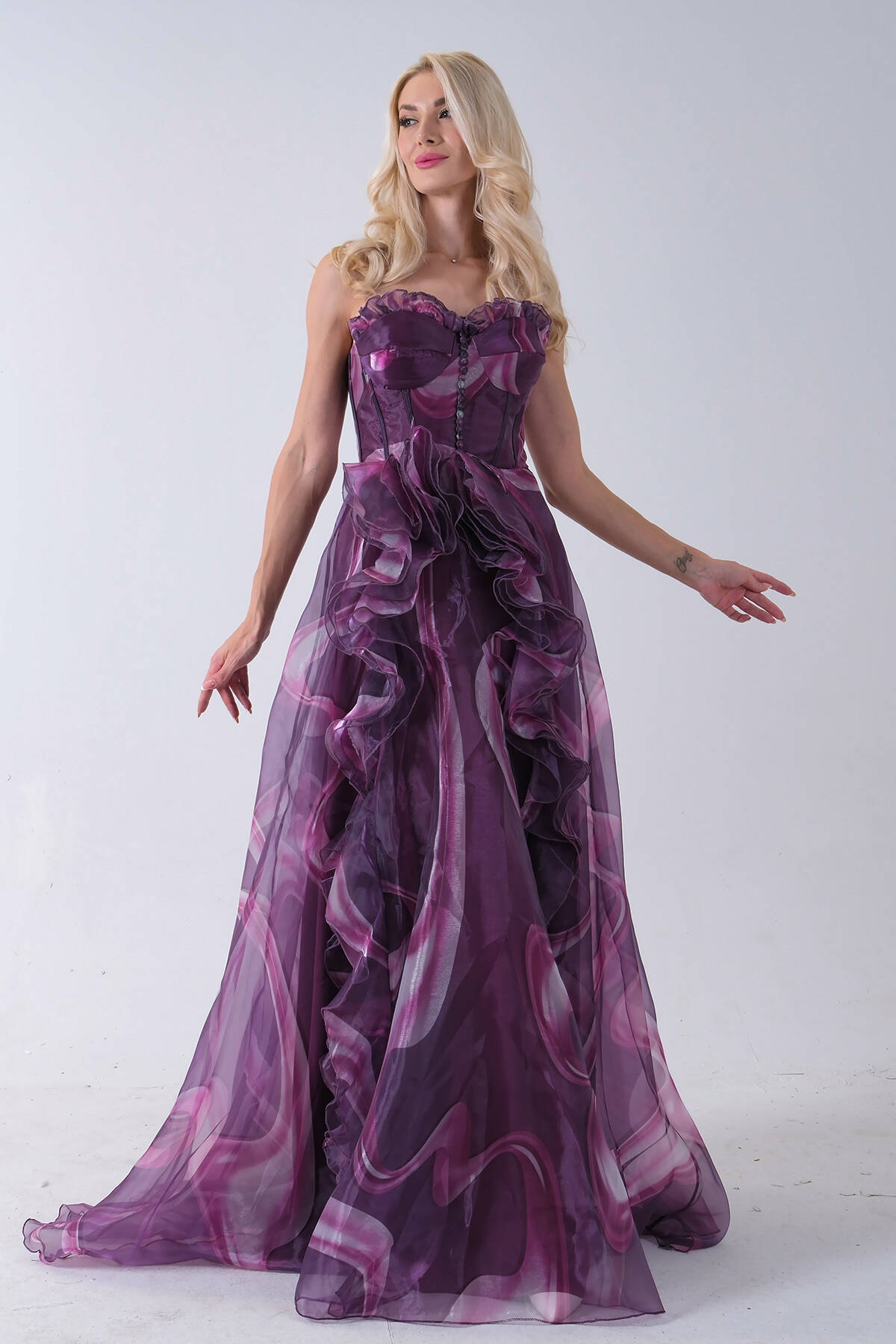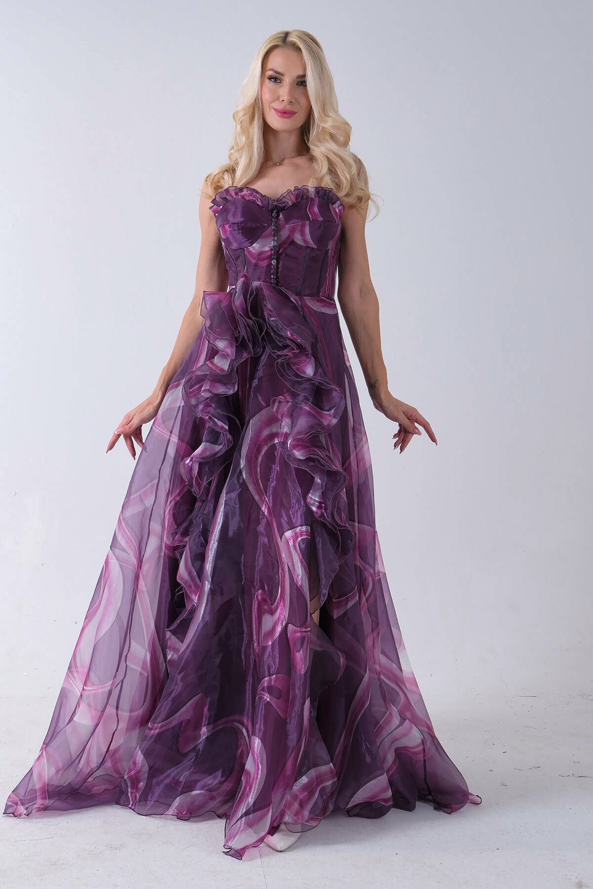 Mürdüm Straplez Yaka Önü Düğme Detaylı Desenli Fırfırlı Abiye 9705680.21