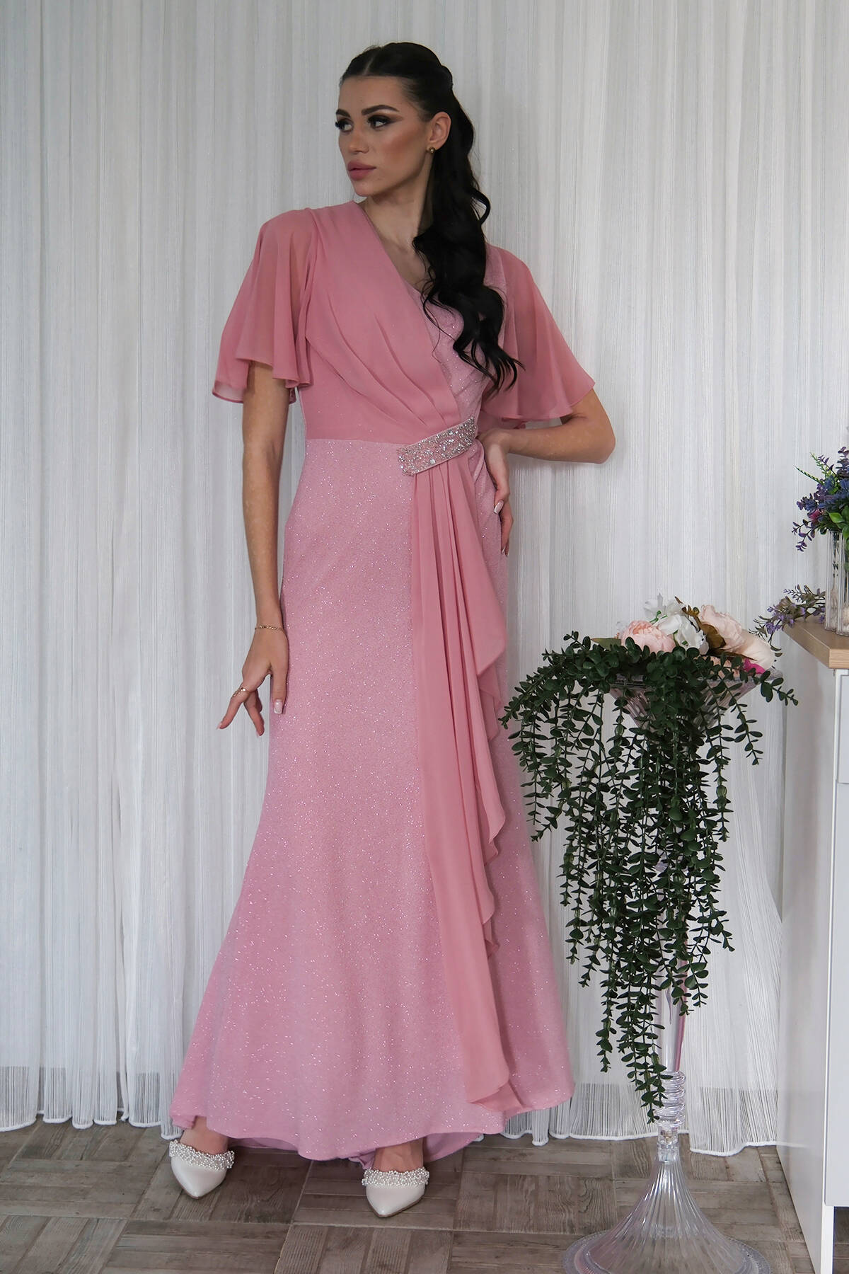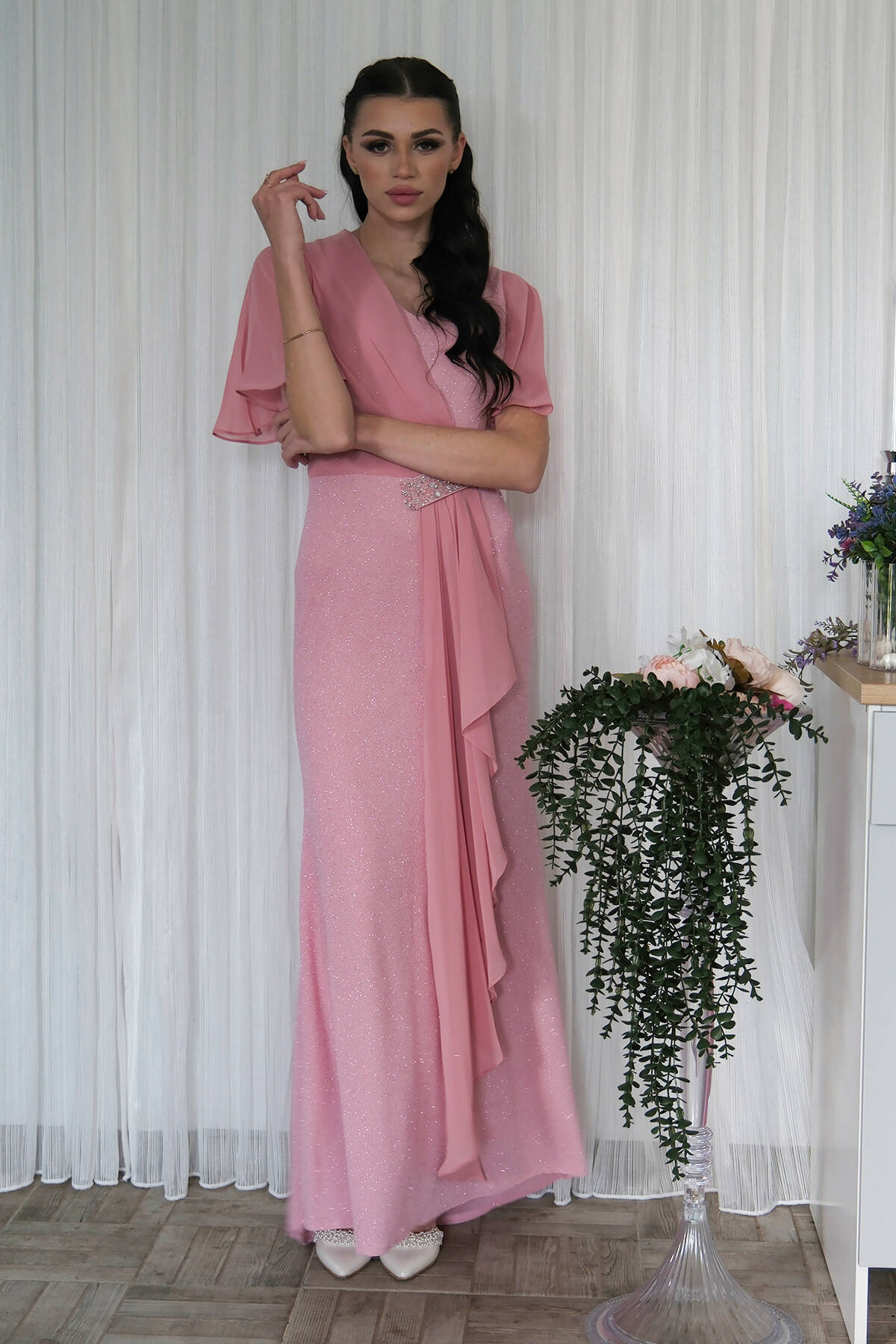 Pudra Beli Taş Detaylı Yarım Kol Tesettür Abiye 08061271.79