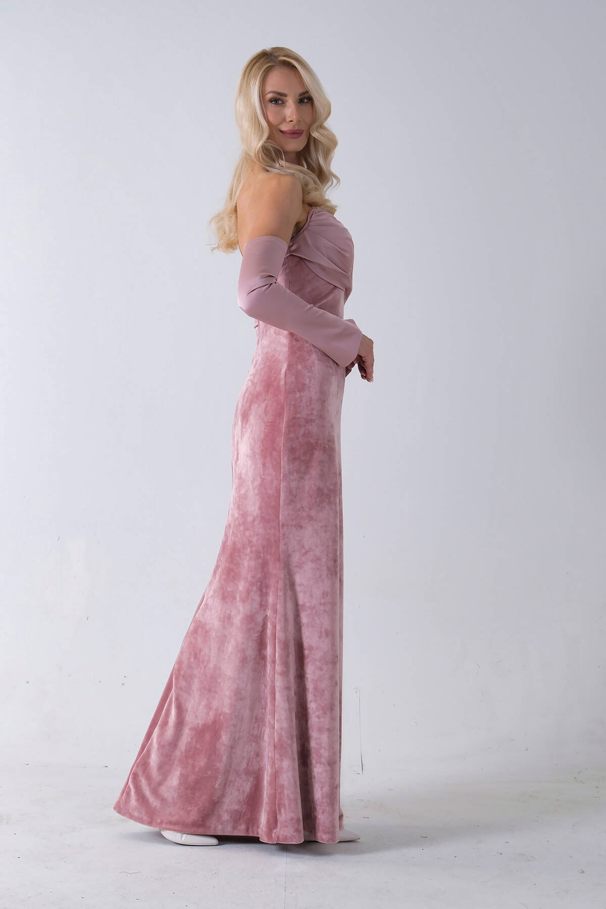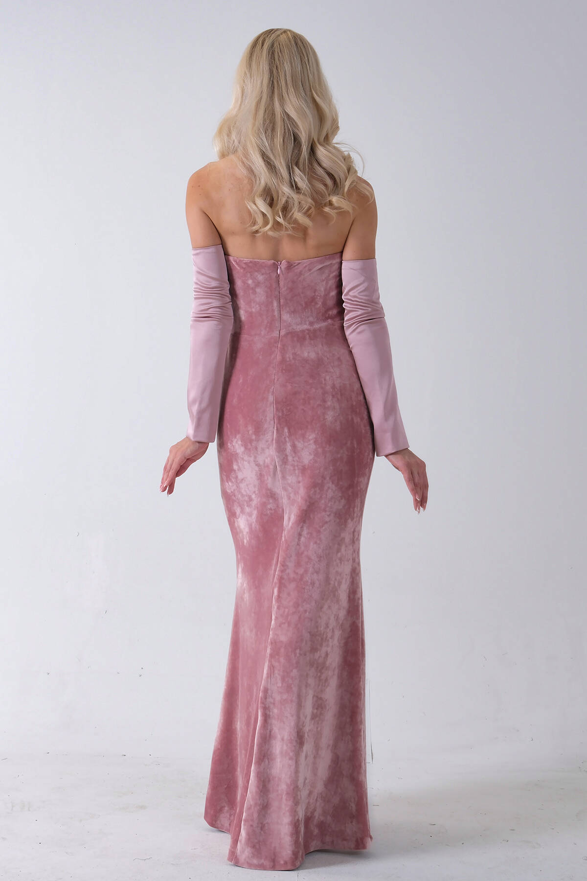 Pudra Drapeli Takma Kol Detaylı Kadife Abiye 0801068.79