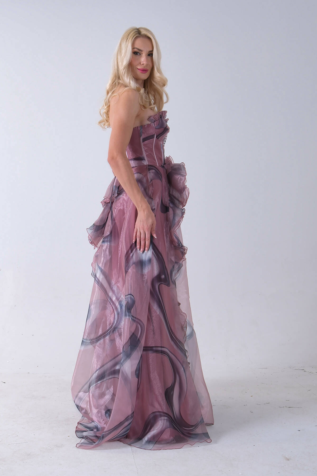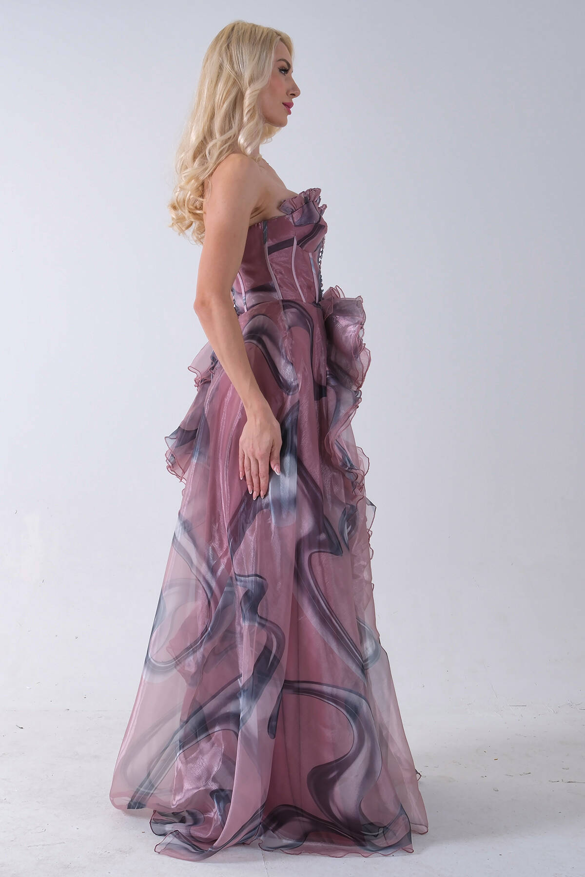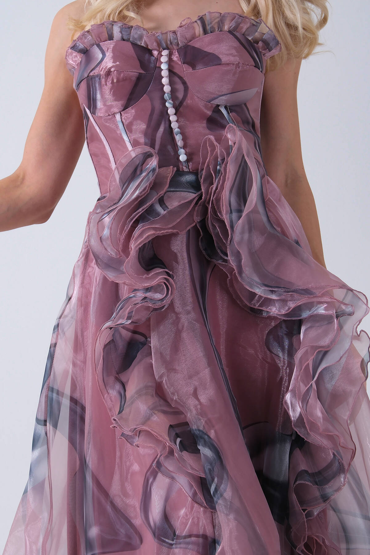 Pudra Straplez Yaka Önü Düğme Detaylı Desenli Fırfırlı Abiye 9705680.79