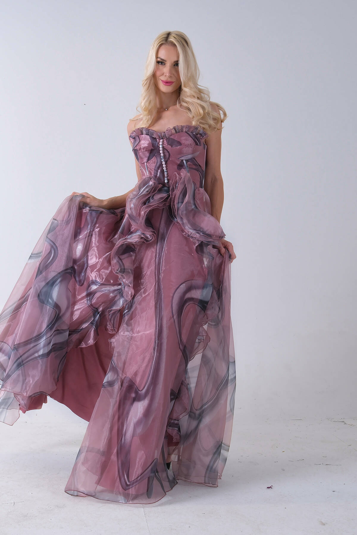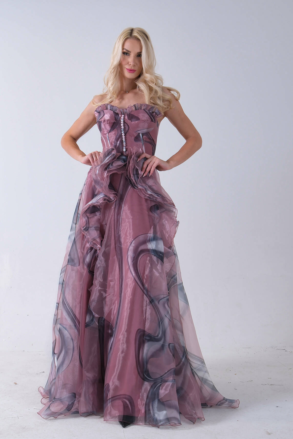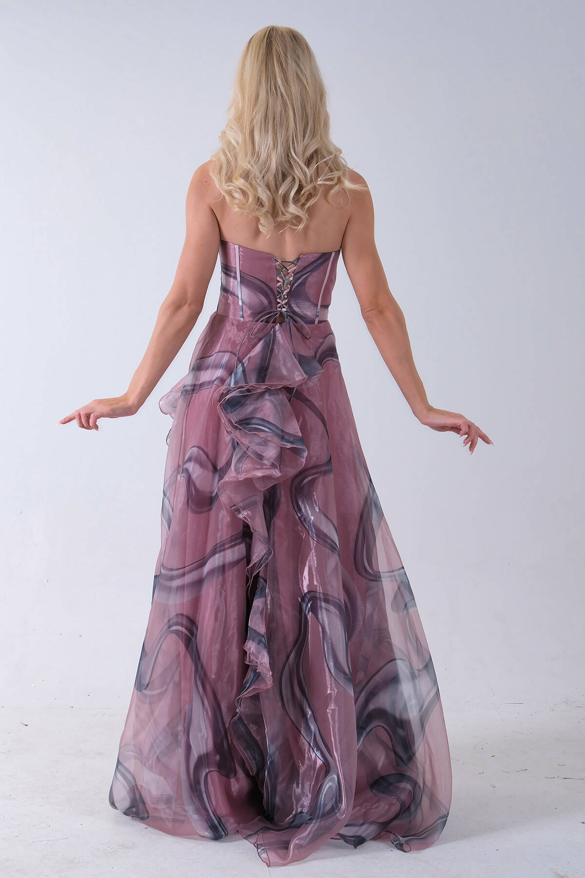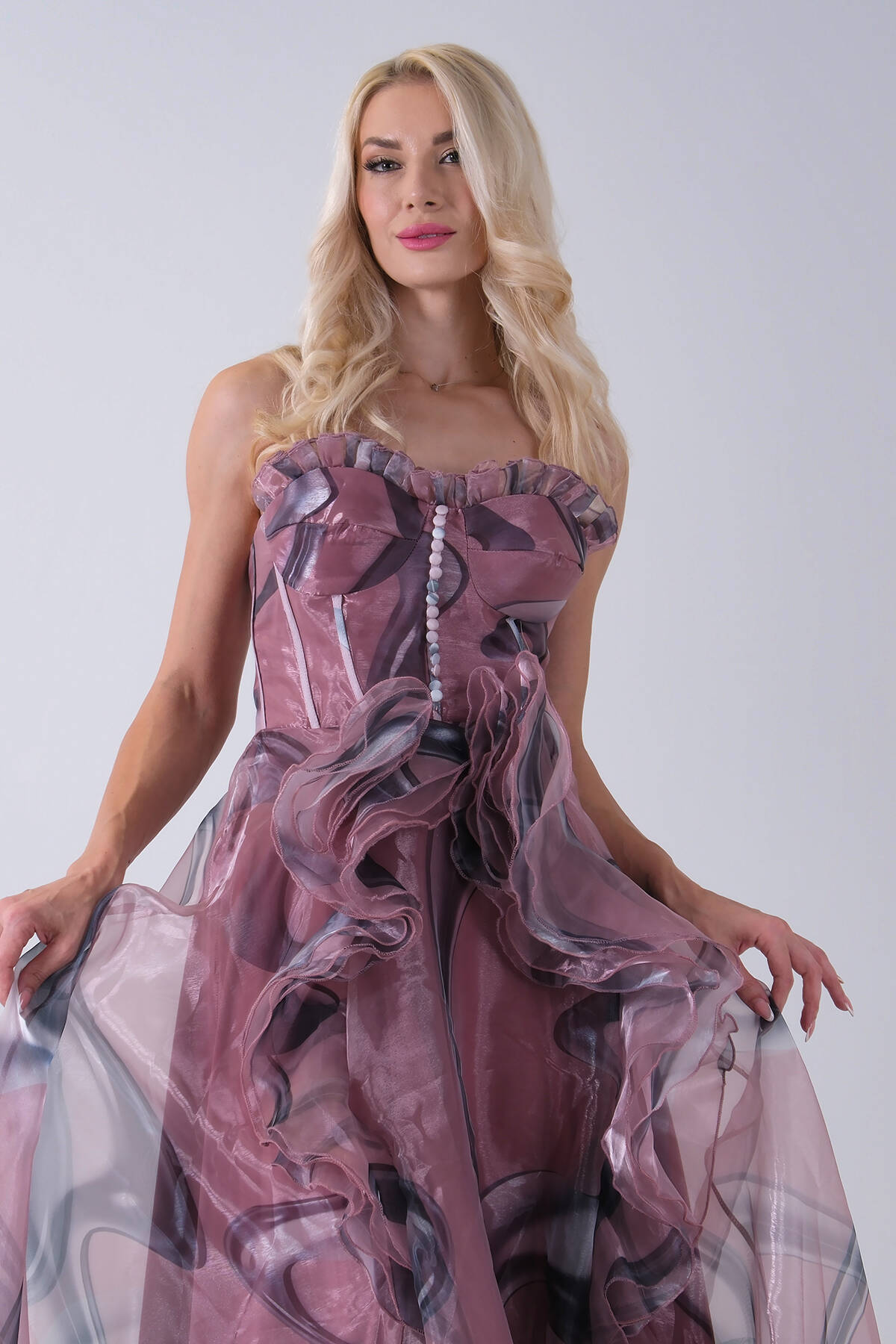 Pudra Straplez Yaka Önü Düğme Detaylı Desenli Fırfırlı Abiye 9705680.79