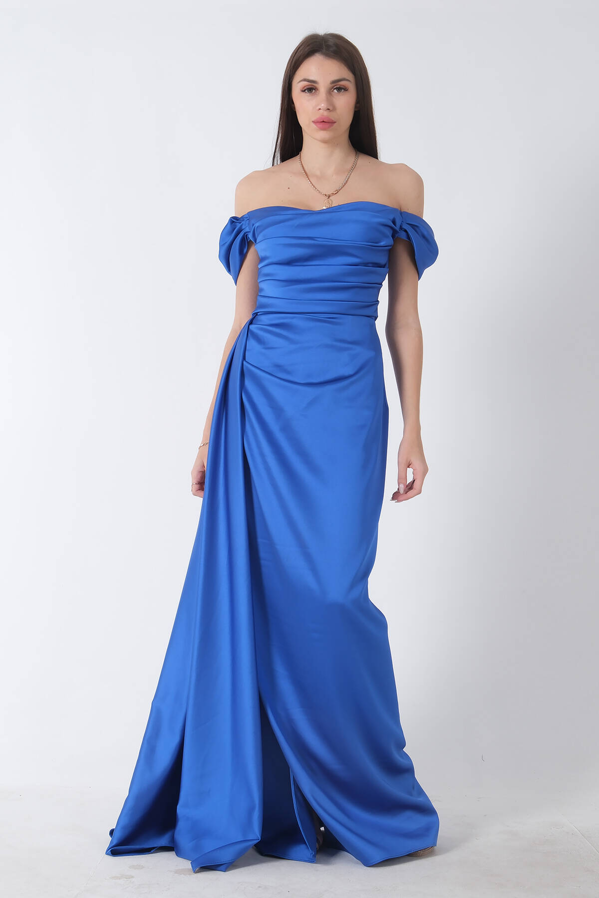 Saks Drape Detaylı Saten Kumaş Abiye Elbise 9704858.26