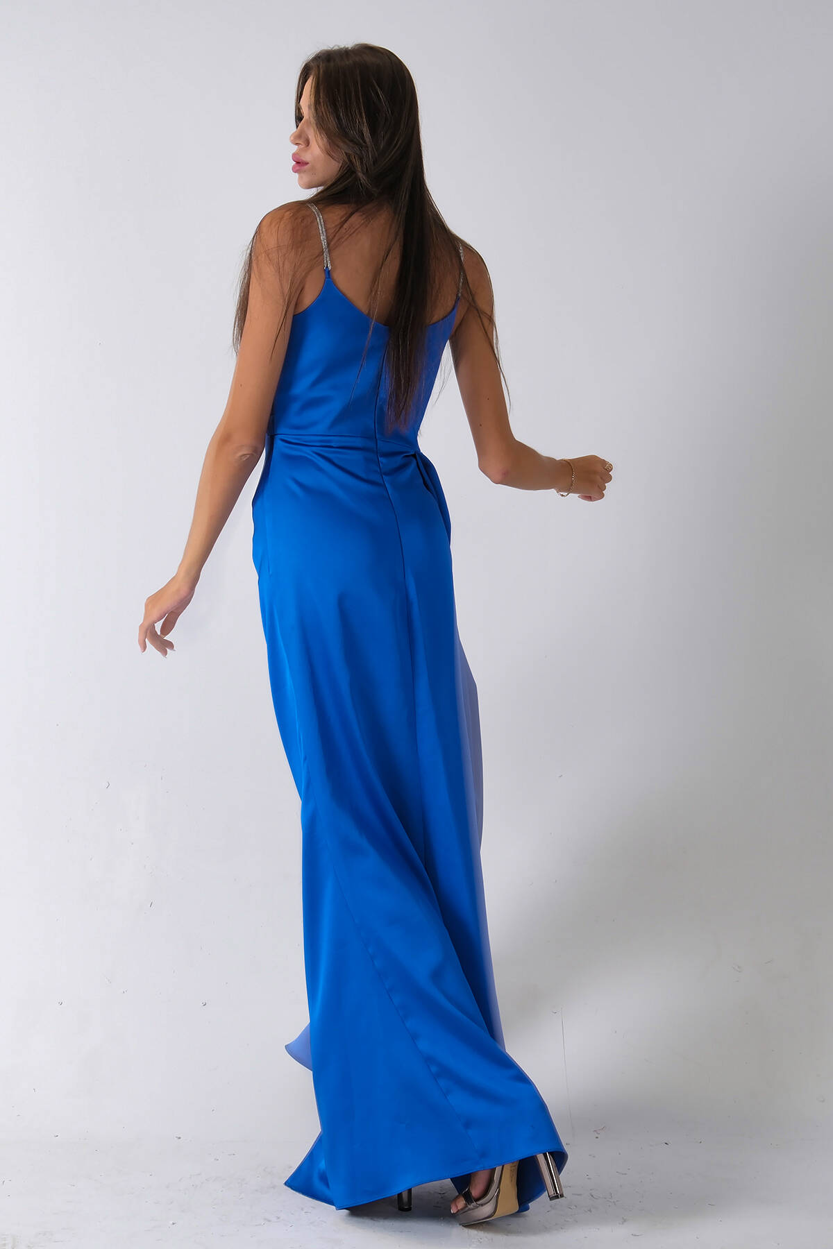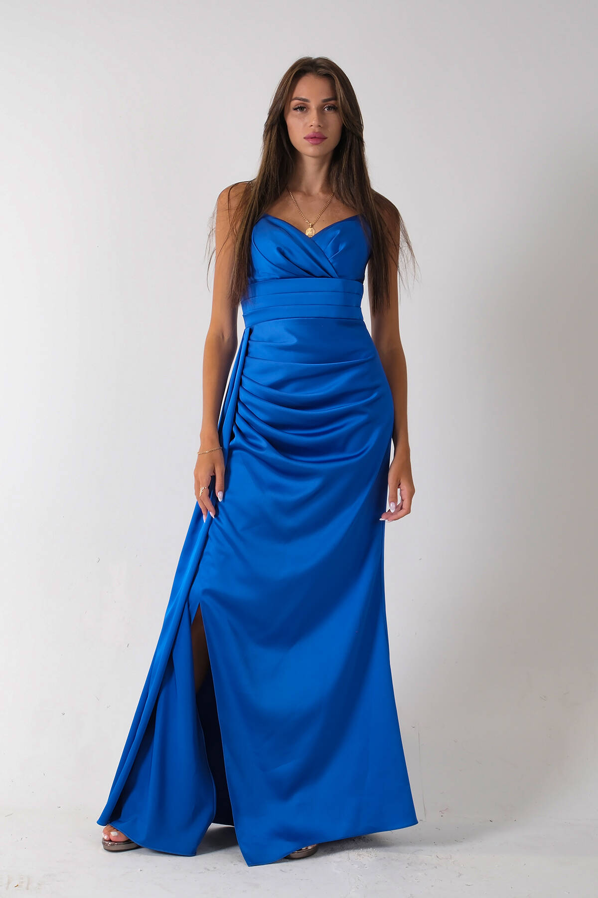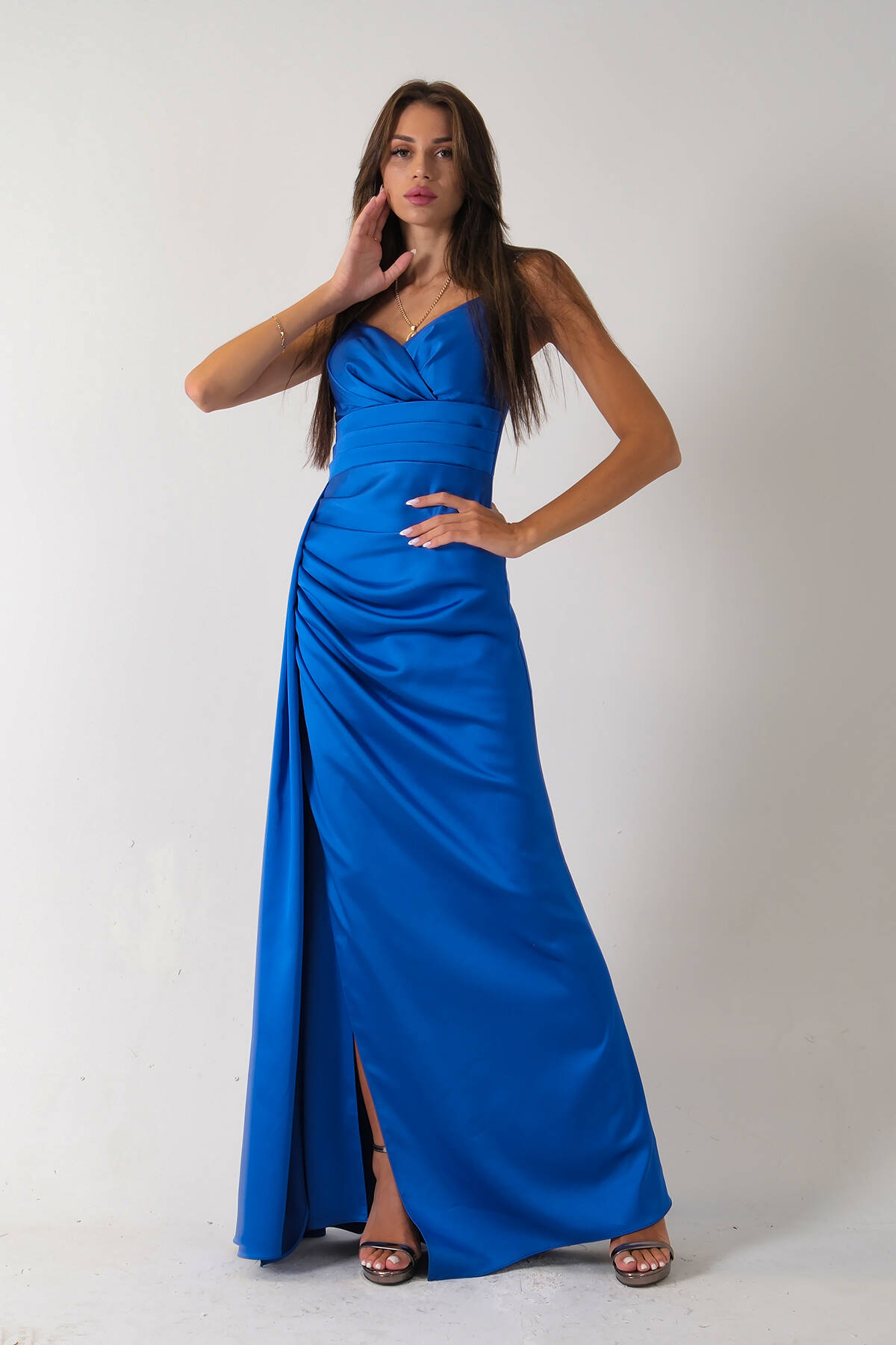 Saks Gümüş Askı Detaylı Yırtmaçlı Straplez Abiye 0801023.26