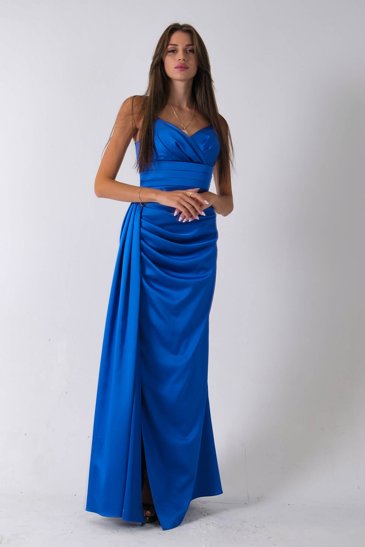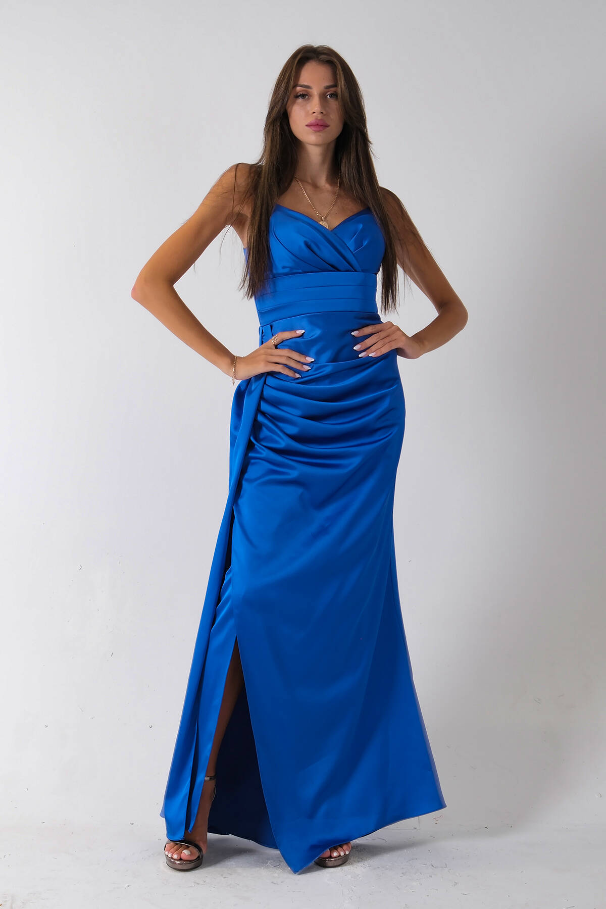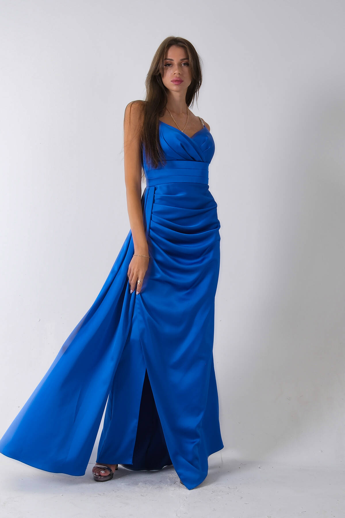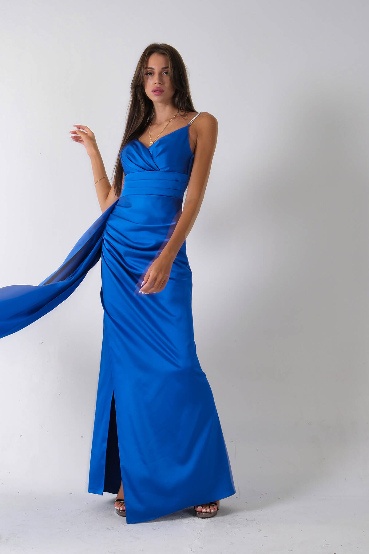 Saks Gümüş Askı Detaylı Yırtmaçlı Straplez Abiye 0801023.26
