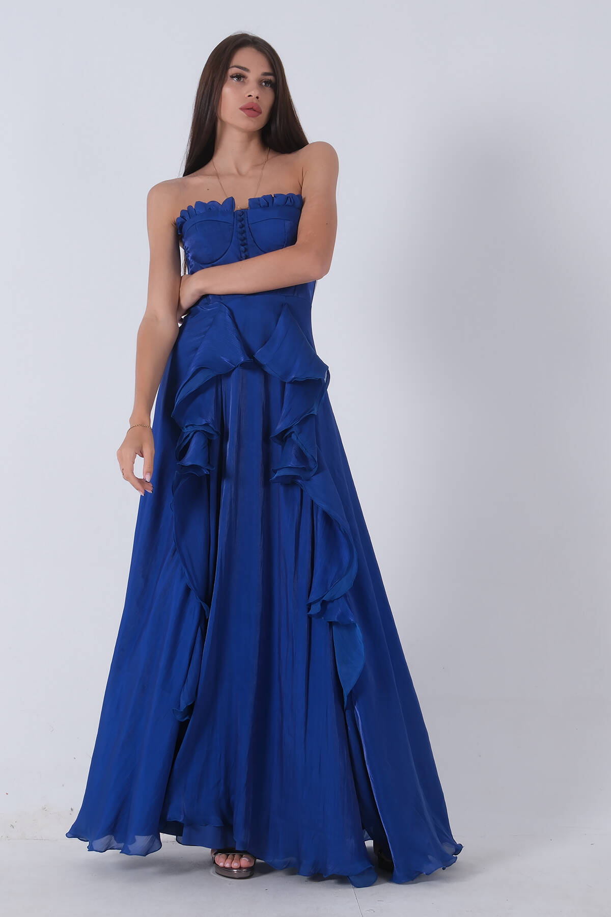 Saks Straplez Yaka Yırtmaçlı Eteği Fırfırlı Abiye 9705234.26