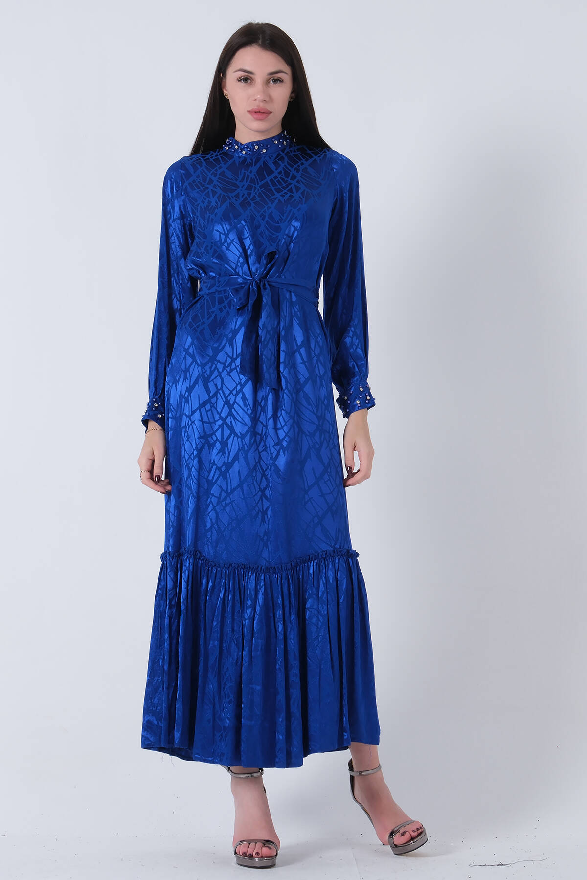Saks Yakası ve Kolları Taşlı Kuşaklı Tesettür Elbise 4593281.26