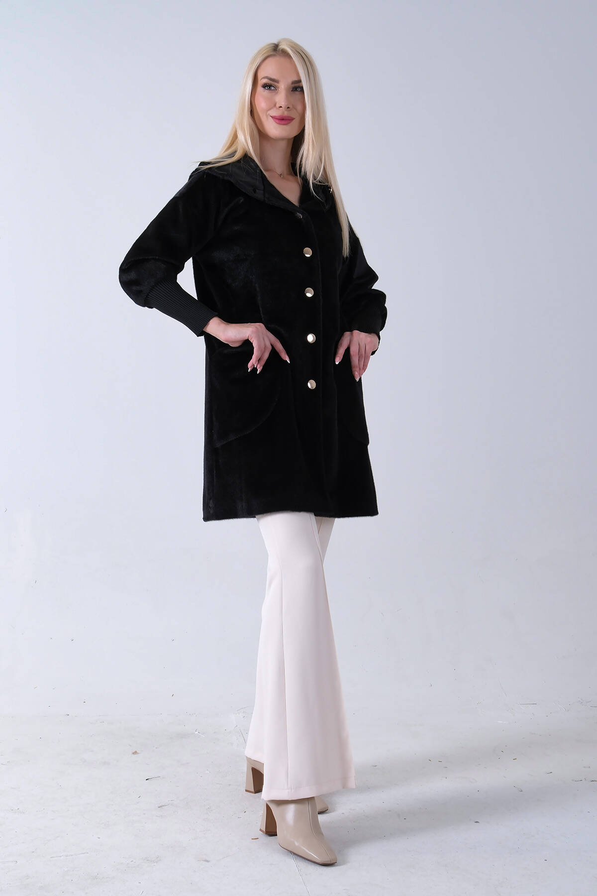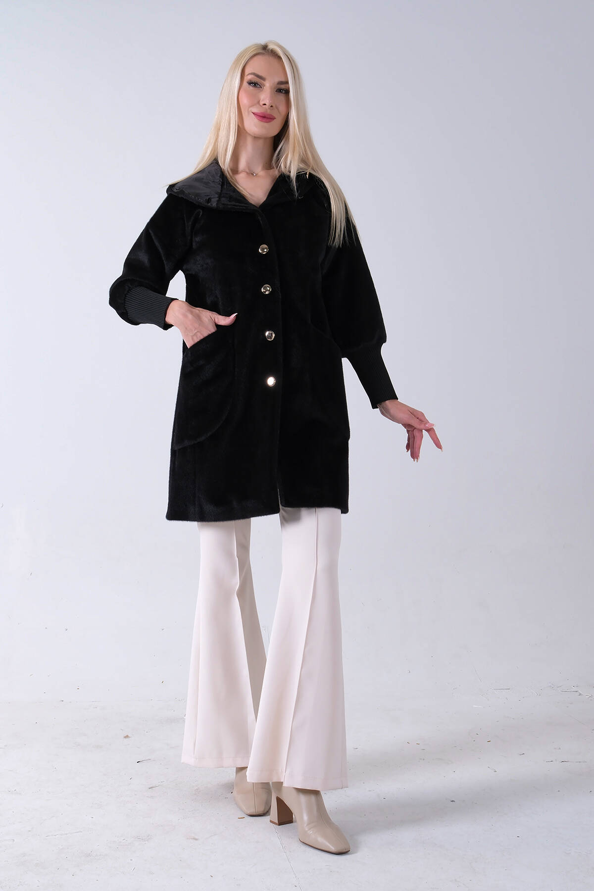 Siyah 2 Torba Cep Kapüşonlu Düğme Kapamalı Bileği Lastikli Peluş Kaban 41630062.01