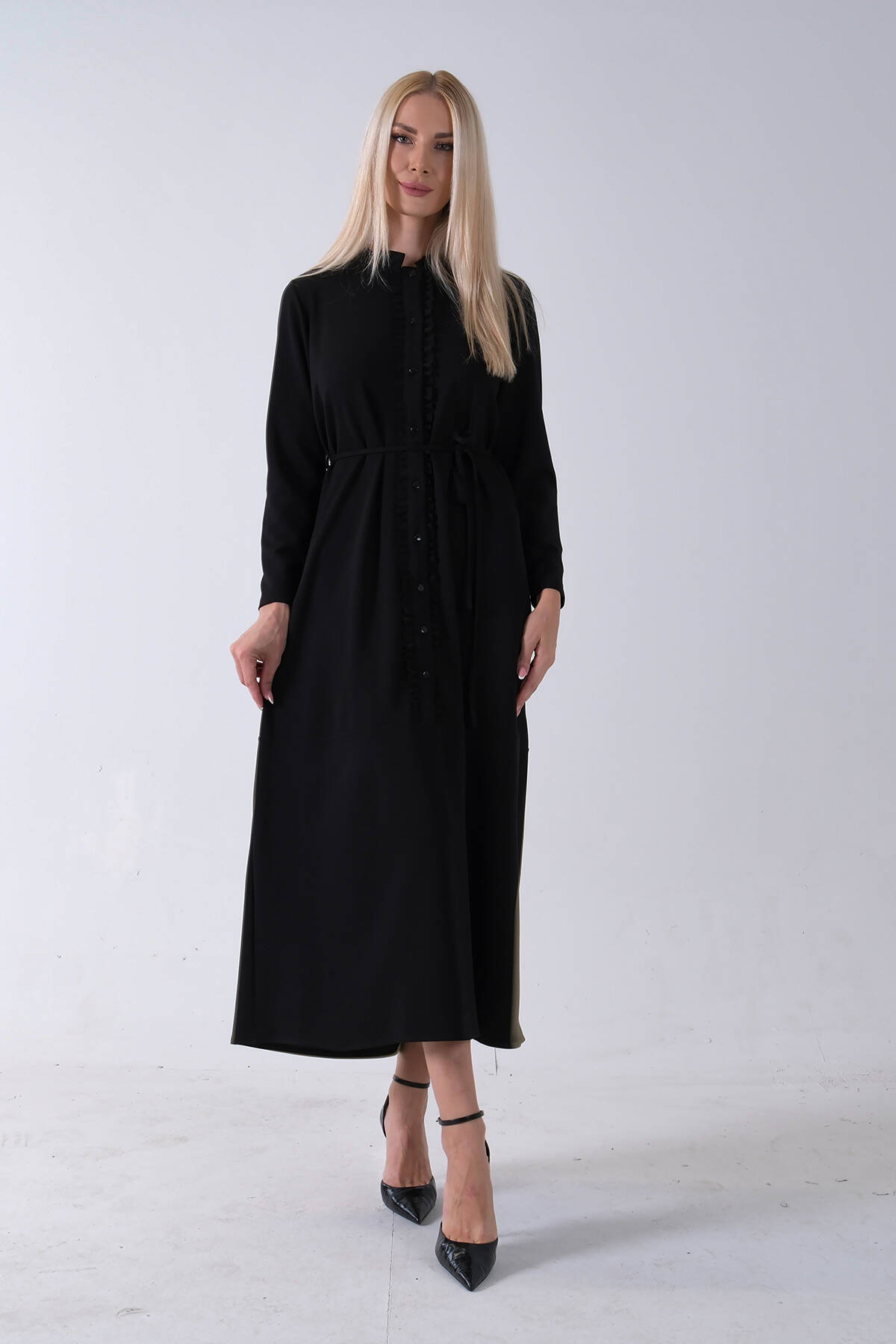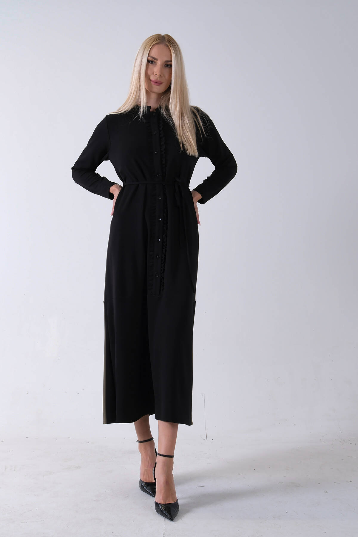 Siyah Belden Bağlamalı Yaka Fırfır Detaylı Düğme Kapamalı Elbise 4571574.01