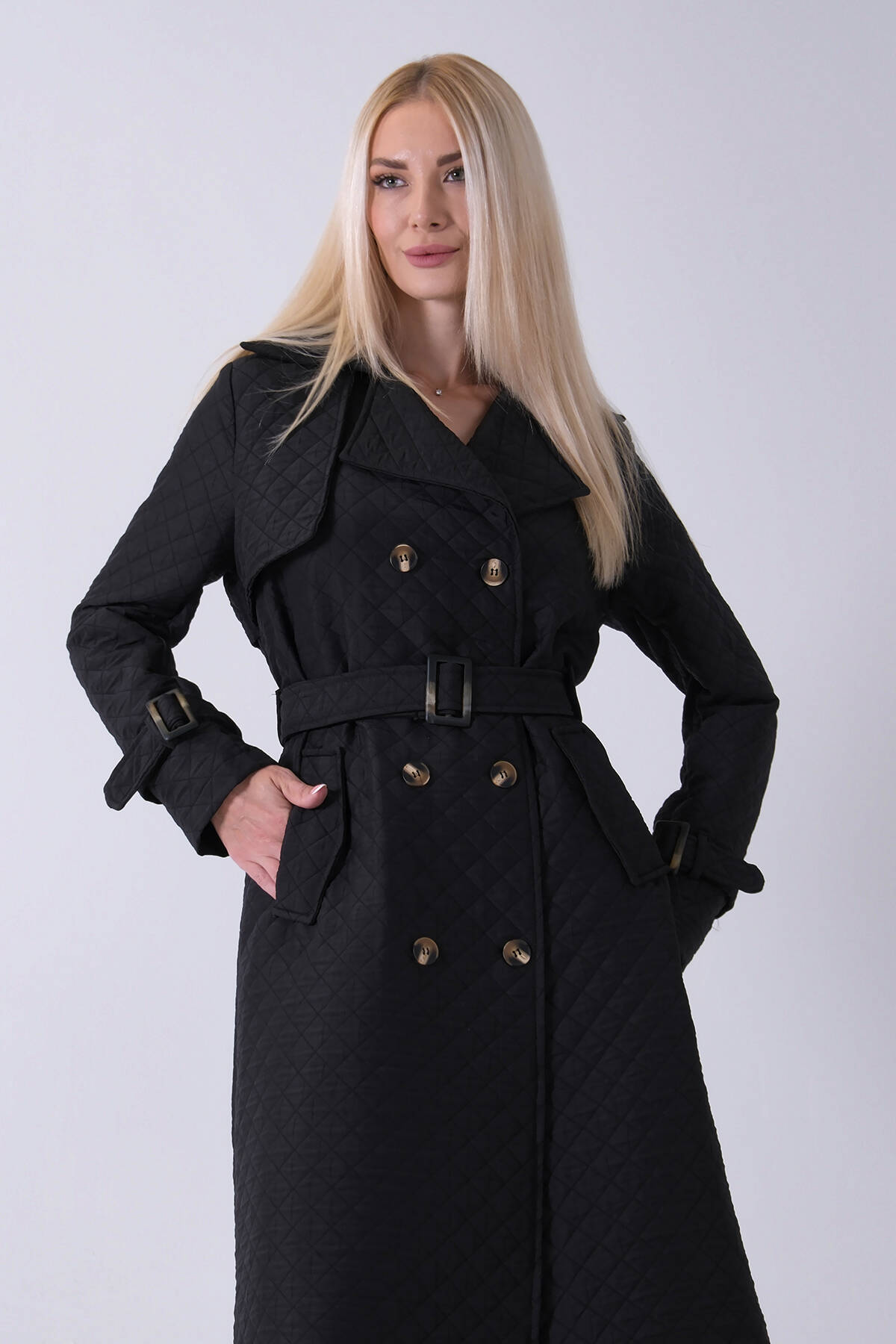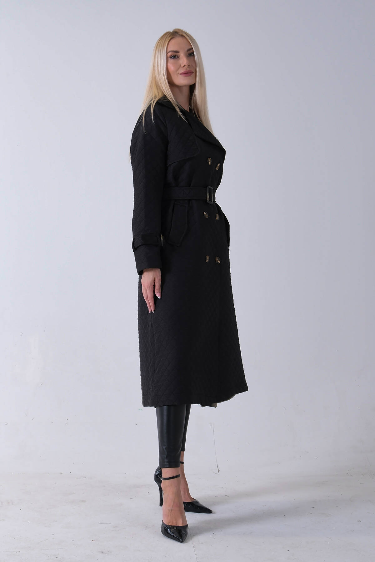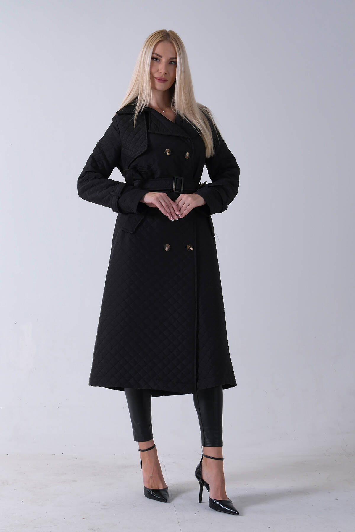 Siyah Beli Kemerli Düğme Kapamalı Kapitone Desenli Trenç 44520205.01