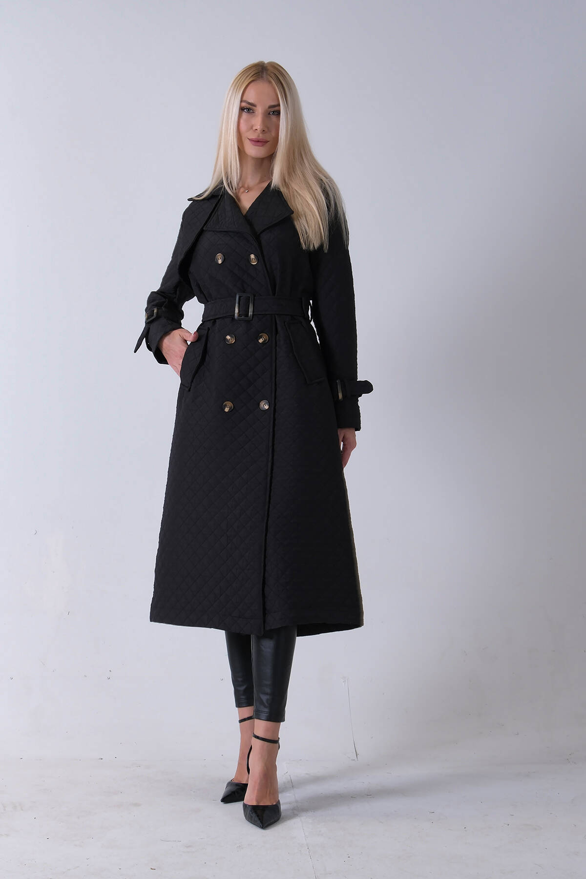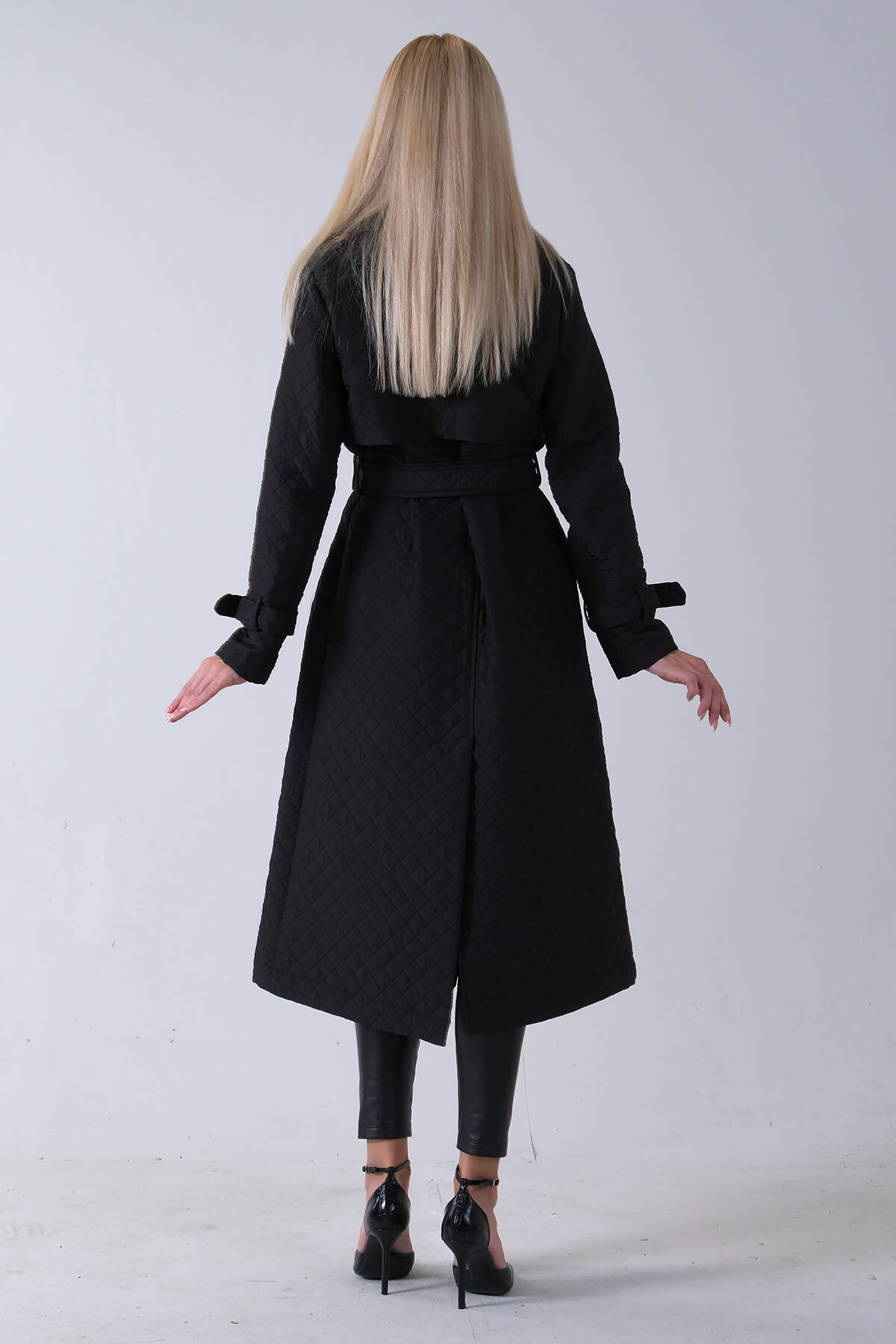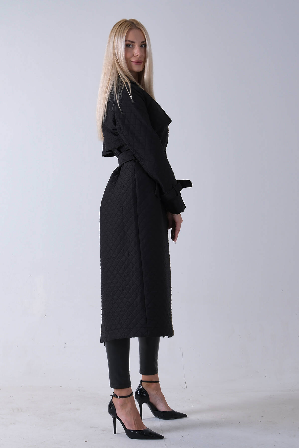 Siyah Beli Kemerli Düğme Kapamalı Kapitone Desenli Trenç 44520205.01