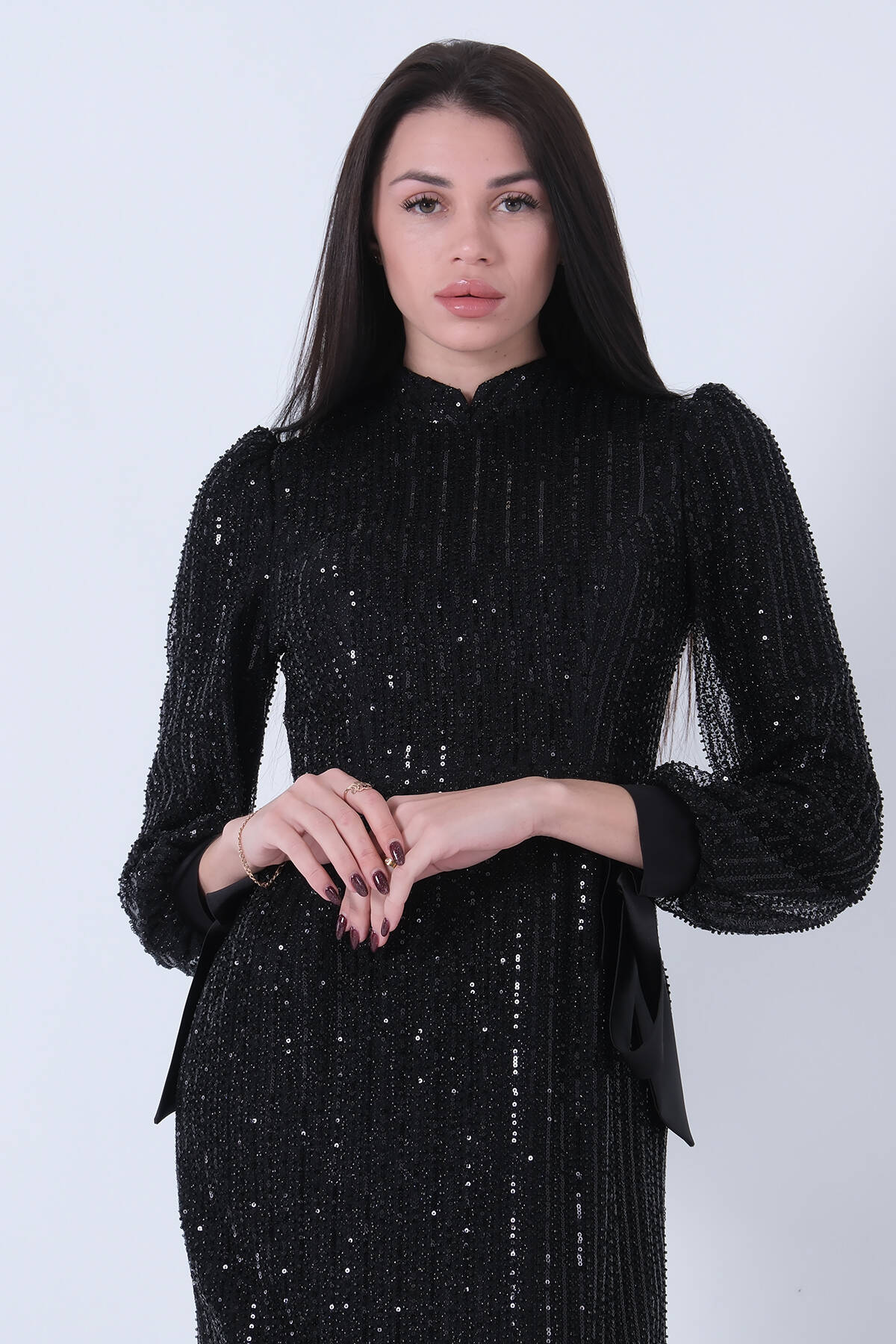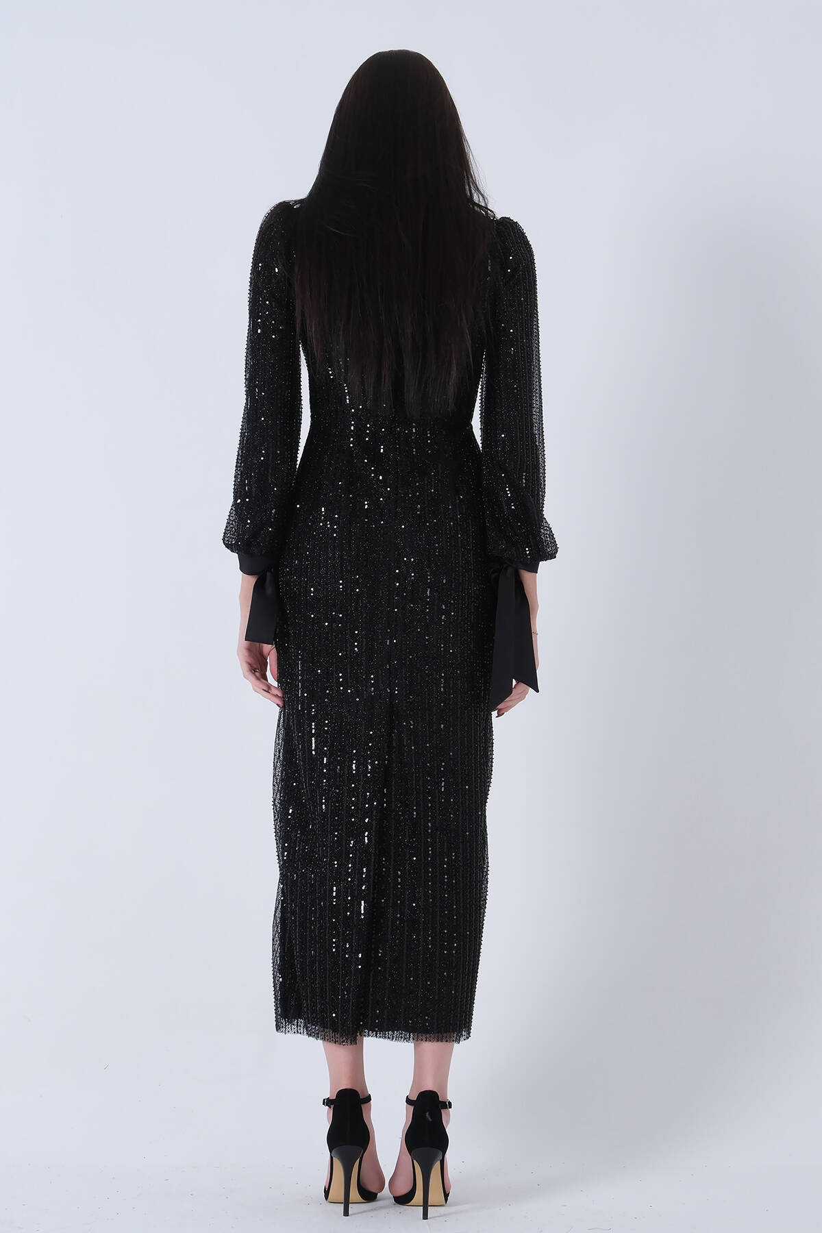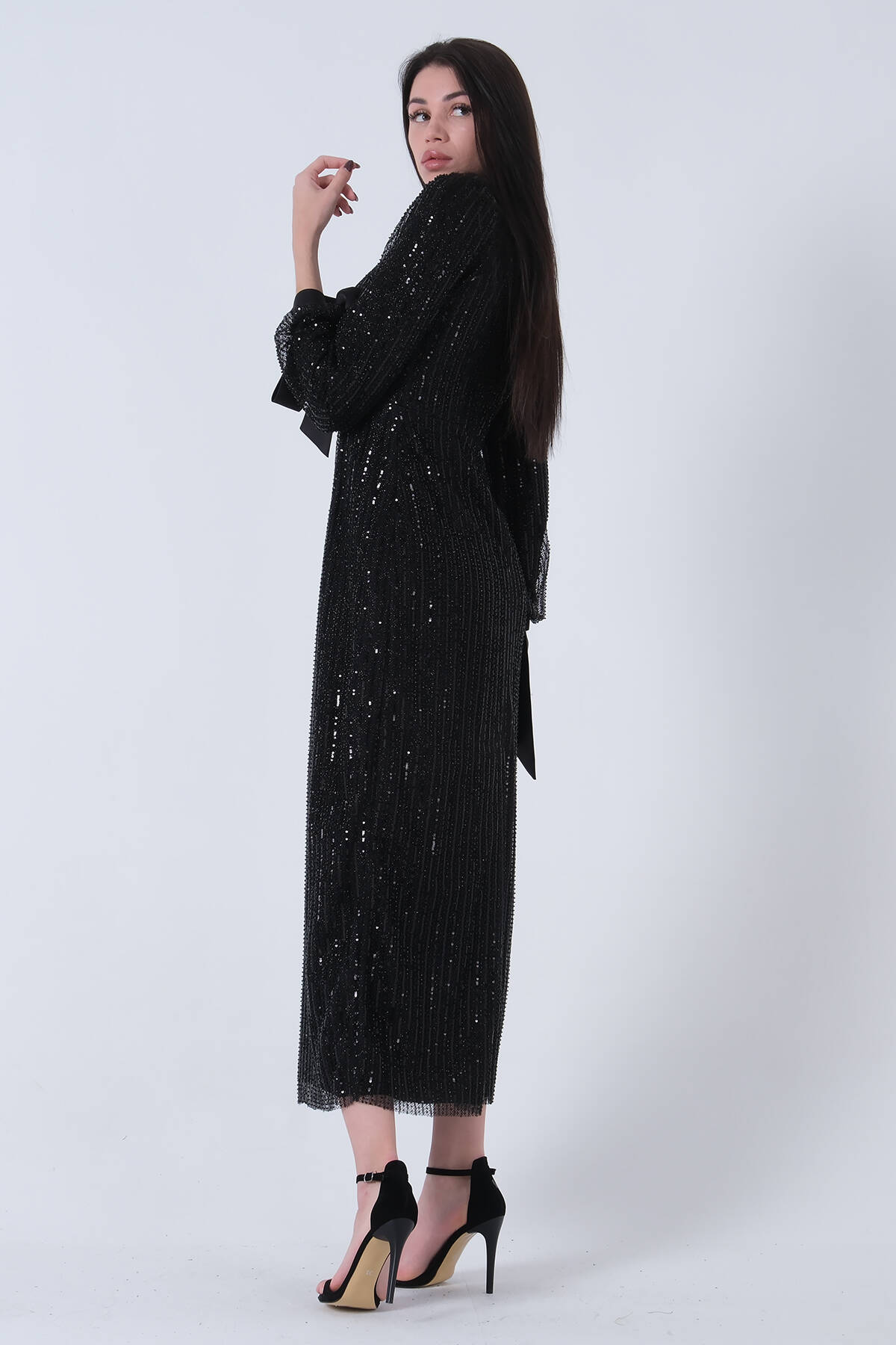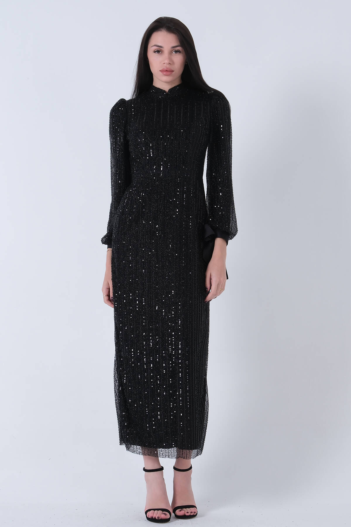 Siyah Bilek Ucu Saten Kurdele Pullu Tesettür Abiye 6502471.01