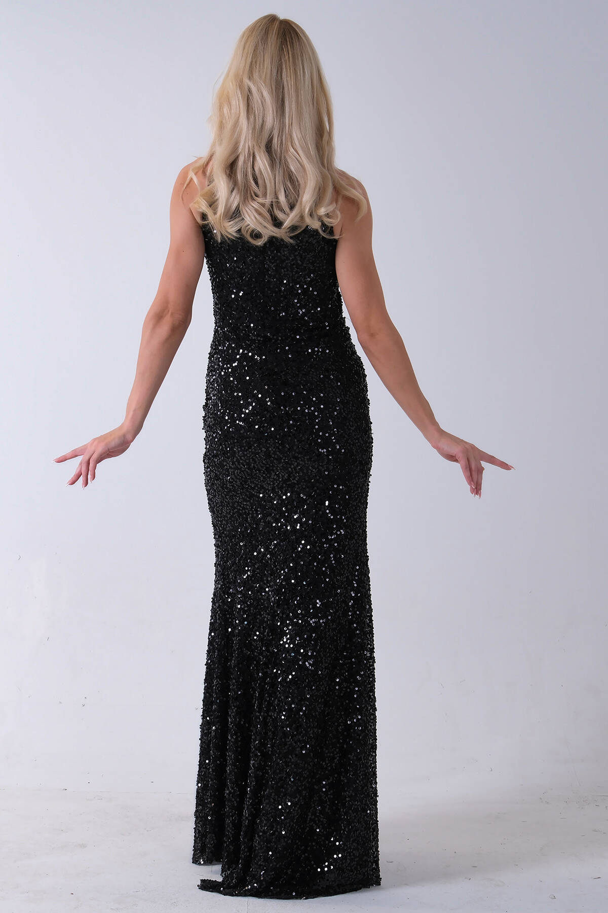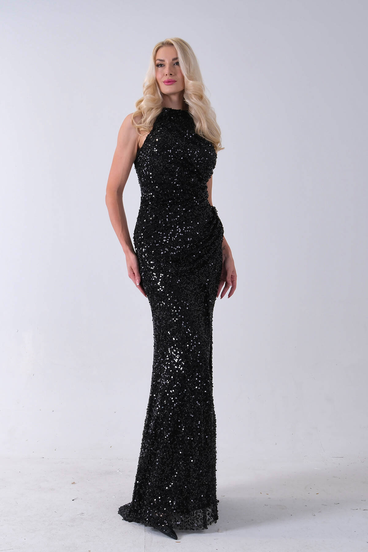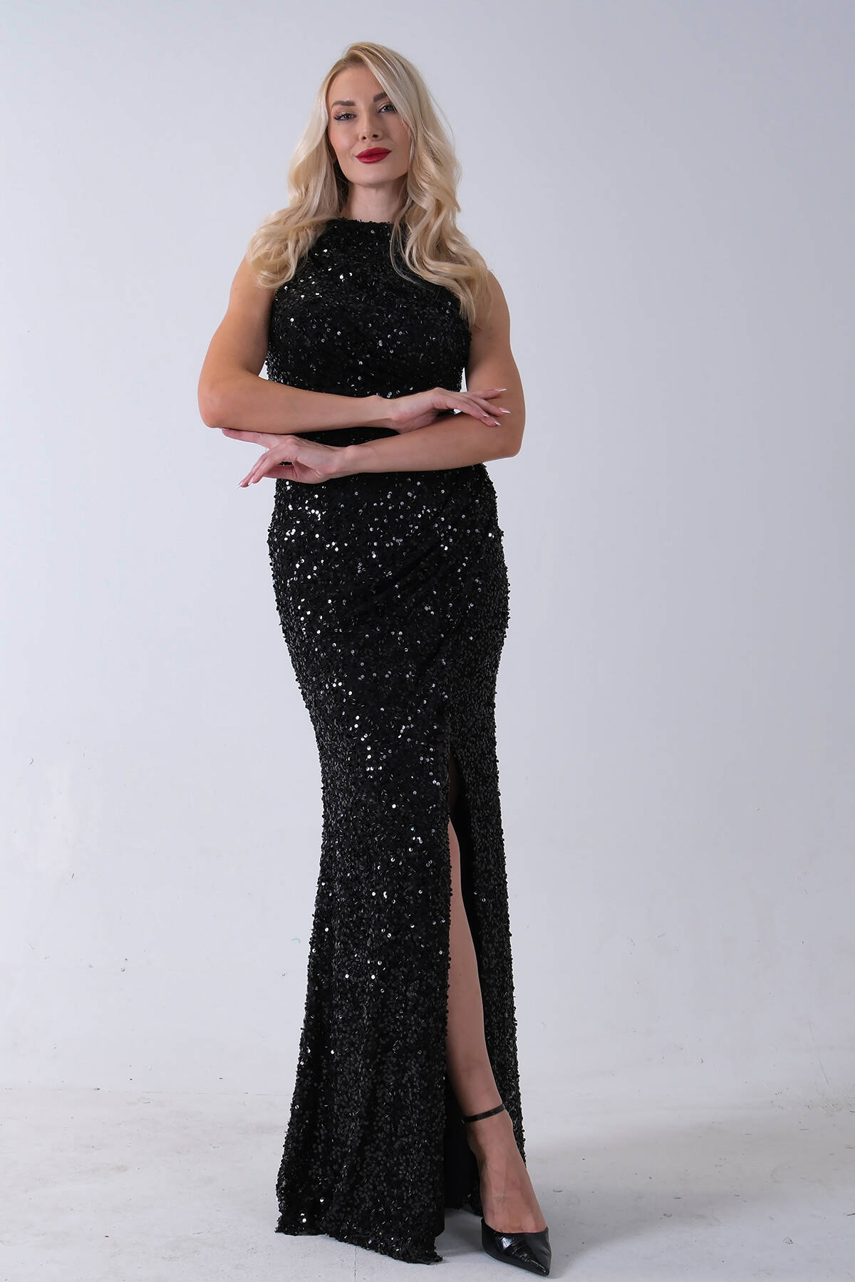 Siyah Bisiklet Yaka Kolsuz Yırtmaç Detaylı Pul Payet Abiye 9705482.01