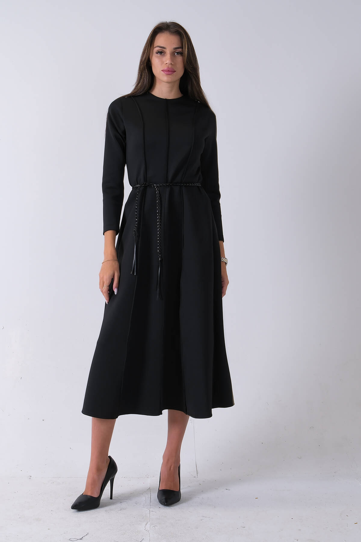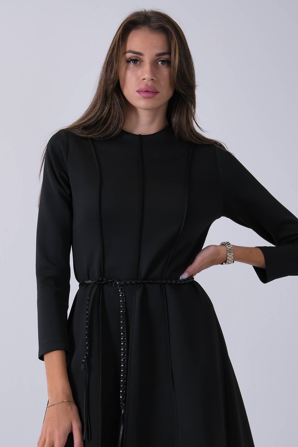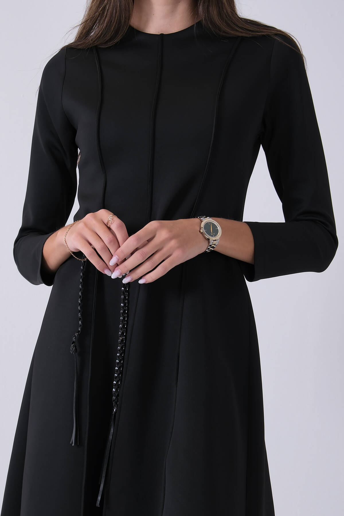 Siyah Bisiklet Yaka Önü Pile Detaylı Beli Kemerli Elbise 4593453.01