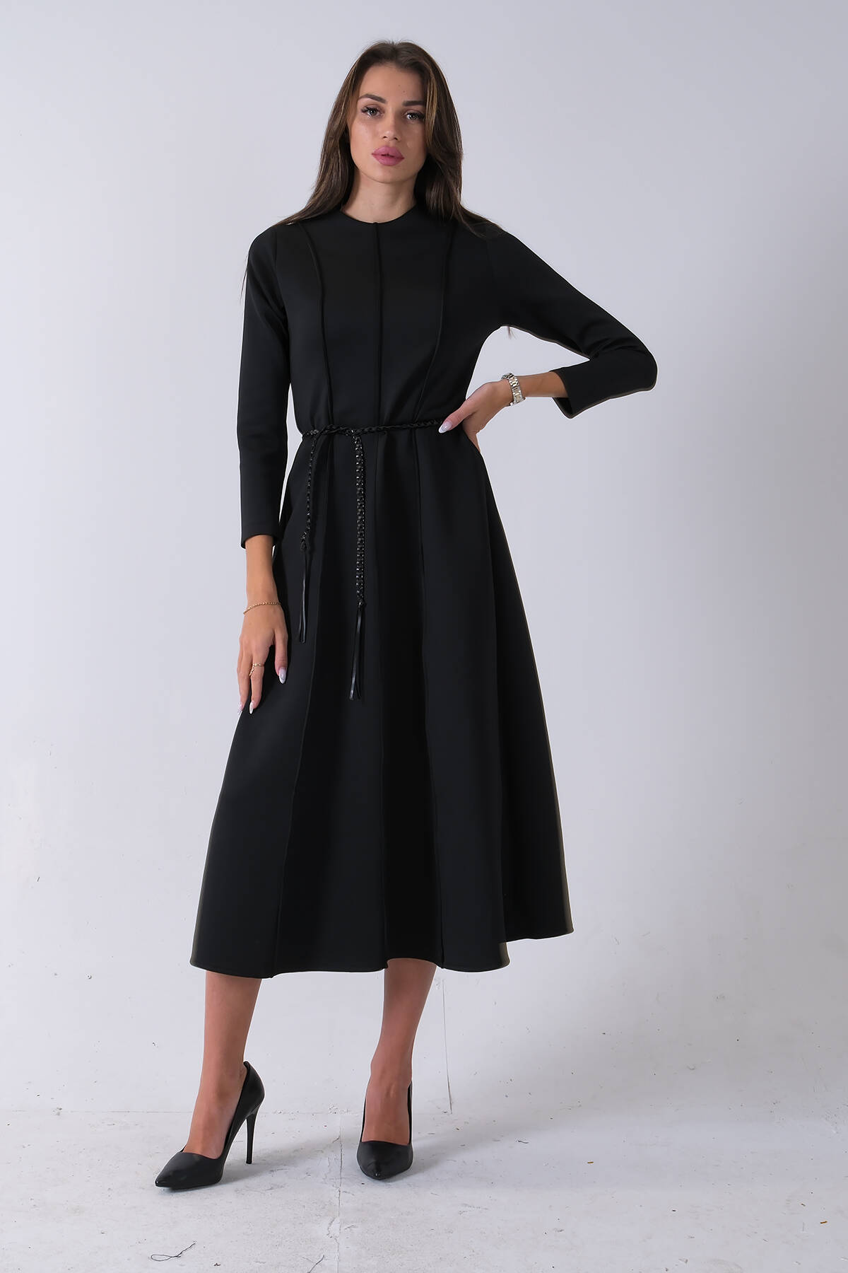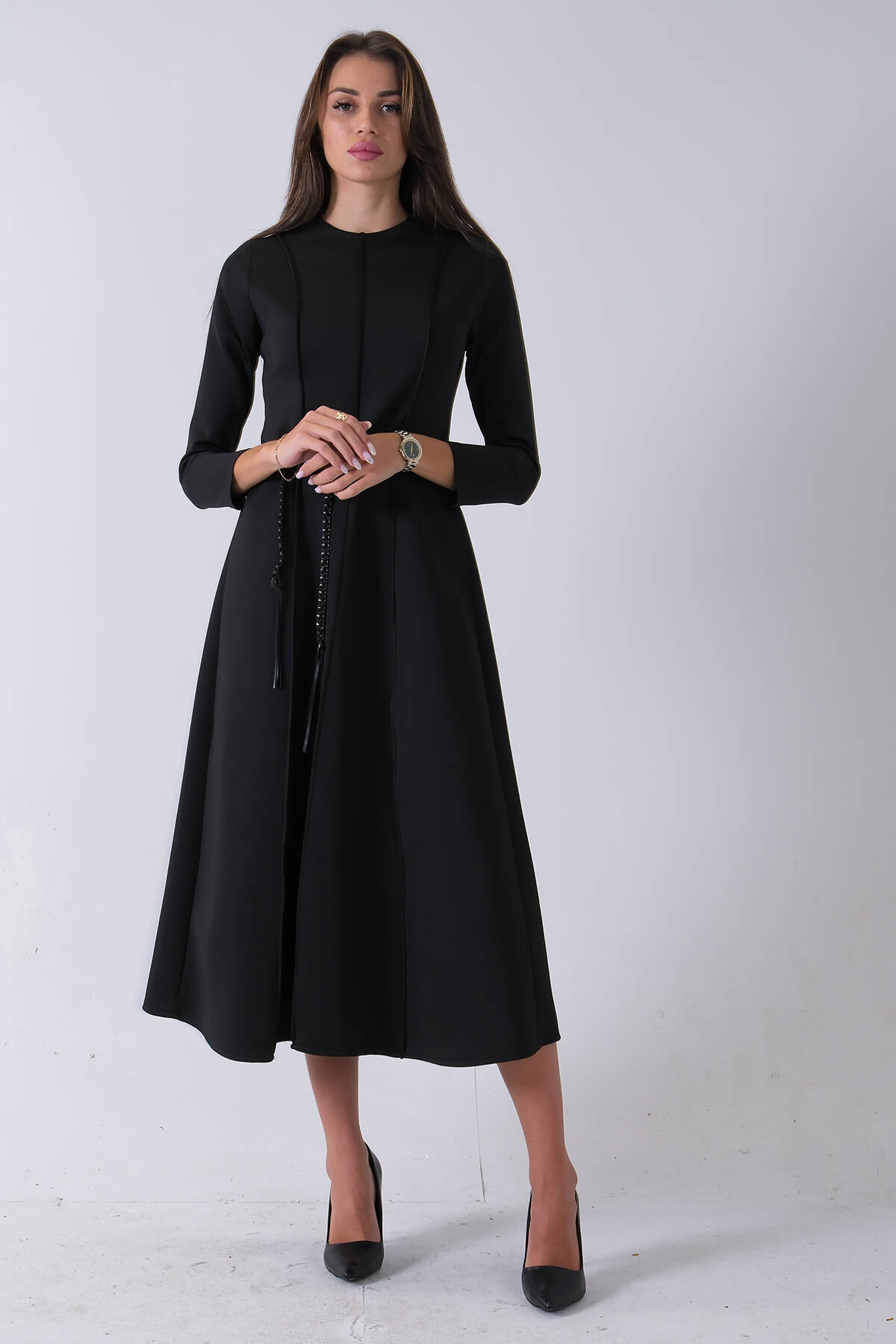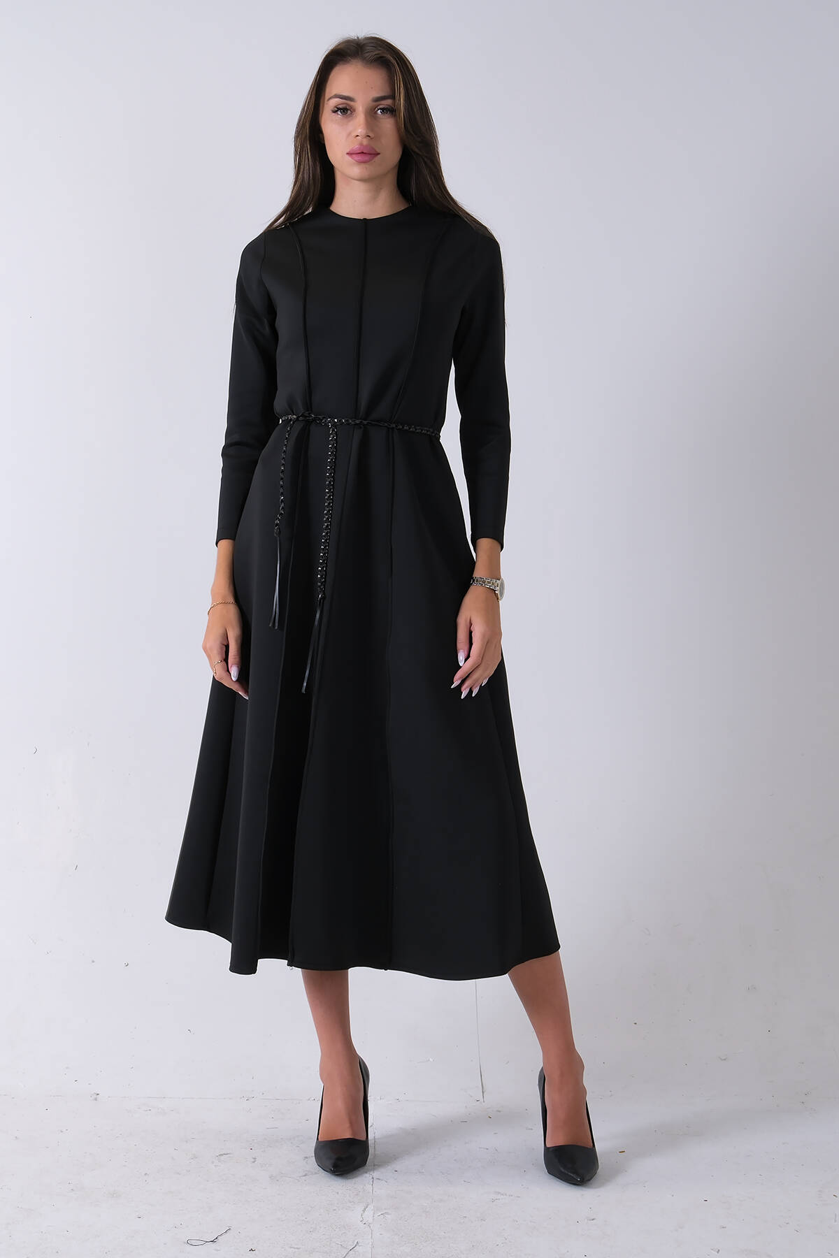 Siyah Bisiklet Yaka Önü Pile Detaylı Beli Kemerli Elbise 4593453.01