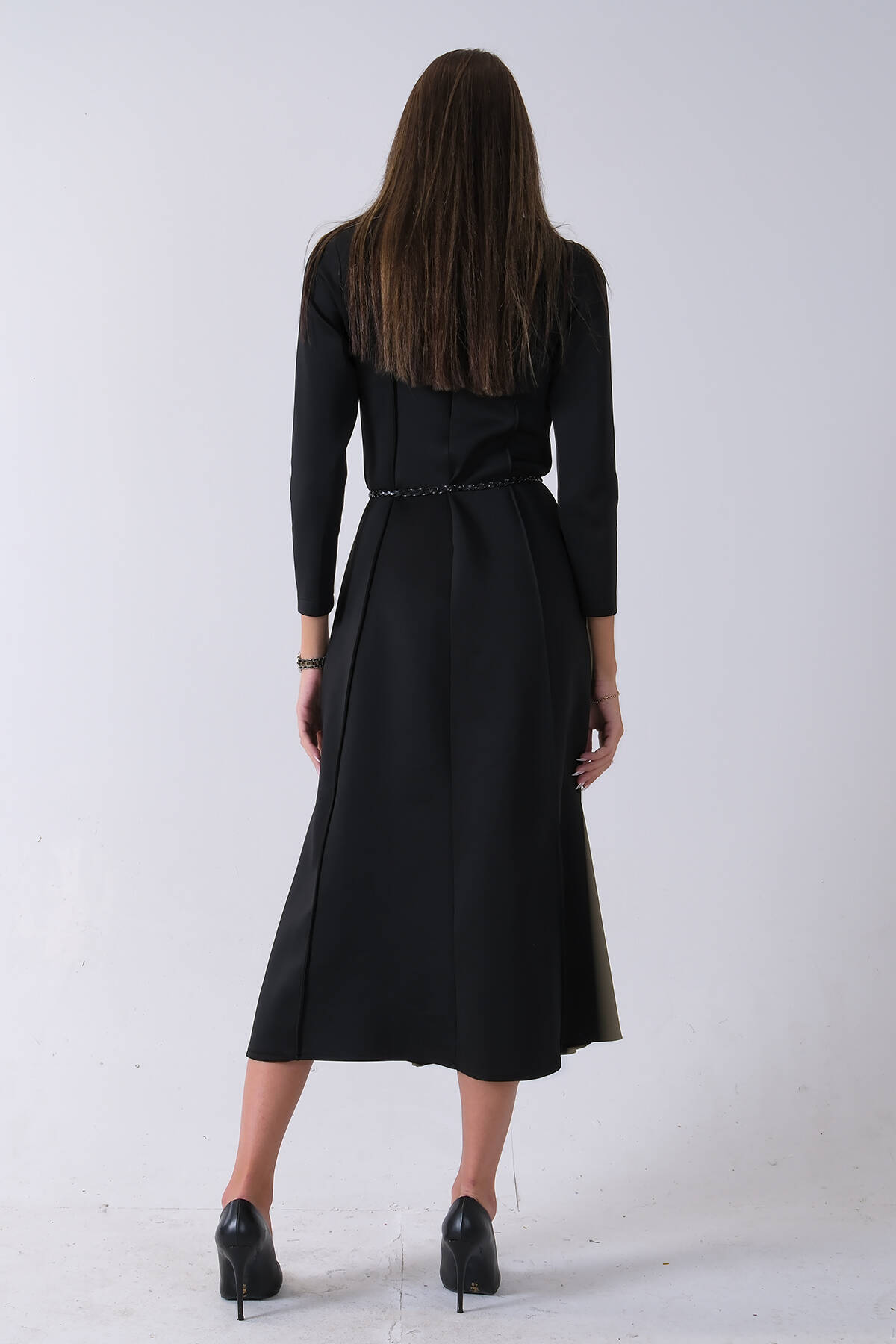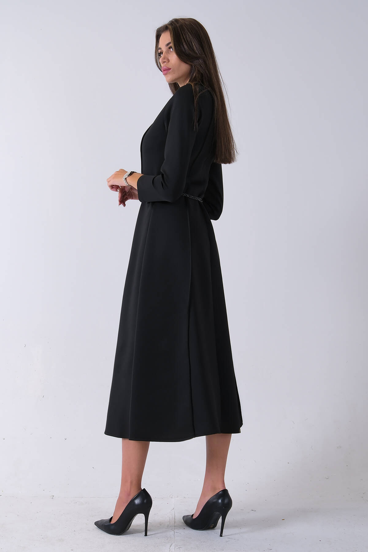 Siyah Bisiklet Yaka Kendinden Şal Detaylı Broşlu Bel Bağlamalı Elbise 4571580.01