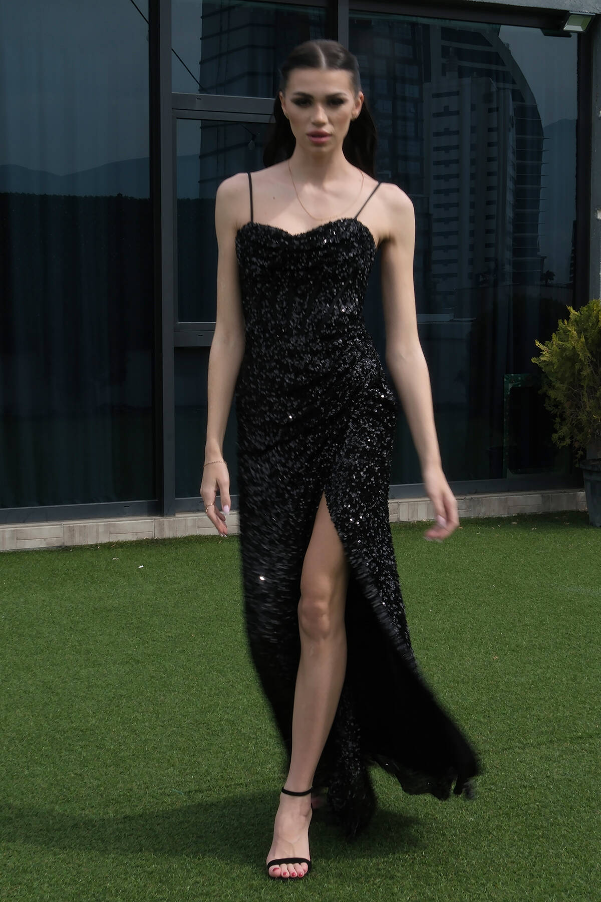 Siyah Drapeli Parlak Pul Payetli Askılı Abiye 9705539.01