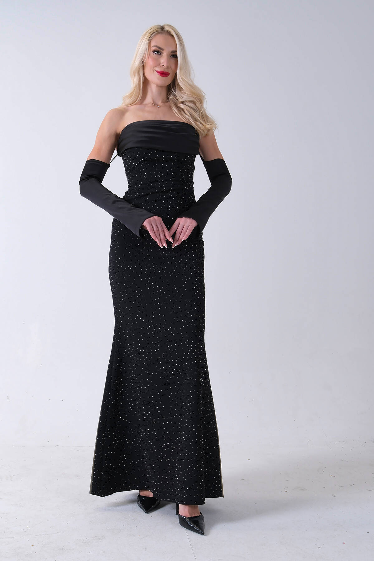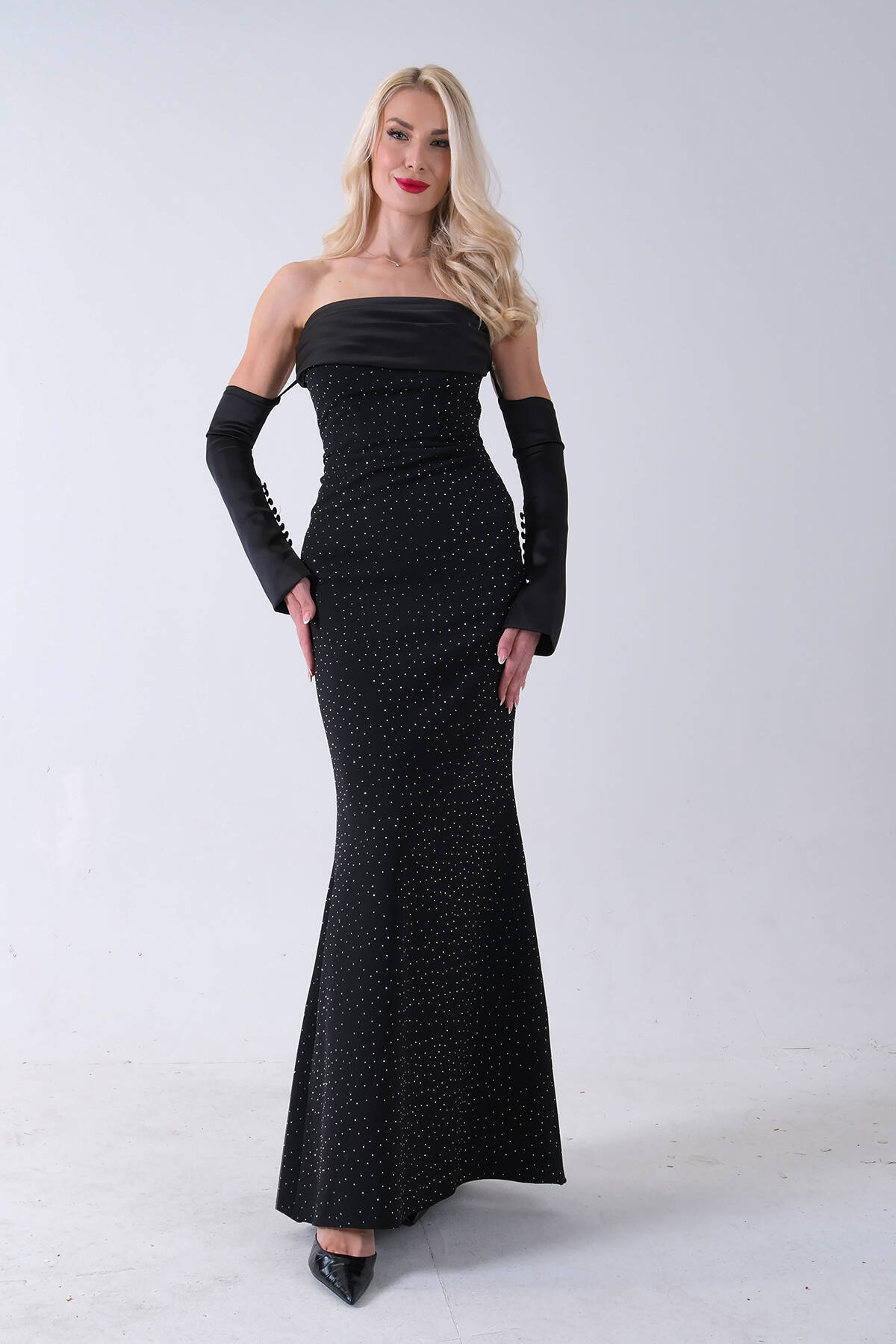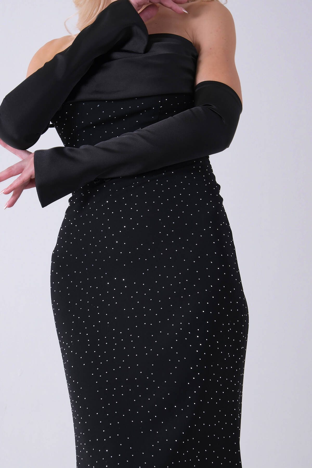 Siyah Drapeli Üzeri Işıltı Nokta Detaylı Kollu Abiye 0802502.01