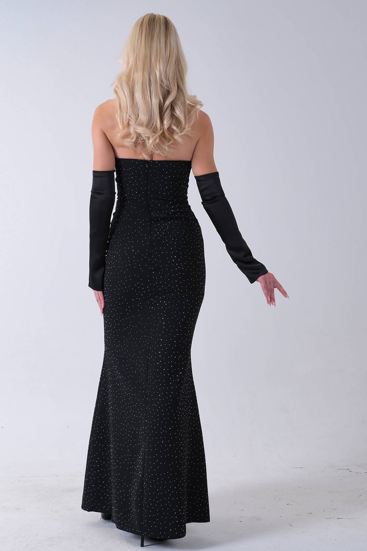 Siyah Önü Taş Detaylı Yırtmaçlı Pul Payet Straplez Abiye 0801163.01
