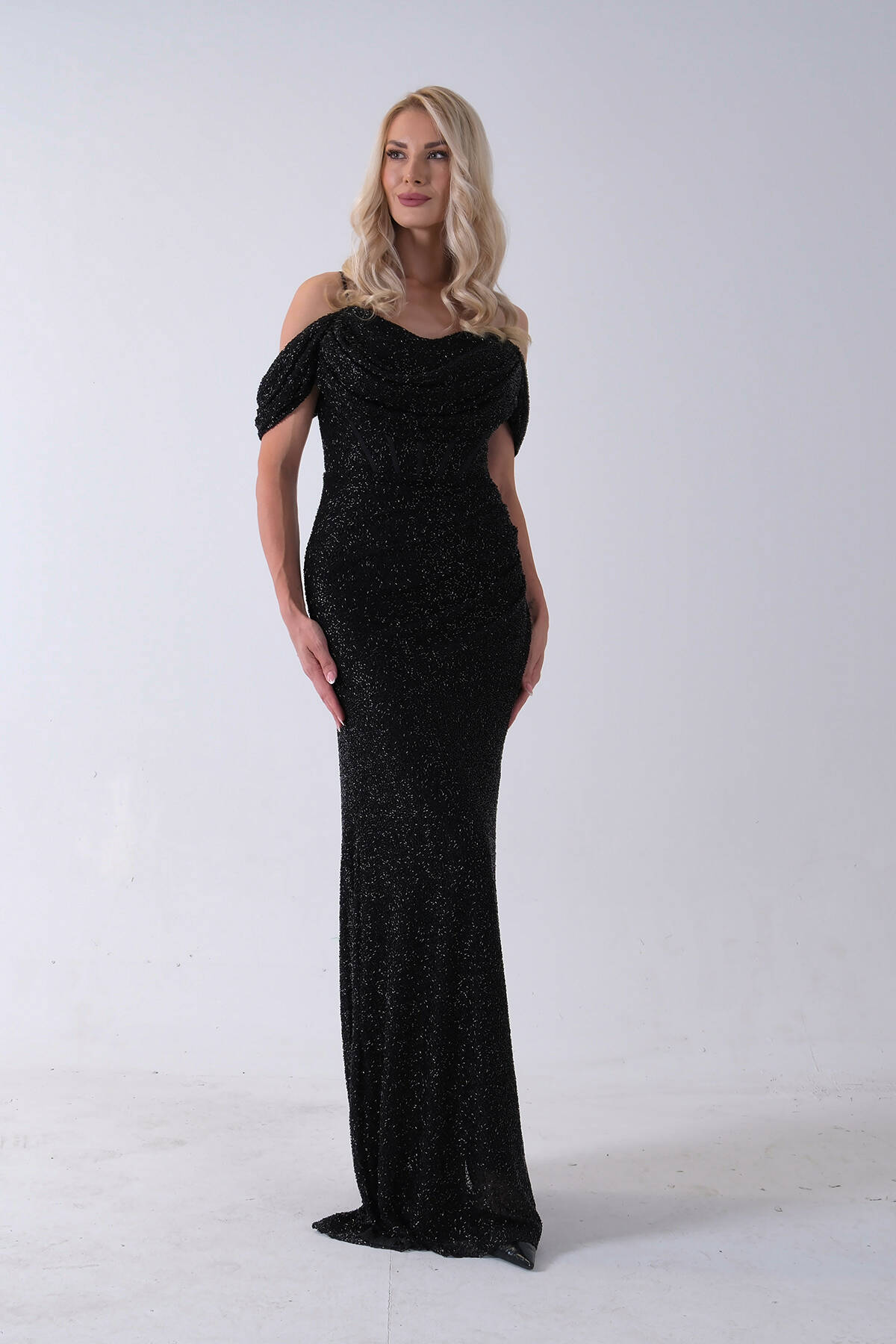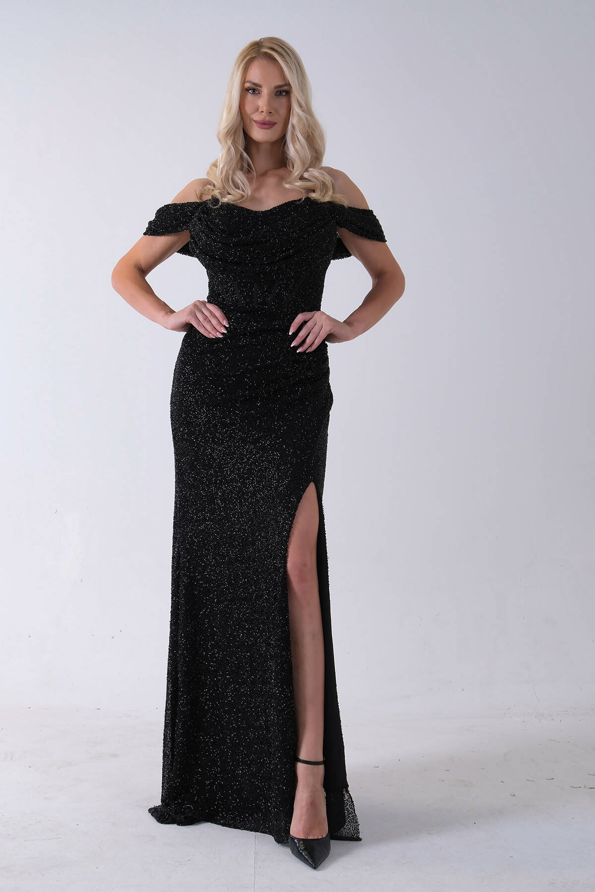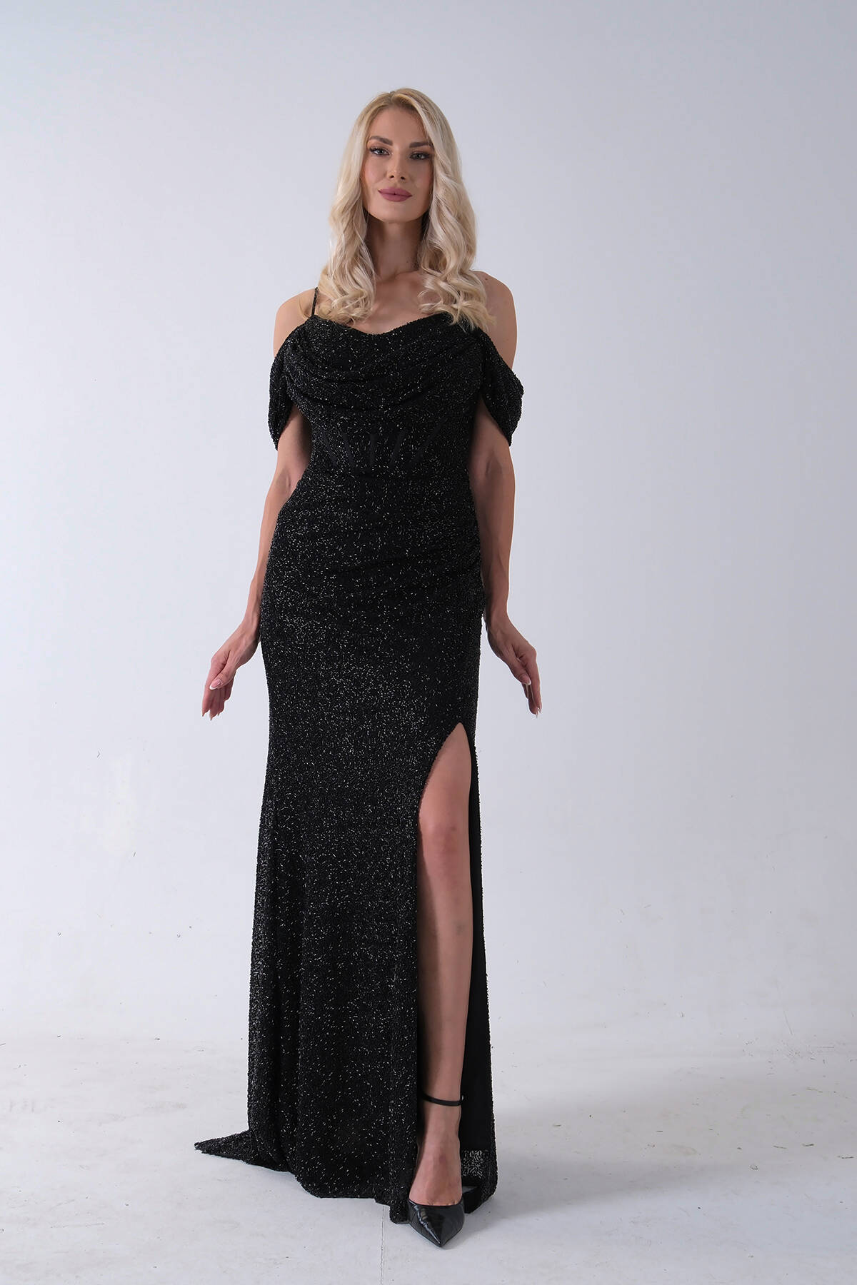 Siyah Düşük Omuz Yırtmaç Detaylı Pul Payet Abiye 9705646.01