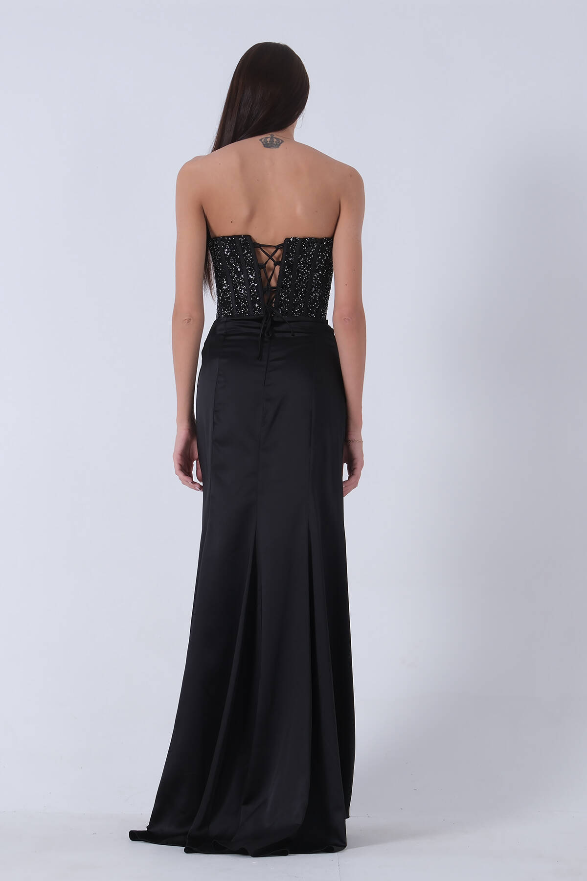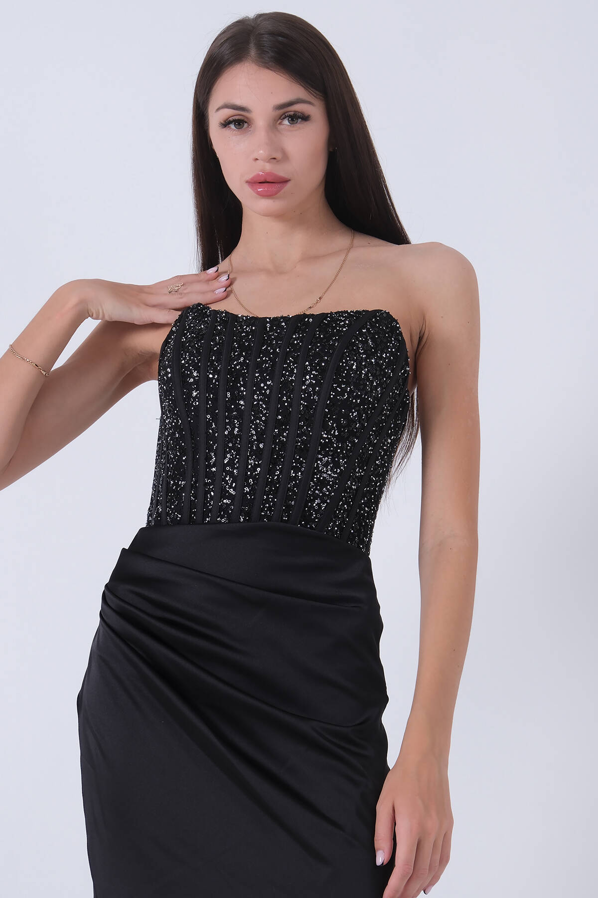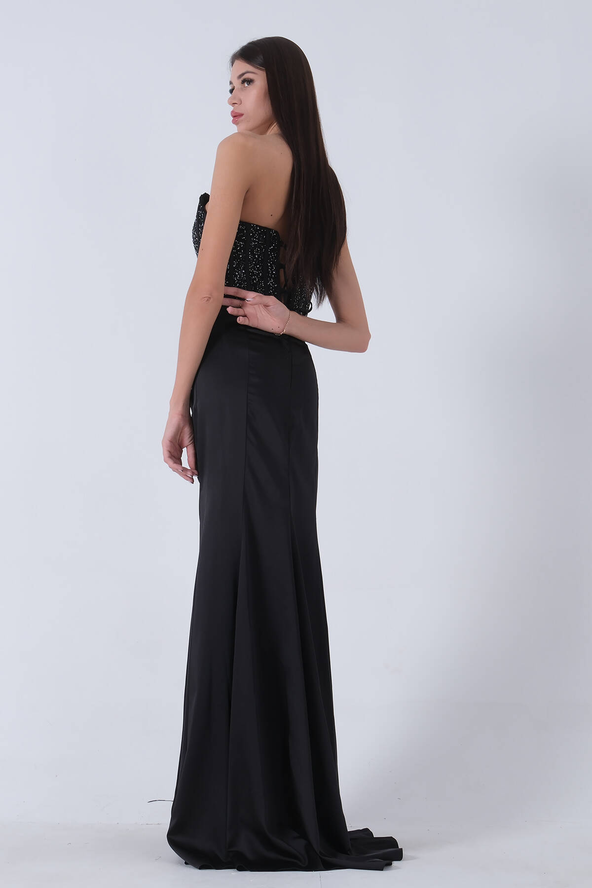 Siyah Önü Taş Detaylı Yırtmaçlı Pul Payet Straplez Abiye 0801163.01