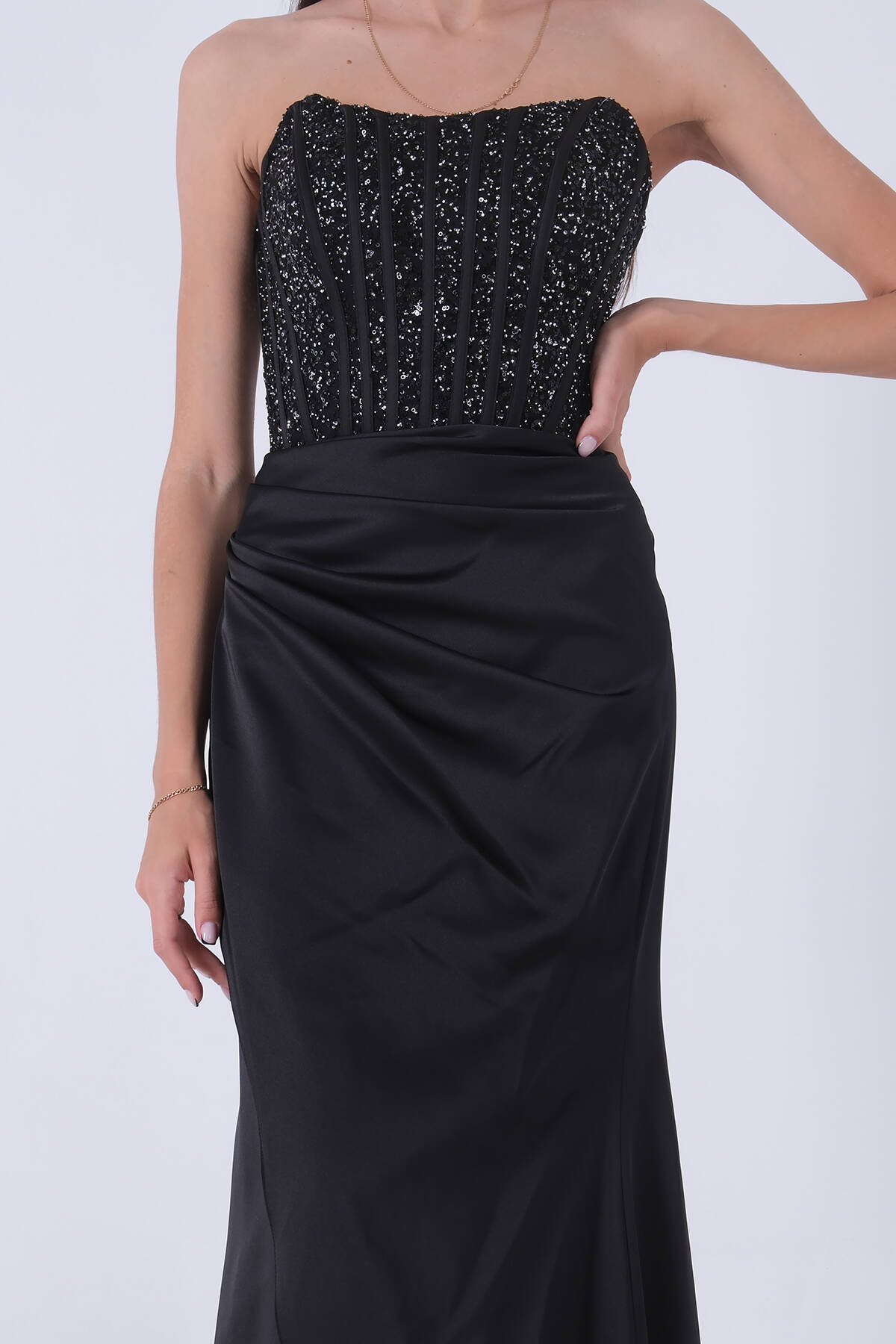 Siyah Göğüs Pul ve Taşlı Saten Abiye 9705294.01