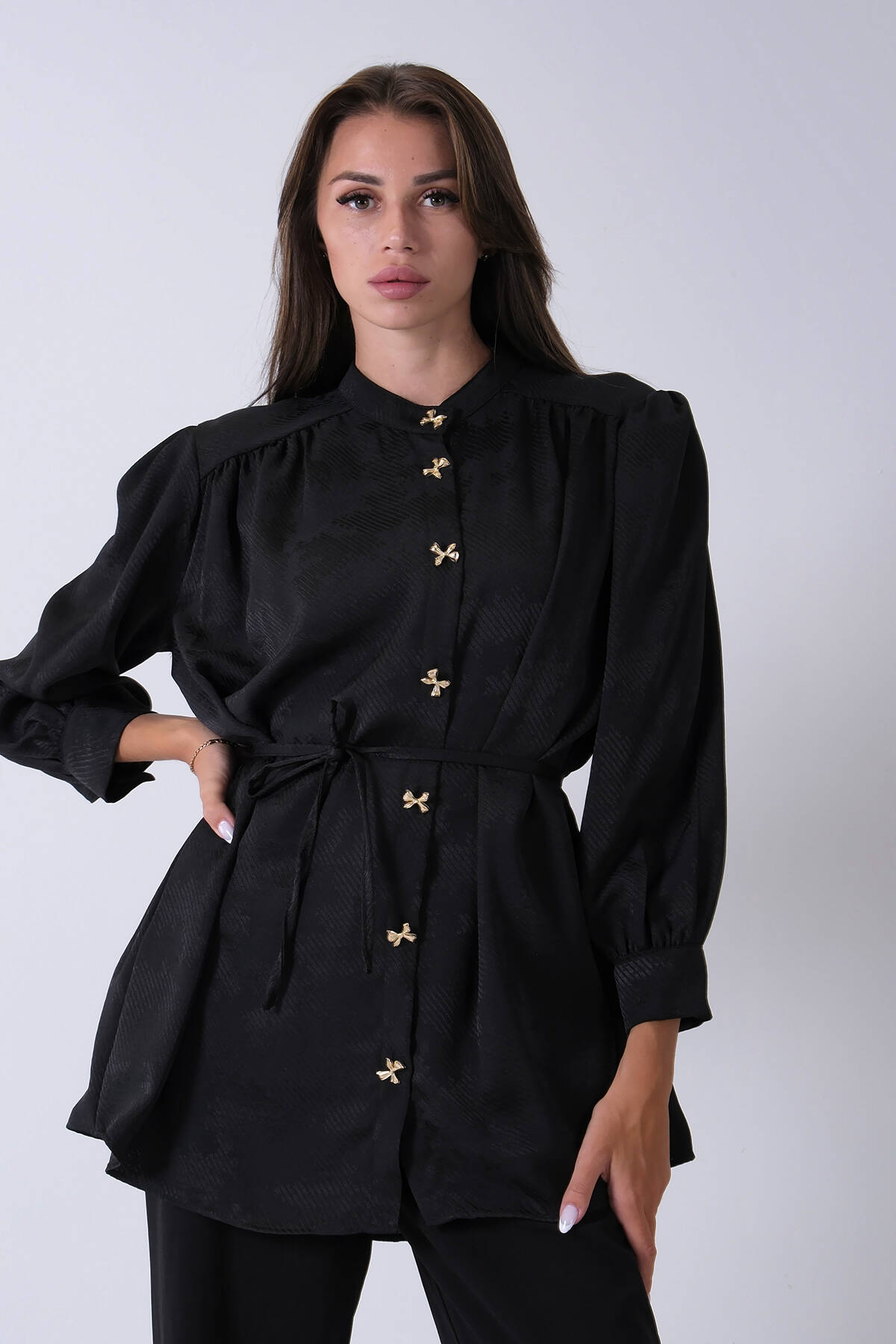 Siyah Hakim Yaka Bel Bağlamalı Desenli Tunik 4595333.01