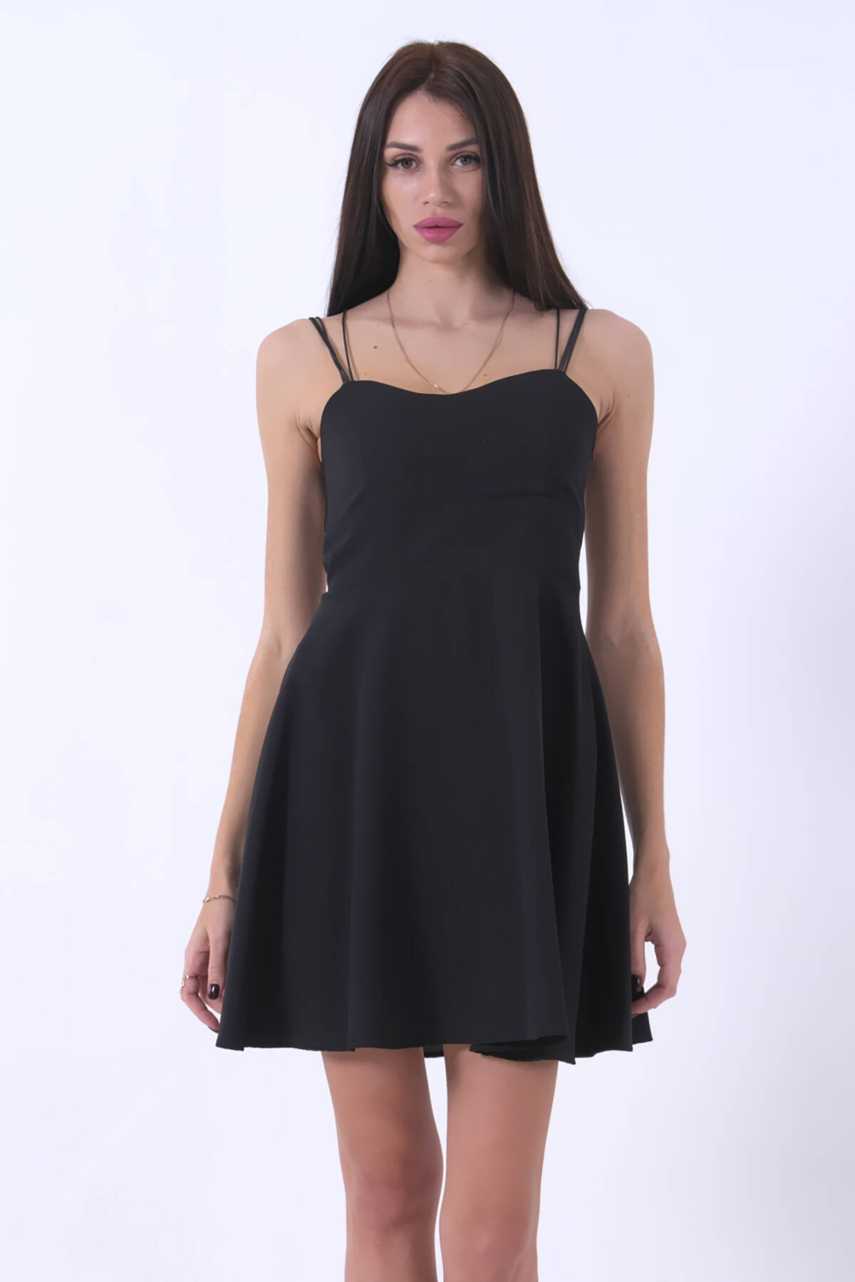 Siyah İnce Askılı Sırt Dekolteli V Yaka Kloş Abiye Elbise & Mezuniyet Elbisesi 0104026.01