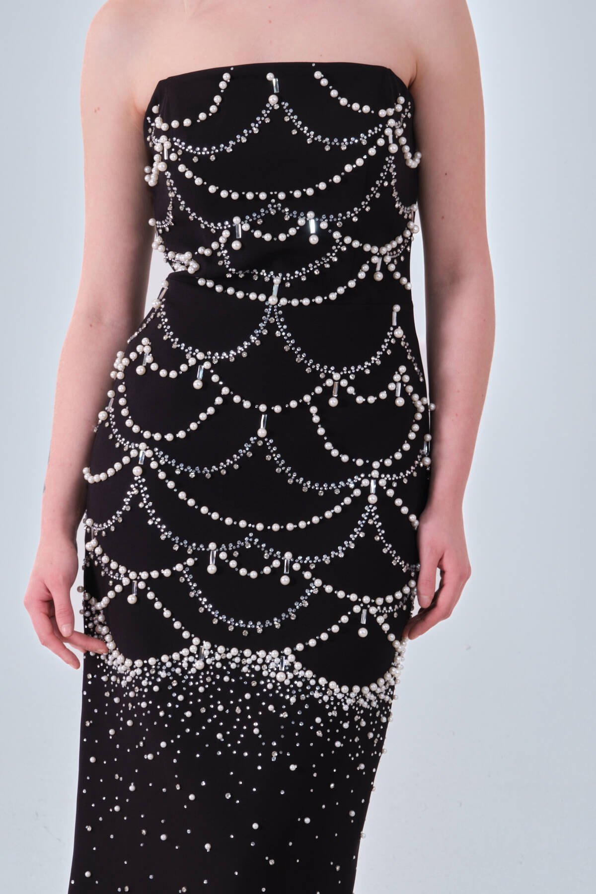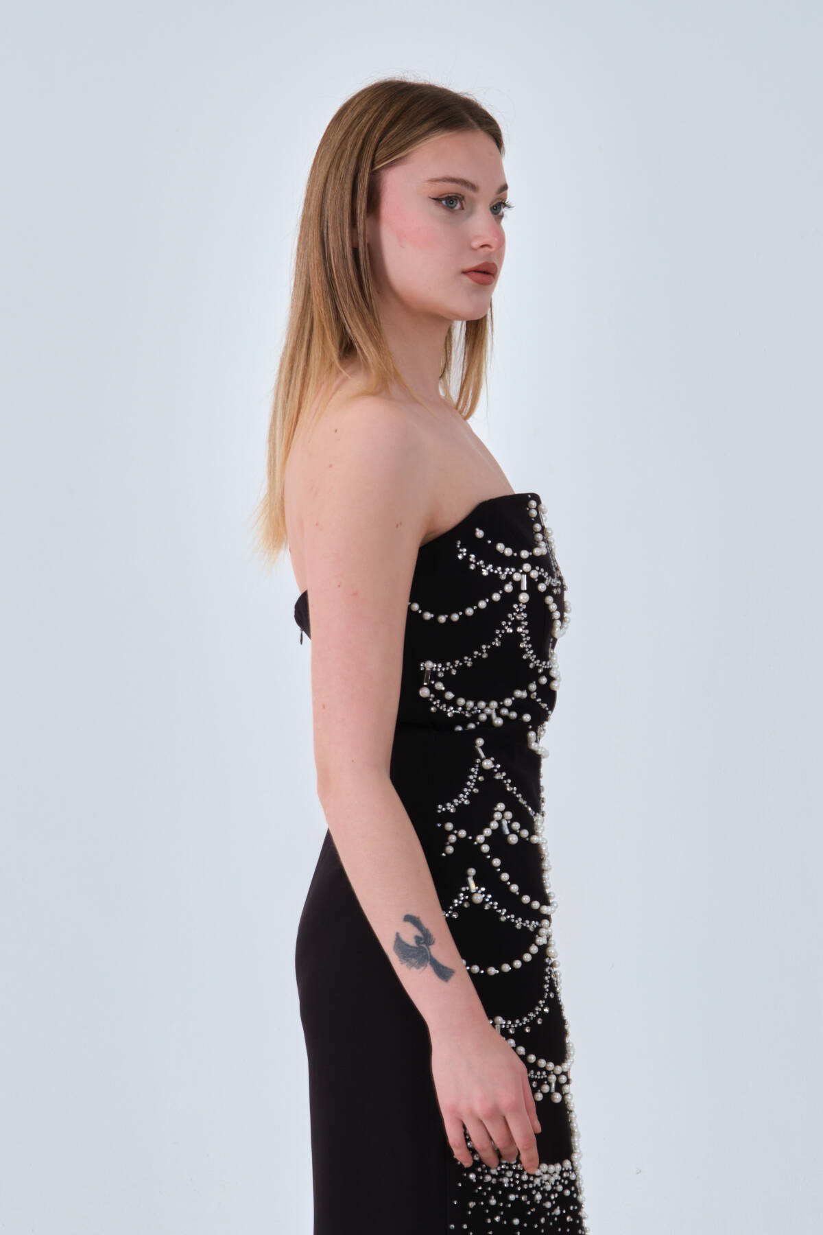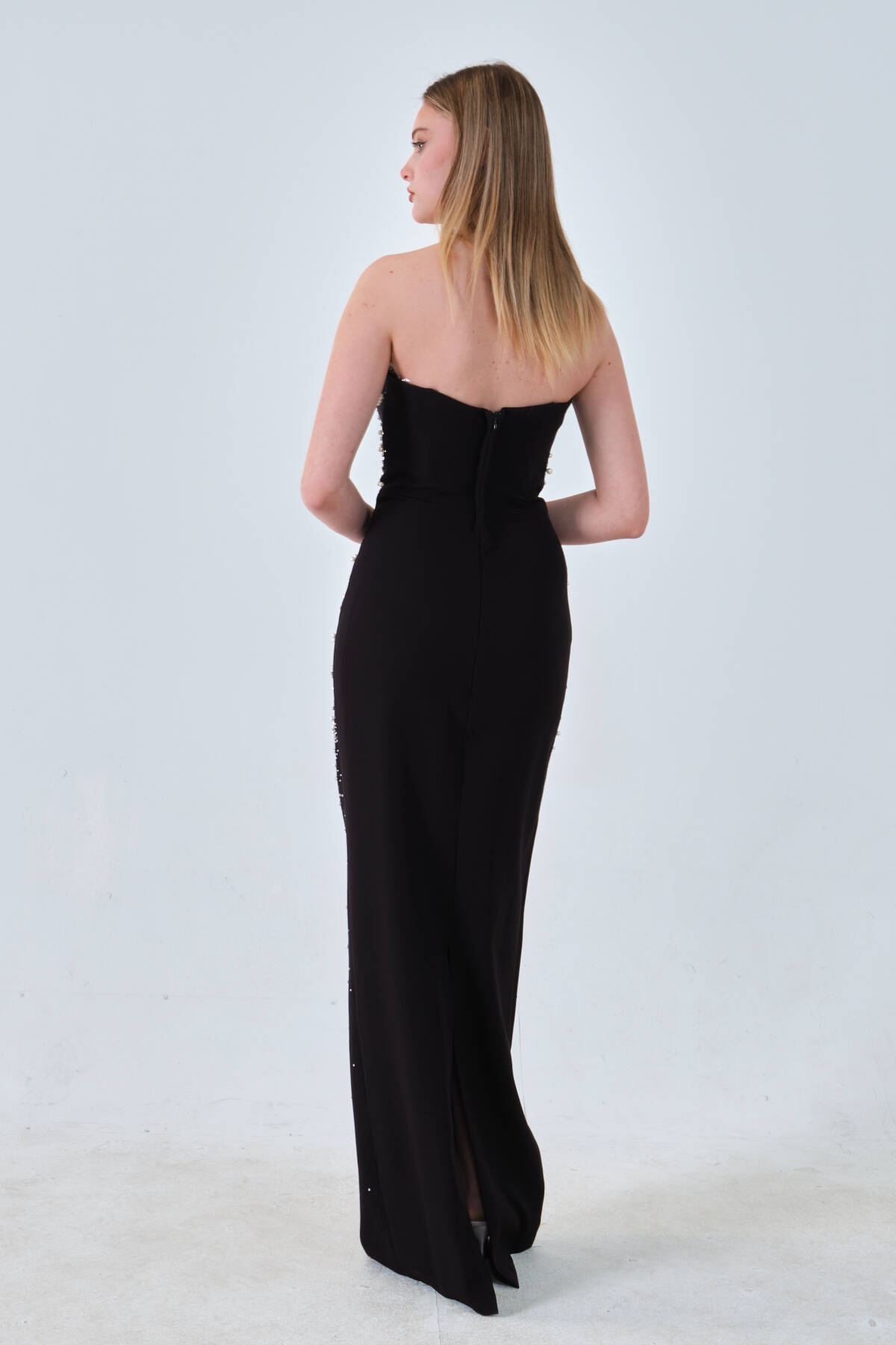 Siyah İnci ve Kristal Taş İşlemeli Straplez Abiye 0801139.01