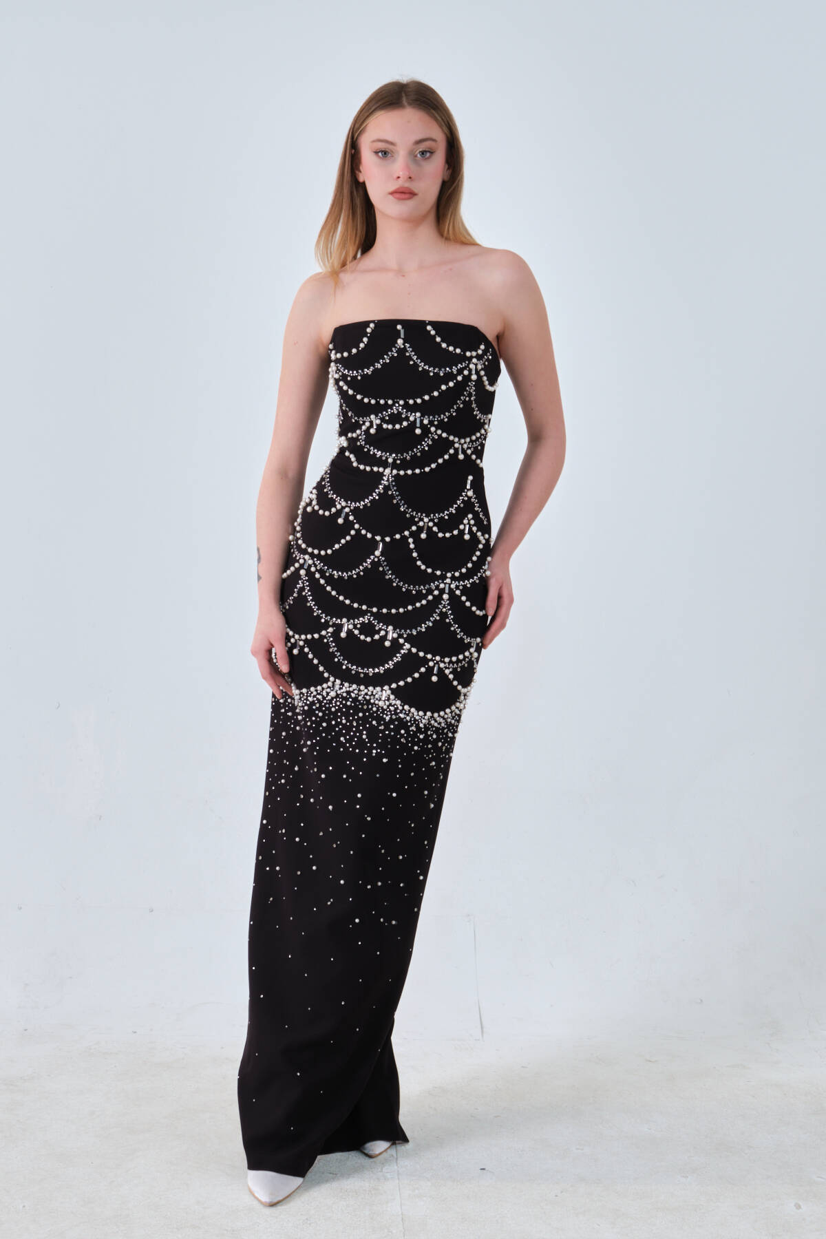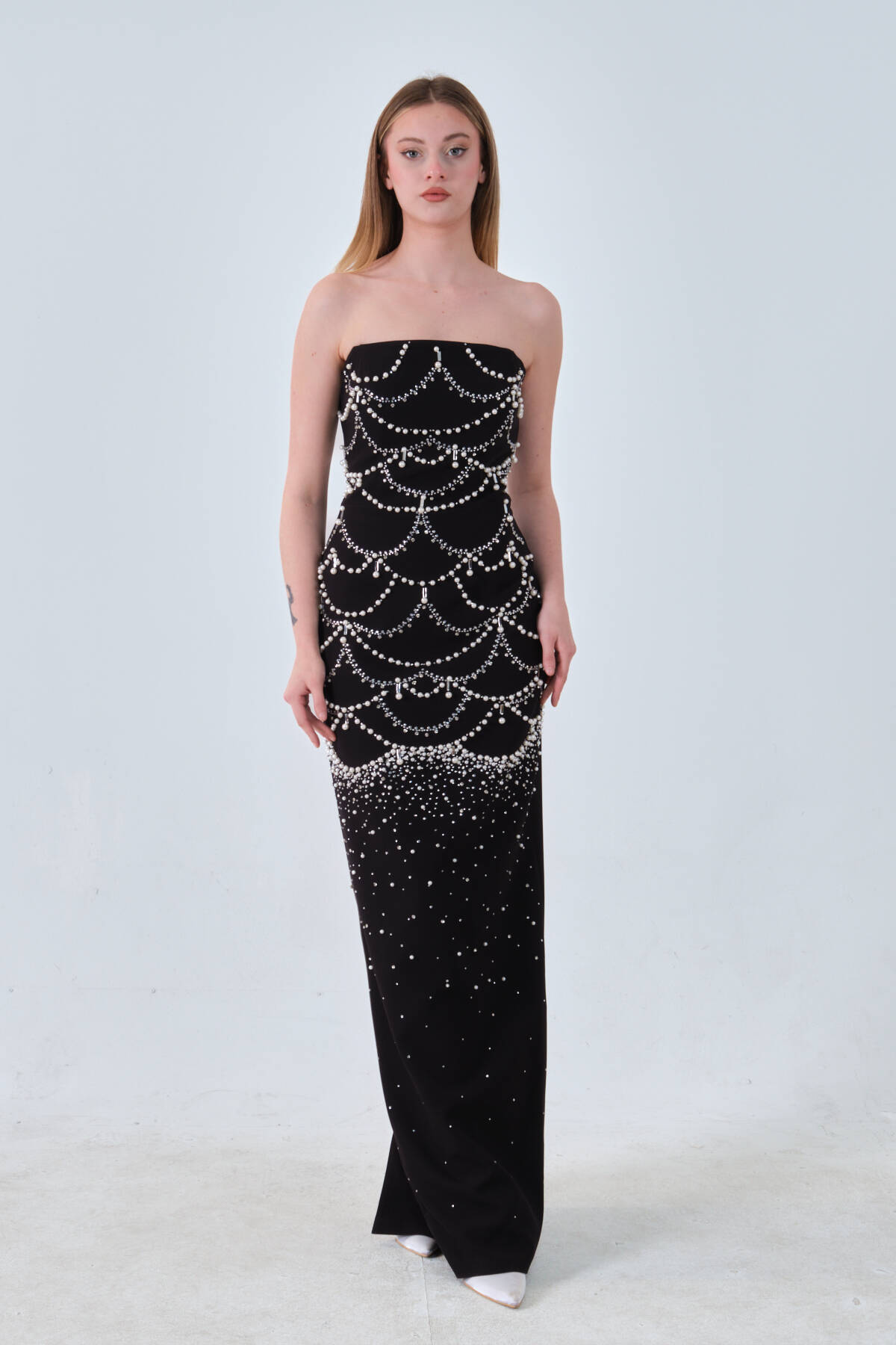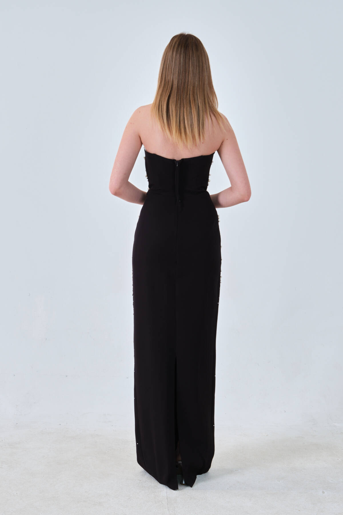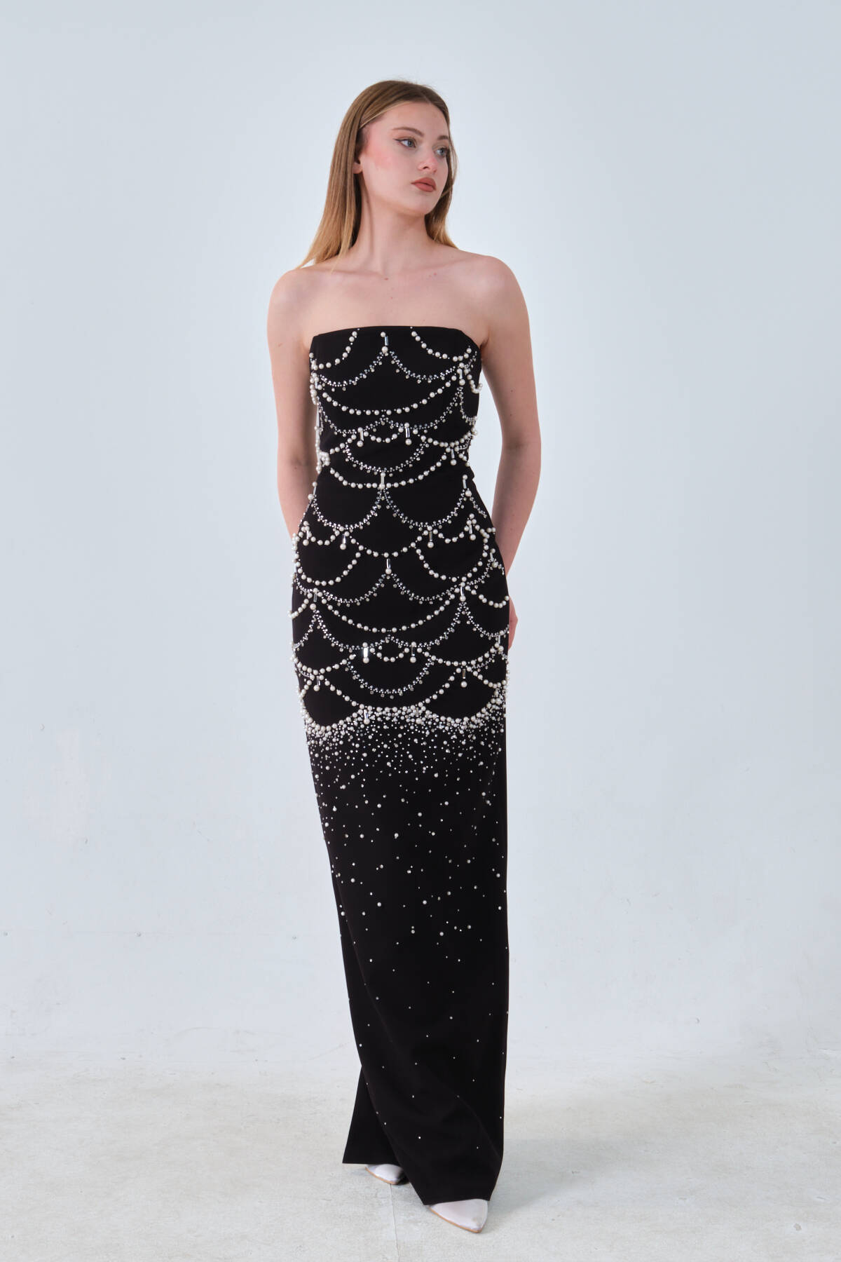 Siyah İnci ve Kristal Taş İşlemeli Straplez Abiye 0801139.01