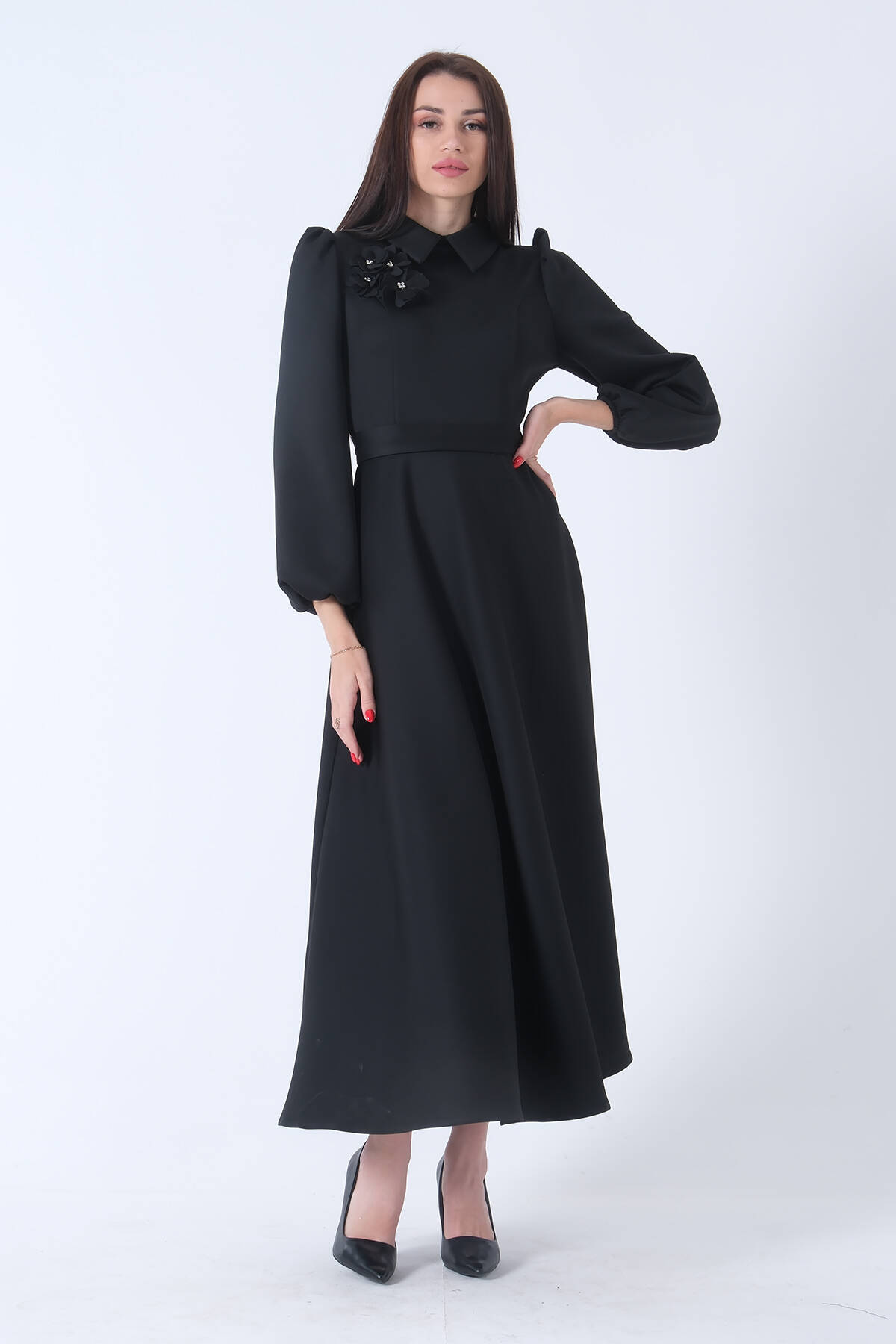 Siyah Bisiklet Yaka Kendinden Şal Detaylı Broşlu Bel Bağlamalı Elbise 4571580.01