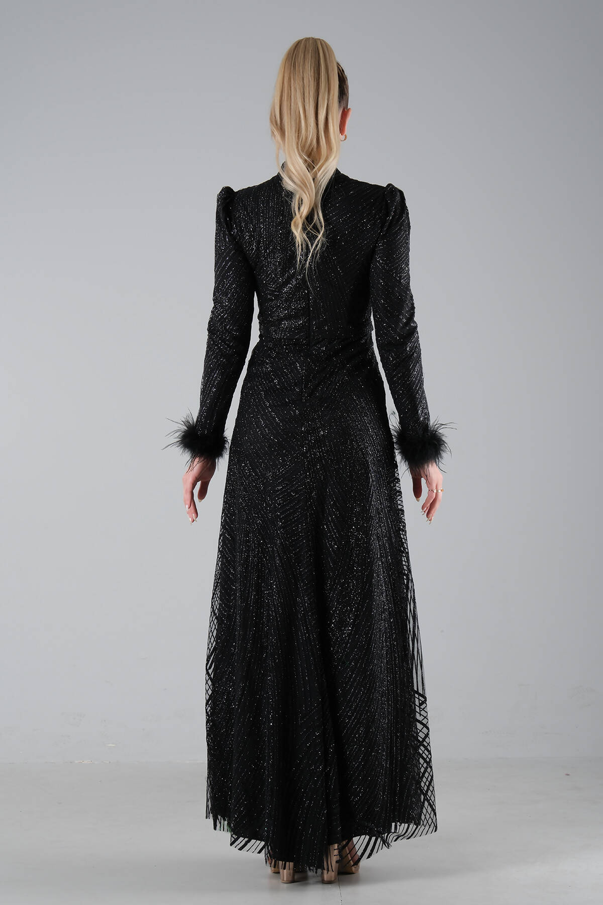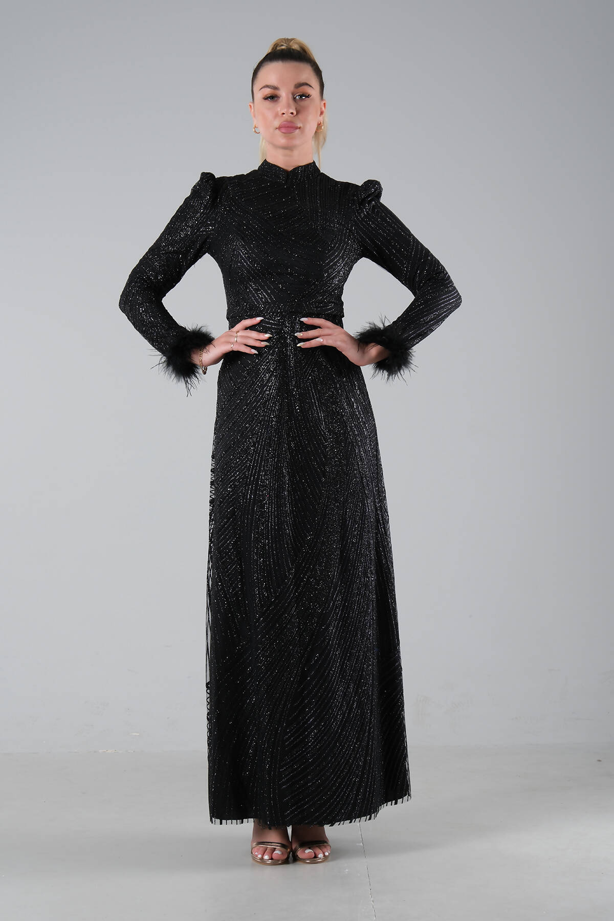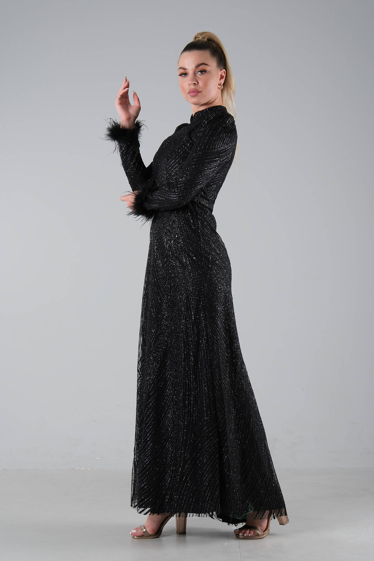 Modelin Ölçüleri : Boy: 1.80 cm / Göğüs: 88 cm / Bel: 69 cm /Basen : 94 cm Mankenin Üzerindeki Ürün 38/M Bedendir %100 Polyester Uzun Hakim Yaka Balon Kol Kol Uçları Tüylü Simli Abiye Ürün Boyu : 158 cm Stüdyo Çekimlerinde Renkler Işık Farklılıgından Dolayı Değişiklik Gösterebilir (Dikkat! Ürünlerimiz güvenlik bandı ile gönderilmektedir . Güvenlik bandı olmayan ürünlerin iadesi kabul edilmeyecektir)