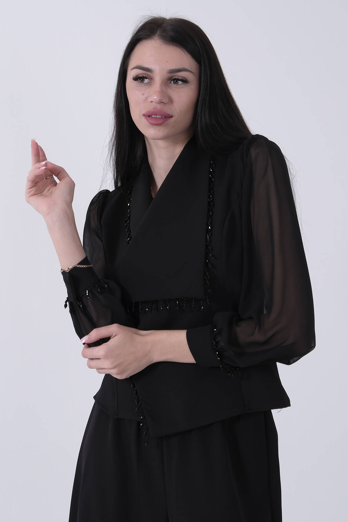 Siyah Kruvaze Yaka Taş Boncuk Detaylı Bluz 4202781.01