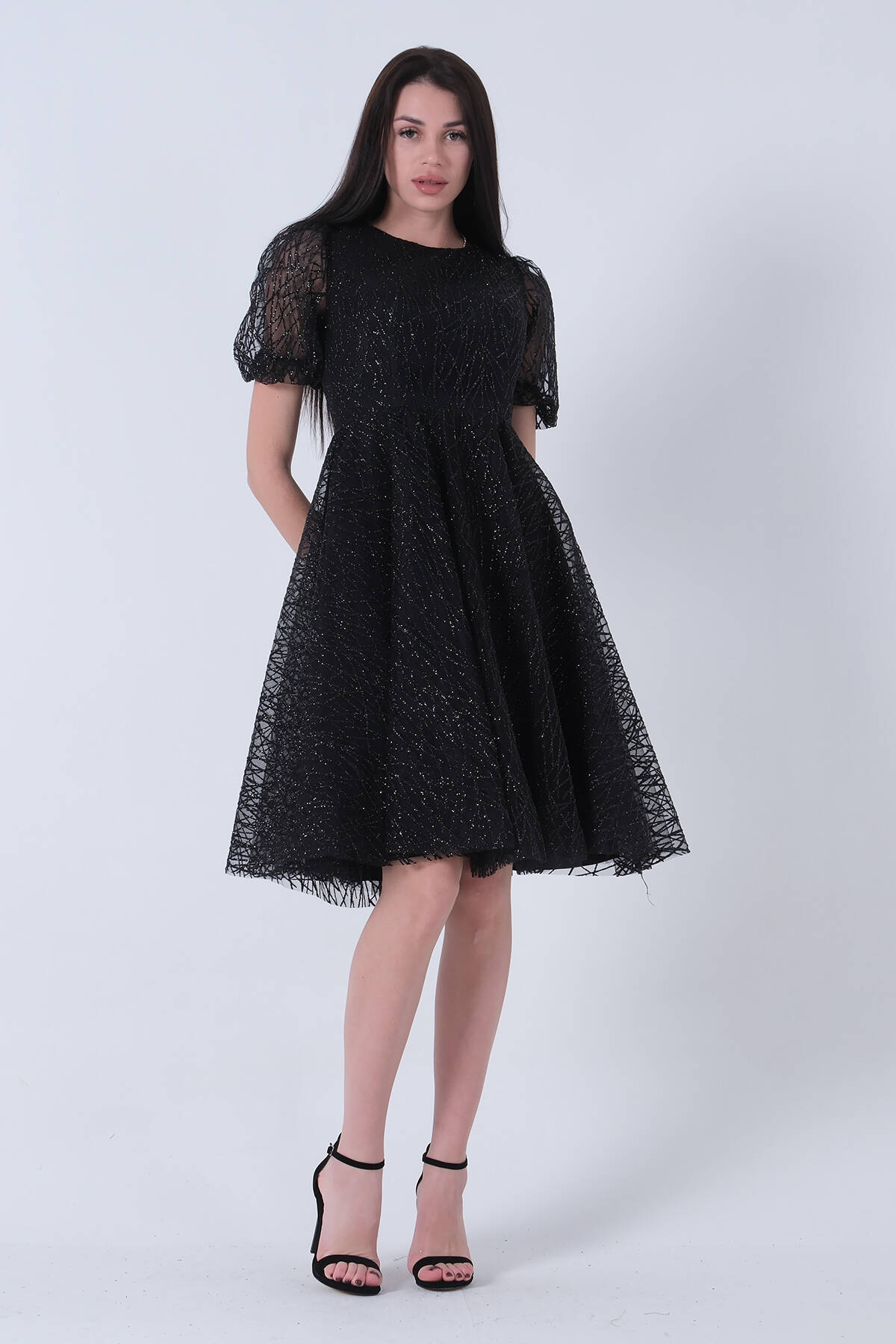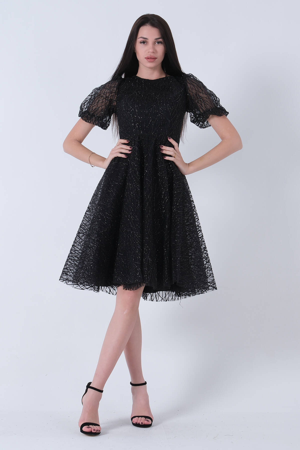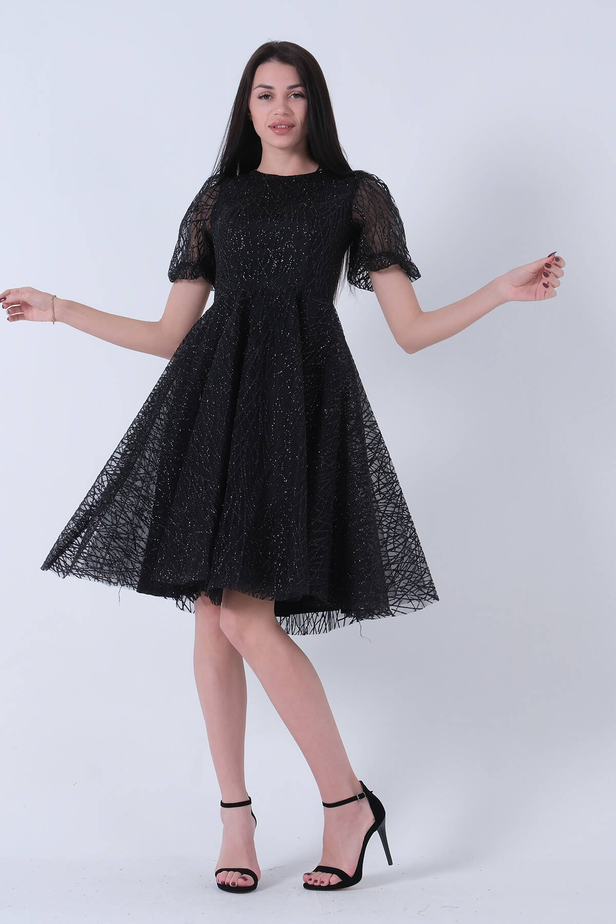 Siyah Midi Boy Kısa Yuvarlak Yaka Simli Tül Abiye Elbise 6502459.01
