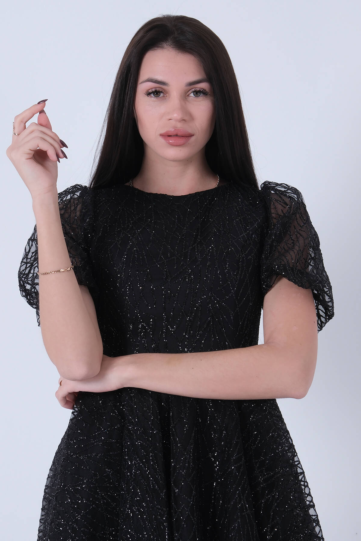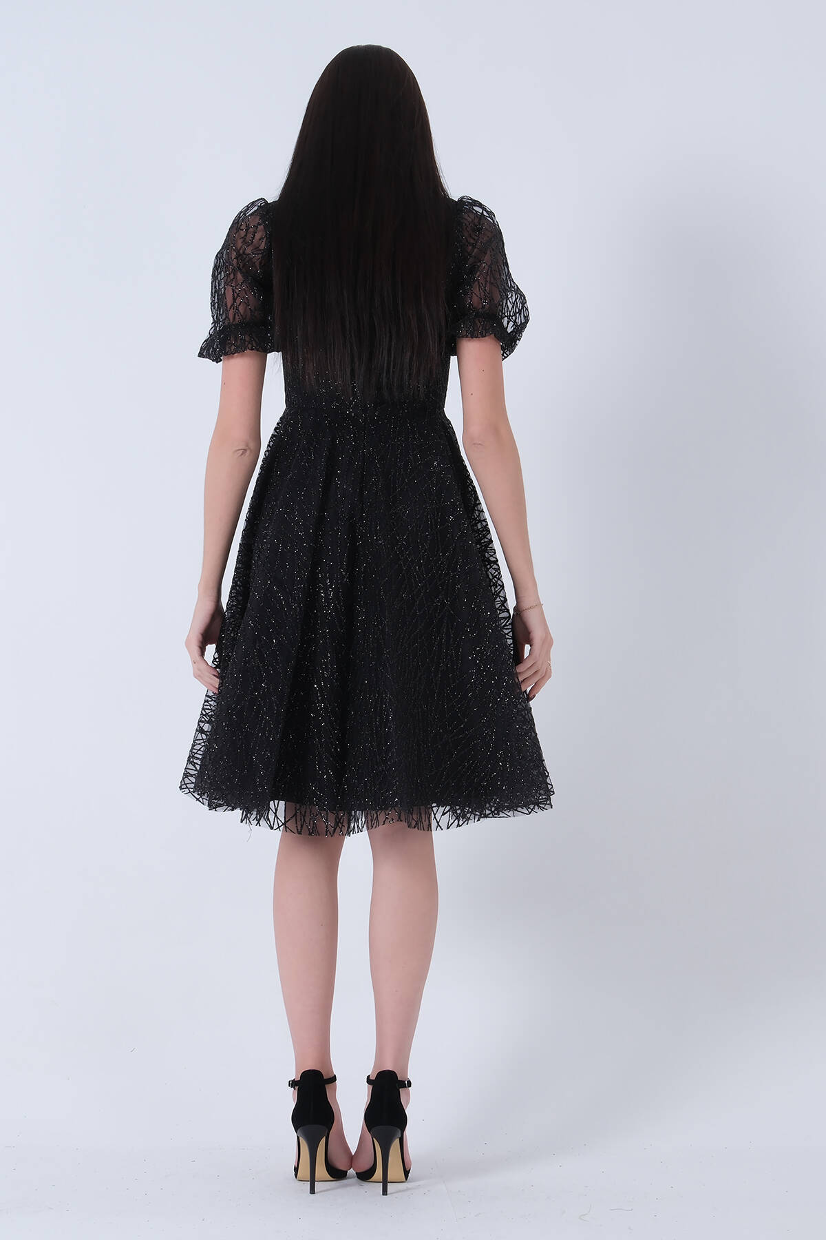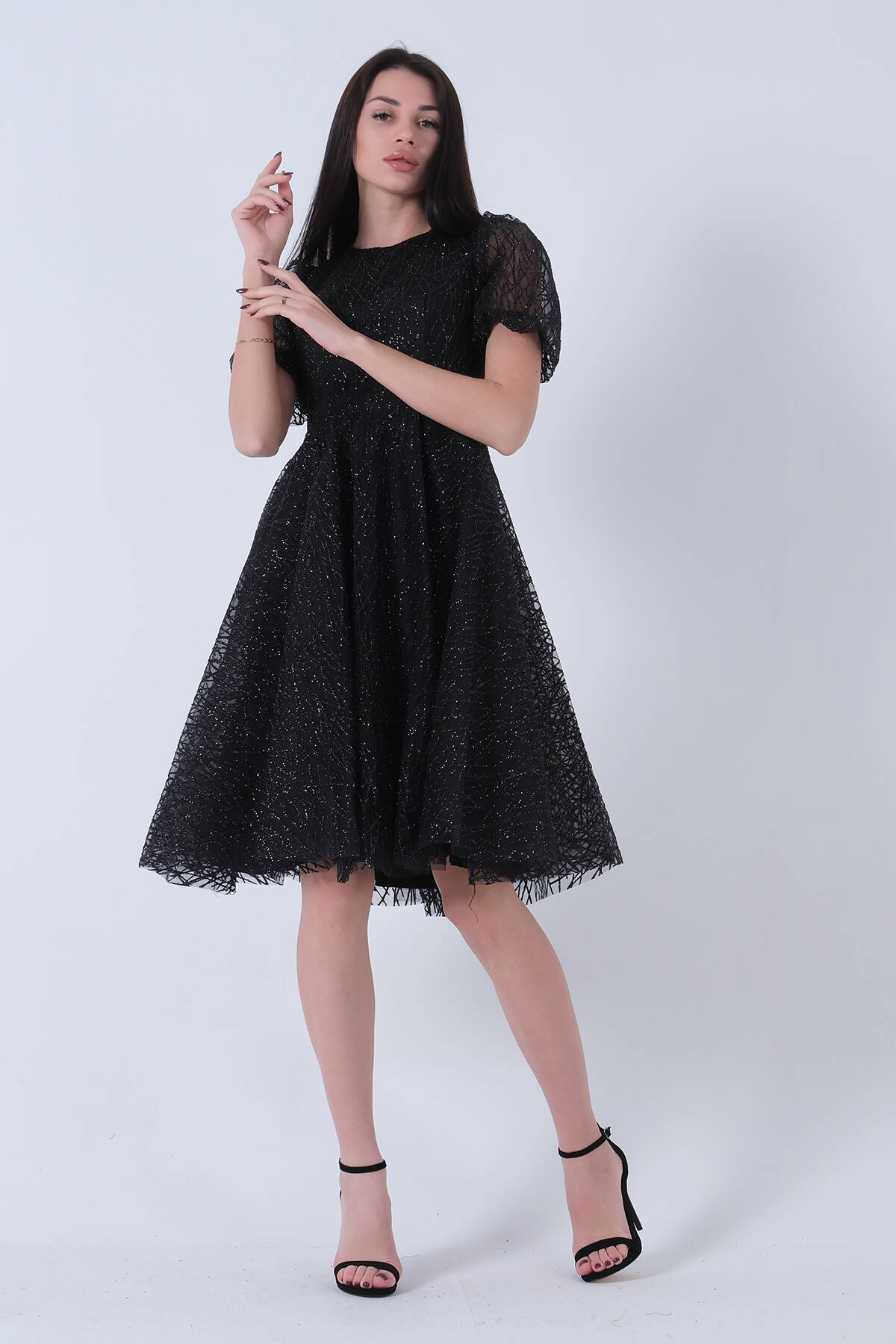 Siyah Midi Boy Kısa Yuvarlak Yaka Simli Tül Abiye Elbise 6502459.01
