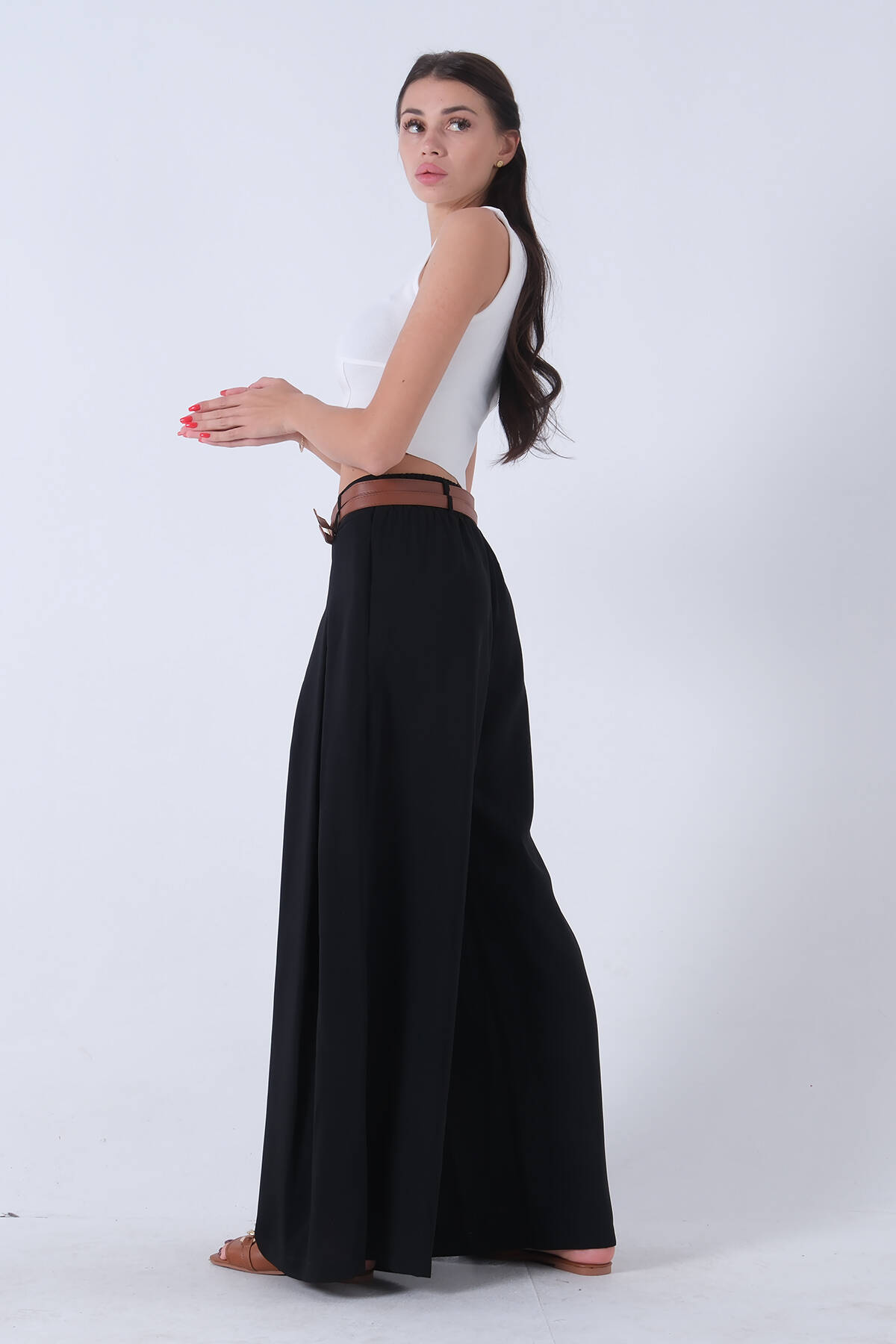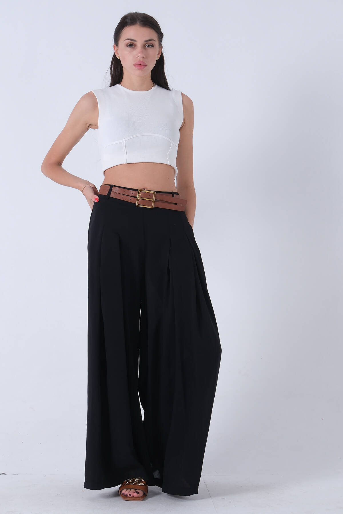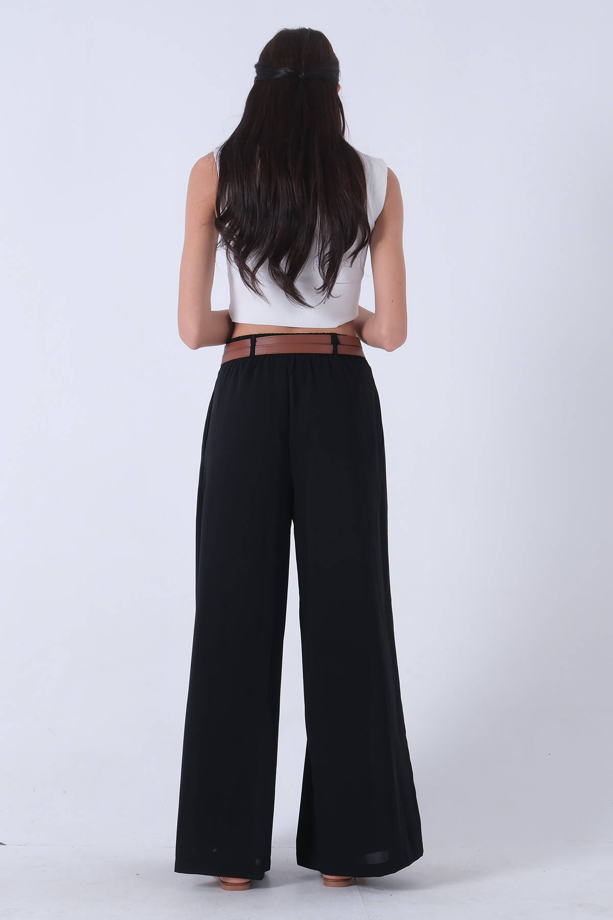 Siyah İnce Kemerli Cepsiz Bol Paça Uzun Pantolon 03030306.01