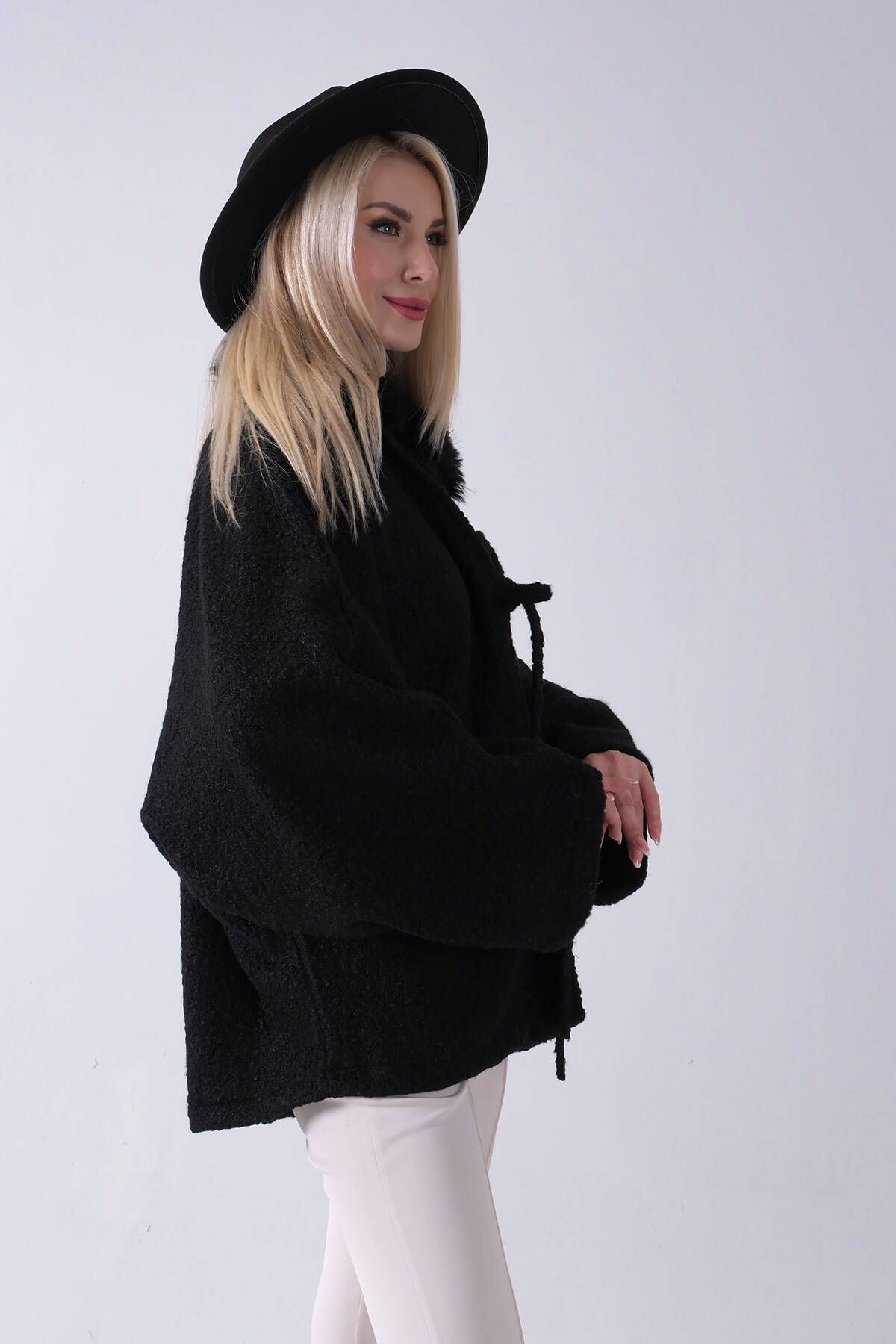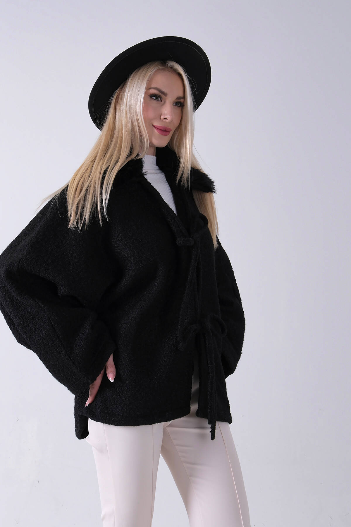 Siyah Önü Bağlama Detaylı Yakası Kürklü Panço 47122475.01